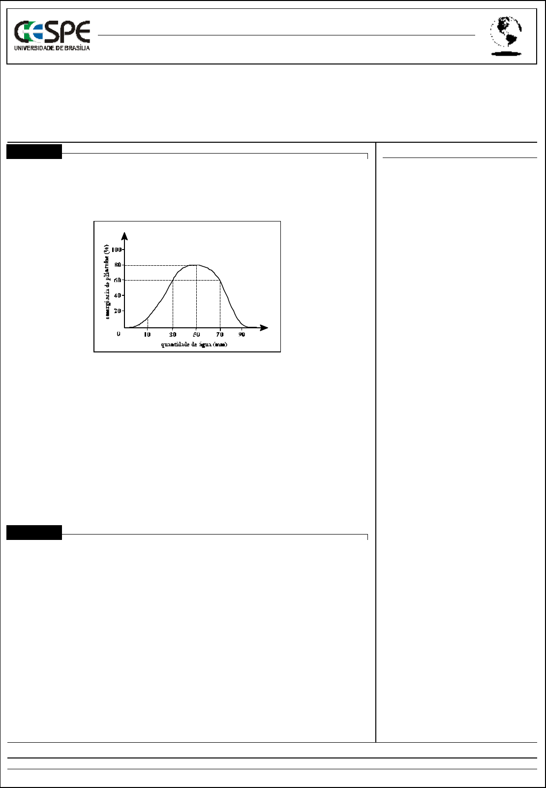 UnB / CESPE – 1.o Vestibular de 2002 2.o DIA Biologia / Química / Física Biologia – 1 / 5 É permitida a reprodução, desde que citada a fonte. PRIMEIRO VESTIBULAR DE 2002 B I O L O G I A • Nas questões de 2 a 4 e de 6 a 15, marque, de acordo com o comando de cada uma delas: itens CERTOS na coluna C; itens ERRADOS na coluna E. • Nas questões 1 e 5, marque, de acordo com o comando de cada uma delas: o algarismo das CENTENAS na coluna C; o algarismo das DEZENAS na coluna D ; o algarismo das UNIDADES na coluna U. Os algarismos das CENTENAS e das DEZENAS devem ser obrigatoriamente marcados, mesmo que sejam iguais a zero. • Use a Folha de Rascunho para as devidas marcações e, posteriormente, a Folha de Respostas. QUESTÃO 1 Um agricultor fez um teste em um solo que apresenta uma restrição à penetração de água em uma determinada profundidade, obtendo o gráfico a seguir, que relaciona o percentual das sementes semeadas que produziram plântulas com a quantidade de água aplicada (altura da lâmina de água). De posse dessas informações, o agricultor semeou milho em um terreno, aplicando a quantidade de água que possibilitou a maior taxa de emergência de plântulas. Considerando que o terreno tem a forma de um paralelogramo de lados medindo 120 m e 200 m, que formam um ângulo de 30º entre si, e que a população de plântulas tenha sido uniformemente distribuída na área, calcule uma das seguintes quantidades, desprezando, para a marcação na Folha de Respostas, a parte fracionária do resultado final obtido após efetuar todos os cálculos solicitados. (a) O número de plântulas que foram obtidas pelo agricultor, sabendo que este semeou um total de 60.000 sementes, dividindo a quantidade calculada por 100. (valor = 0,4 ponto) (b) A densidade populacional de plântulas, ou seja, o número de plântulas por m2. (valor = 0,7 ponto) (c) O volume total de água, em milhares de litros, utilizado pelo agricultor. (valor = 1,0 ponto) QUESTÃO 2 Estudos realizados no cerrado do Distrito Federal indicam que sua taxa de transpiração — ou seja, perda de água — durante a estação chuvosa é de 2,6 mm/dia e se reduz a cerca de 1,5 mm/dia durante a estação seca. Para coberturas vegetais de arroz, por exemplo, a taxa de transpiração média é de 4,3 mm/dia; na soja, a média é de 5,4 mm/dia; no girassol, 5,6 mm/dia; no eucalipto, 6,0 mm/dia. Assad e Assad. Agricultura sustentável — subsídios à elaboração da Agenda 21 brasileira. Brasília , MMA, 2000, p. 95 (com adaptações). A partir das informações do texto acima, julgue os itens a seguir. 1) A redução da transpiração entre as espécies do cerrado no período da seca é um exemplo de estratégia adaptativa. 2) A transpiração ocorre apenas através dos estômatos existentes nas folhas. 3) A transpiração ocorre à noite porque, durante o dia, os estômatos são utilizados para captar o gás carbônico da atmosfera para a fotossíntese. 4) A substituição de grande extensão de cerrado por monoculturas, como, por exemplo, soja, girassol ou eucalipto, produz um impacto positivo sobre a disponibilidade de recursos hídricos. RASCUNHO UnB / CESPE – 1.o Vestibular de 2002 2.o DIA Biologia / Química / Física Biologia – 2 / 5 É permitida a reprodução, desde que citada a fonte. QUESTÃO 3 Uma verdadeira revolução tecnológica vem acontecendo na agricultura brasileira, sem que a maioria da população tome conhecimento: a adoção do plantio direto. Nessa técnica, ao contrário do sistema convencional, faz-se a semeadura sem prévio revolvimento do solo. No plantio direto, para perturbar o mínimo possível a estrutura física e a biota do solo, mantém-se a cobertura morta de resíduos de colheitas anteriores, na forma de palhada, sobre a qual é feito o novo plantio. A diferença parece pouca, mas a simples falta de revolvimento do solo acarreta uma série de alterações no manejo das culturas e na preservação ambiental, caracterizando essa técnica como um novo sistema agrícola. Acerca das possíveis razões pelas quais o plantio direto pode contribuir para a sustentabilidade da agricultura, julgue os itens que se seguem. 1) A palhada diminui a erosão e a compactação do solo porque atenua o impacto das chuvas. 2) A exposição dos solos no sistema convencional é responsável pelo processo de mineralização dos nutrientes conhecido como lixiviação. 3) O plantio direto é uma forma de combater o assoreamento dos rios, problema que dificulta a navegação fluvial e reduz a disponibilidade de peixes e de água para o abastecimento humano, podendo ser útil para revitalizar rios como o São Francisco. 4) A proteção do solo contra a incidência direta dos raios solares, associada a uma maior disponibilidade de alimentos e à maior umidade, intensifica a atividade de fungos e bactérias próximo à superfície do solo, contribuindo para a reciclagem de nutrientes vegetais. Texto I – questões 4 e 5 O relato abaixo é resultante de trabalho desenvolvido por professores e estudantes do ensino fundamental do município de Ibirubá – RS, entre 1979 e 1980. Em meio a uma plantação de soja, os alunos instalaram lâmpadas de luz amarela de 60 W a 100 W, que ficavam acesas das 20 h às 23 h, no período de janeiro a março, quando surgiam as mariposas. Embaixo das lâmpadas, colocaram tonéis ou bacias contendo água e sabão, ou água e óleo queimado. Em todos os dispositivos, foram capturadas mariposas, e observada a redução do número de lagartas da soja, em um raio de 100 m ao redor de cada um deles. Quando os dispositivos foram deslocados, de forma a abranger toda a plantação no período de maior concentração de mariposas, conseguiu-se capturar a maioria das mariposas da lavoura, dispensando-se a aplicação de agrotóxico. QUESTÃO 4 Considerando as informações do texto I, julgue os itens seguintes. 1) O controle das mariposas deve ser feito previamente à sua transforma