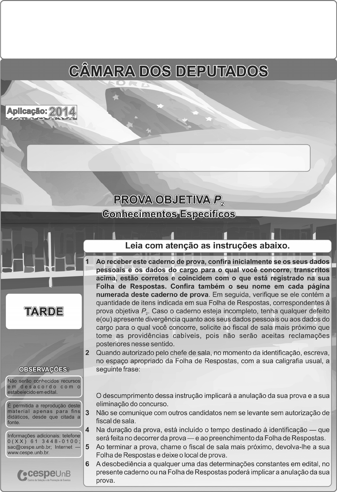 ||CAMARA14_014_27N595365|| CESPE/UnB – Câmara dos Deputados – Aplicação: 2014 De acordo com o comando a que cada um dos itens a seguir se refira, marque, na folha de respostas, para cada item: o campo designado com o código C, caso julgue o item CERTO; ou o campo designado com o código E, caso julgue o item ERRADO. A ausência de marcação ou a marcação de ambos os campos não serão apenadas, ou seja, não receberão pontuação negativa. Para as devidas marcações, use a folha de respostas, único documento válido para a correção da sua prova objetiva. PROVA OBJETIVA P2 – CONHECIMENTOS ESPECÍFICOS (ITENS COM PESO 2) Com referência ao transporte de carga no Brasil, julgue os itens a seguir. 111 Segundo parâmetros mundiais, o transporte hidroviário de carga é o modal que proporciona o menor custo de frete. O Brasil, que possui aproximadamente 28 mil km de vias navegáveis, dispõe de comboios com alta capacidade de carga, eficiência na intermodalidade e uma regulamentação clara dos usos múltiplos das águas, o que possibilita a realização de investimentos privados de maneira ordenada e de longo prazo no setor de transporte hidroviário. 112 A intensificação da intermodalidade do transporte ferroviário e portuário na exportação de soja produzida no Centro-Oeste brasileiro, visando o comércio asiático, traria uma maior eficiência para o mercado de exportação de commodities. 113 As rodovias brasileiras, responsáveis pelo transporte de grande parte da matéria-prima produzida no país, vêm recebendo investimentos do governo federal por meio de programas como o PROCREMA, que envolve obras de restauração e manutenção de rodovias federais. 114 A navegação fluvial é um importante fator de integração nacional, pois muitos municípios das regiões Nordeste e Norte do Brasil dependem totalmente desse modal de transporte para o deslocamento de pessoas e mercadorias. Nesse sentido, o governo federal criou o programa de implantação de terminais fluviais da região Nordeste e da Amazônica para a construção de terminais fluviais distribuídos nos estados do Piauí, Maranhão, Ceará, Amazonas, Pará e Rondônia. 115 Na intermodalidade, dependendo das características dos modais envolvidos, podem existir problemas relacionados às diferentes condições de carregamento e descarregamento e de transferência física das mercadorias. 116 Atualmente, o modal ferroviário predomina no transporte de carga brasileira de longas distâncias, o que tem gerado desequilíbrio na matriz energética, já que esse modal consome cerca de 90% do combustível total demandado pelo setor de transportes. Julgue os itens seguintes, relativos a logística e transporte no atual cenário brasileiro. 117 O programa de segurança rodoviária, que faz parte da logística de transporte do governo federal, visa estabelecer ações que promovam segurança aos usuários das vias e soluções para mitigar conflitos rodoviários gerados pelo tráfego local nas zonas urbanas. 118 A logística e o transporte estão interligados quando se trata de desenvolvimento e crescimento econômico, pois propiciam o suporte à competitividade e inserção do país no cenário globalizado, à reestruturação da matriz energética, à sustentabilidade ambiental e à geração de oportunidades de emprego. 119 O programa de transporte rodoviário de carga criado em 2004 pelo governo federal trata, exclusivamente, da dinamização dos acordos de transporte de carga perigosa com os países da América do Sul. 120 O planejamento de transporte urbano é destinado a atender as áreas urbanas, principalmente nas regiões metropolitanas, ao passo que o planejamento regional de transportes é voltado para a necessidade de circulação das cargas e pessoas entre cidades, estados e regiões. Acerca dos sistemas brasileiros de transporte e das políticas públicas voltadas para esse setor, julgue os itens subsequentes. 121 O Plano Nacional de Logística Portuária, instituído por meio de acordo de cooperação técnico-científica e financeira celebrado entre a Secretaria Especial de Portos e a Universidade Federal de Santa Catarina, visa, entre outros aspectos, melhorar a eficiência de gestão dos portos nacionais, tornando-os competitivos, autônomos e autossuficientes financeiramente. 122 Apesar de a Agência Nacional de Aviação Civil, criada pela Lei n.º 11.182/2005 e regulamentada pelo Decreto n.º 5.731/2006, regular a aviação civil, a infraestrutura aeronáutica e a aeroportuária, o Departamento de Aviação Civil continua responsável pela fiscalização do setor aéreo. 123 A expansão de eixos estratégicos em áreas de desenvolvimento, o aperfeiçoamento do programa de manutenção da malha viária federal e a implantação de um programa de segurança rodoviária são os principais marcos de atuação do governo federal no setor do transporte rodoviário. 124 A concessão de exploração rodoviária não consta do Plano Nacional de Logística e Transportes do governo federal, pois o programa inclui a expansão de eixos estratégicos em áreas de desenvolvimento, bem como a manutenção e segurança rodoviárias. 125 Para possibilitar a implementação do programa de expansão da malha ferroviária, o governo brasileiro ampliou as atribuições da Agencia Nacional de Transporte Terrestre, por meio da Lei n.º 11.772/2008, que outorgou a essa agência a construção da Ferrovia Norte-Sul, da Ferrovia de Integração Oeste-Leste e da Ferrovia Transcontinental. – 1 – ||CAMARA14_014_27N595365|| CESPE/UnB – Câmara dos Deputados – Aplicação: 2014 Julgue os próximos itens, relativos a transporte urbano e acessibilidade para a população brasileira. 126 É obrigação do poder público fornecer serviços públicos de transporte urbano, pois, nas concentrações urbanas, o Poder Executivo municipal ou metropolitano (áreas conturbadas), regido por legislação específica aprovada previa