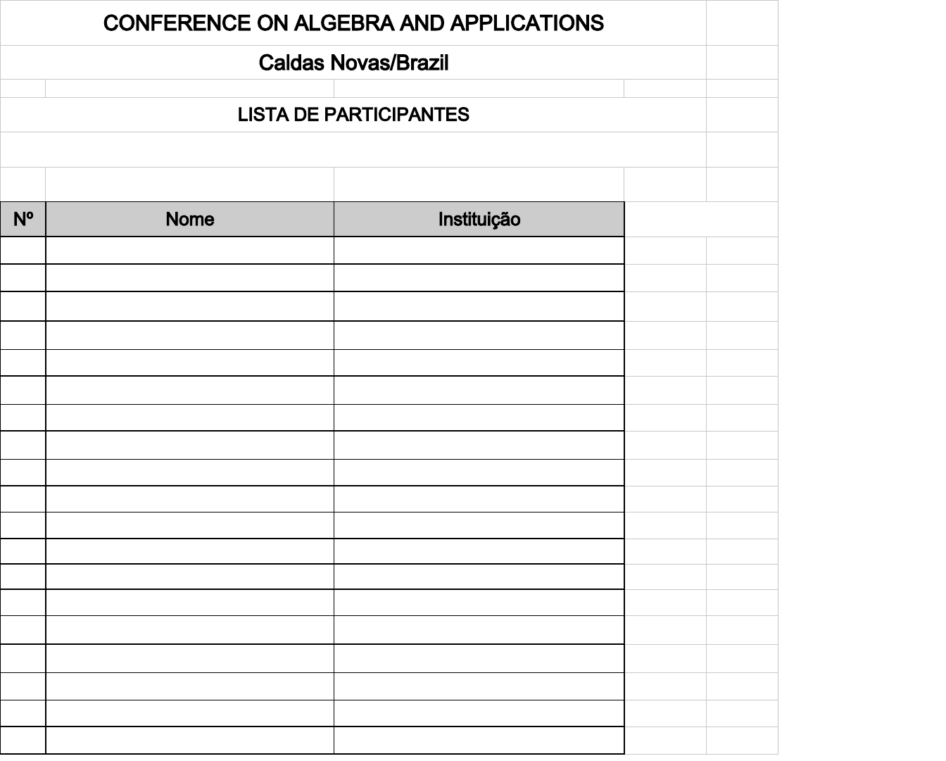 CONFERENCE ON ALGEBRA AND APPLICATIONS Caldas Novas/Brazil LISTA DE PARTICIPANTES Nº Nome Instituição 1 Adilson Antonio Berlatto UFMT 2 Adilson Gonçalves UFRJ 3 Alexander Olshanskii Vanderbilt University 4 Alexandr Kornev UFABC 5 Alexei Krassilnikov UnB 6 Ali Jaballah University of Sharjah 7 Ali Messaoudi UNESP 8 Aline G. S. Pinto UNB 9 Alveri Alves Santana UFRGS 10 Ana Cristina Vieira UFMG 11 André Luiz Martins Pereira UFRRJ 12 Ángel Del Río Universidad de Murcia 13 Antonio Calixto de Souza Filho USP 14 Antonio Giambruno Universita di Palermo 15 Antonio Paques UFRGS 16 Arnaldo Garcia IMPA 17 Aron Simis UFPE 18 Cansu Betin Atilim University 19 Claus Halkjaer Bayern – Versisherung (VKB) 20 Daniel Levcovitz USP 21 Dessislava Hristova Kochloukova UNICAMP 22 Edgard Goodaire Memorial University of Newfoundland 23 Eduardo Esteves IMPA 24 Efim Zelmanov University of California 25 Elisabete Sousa Freitas UFMS 26 Ermínia de Lourdes Campello Fanti UNESP 27 Evgeny Mukhin Univ. of North Carolina at Chapel Hill 28 Flávia Zapata** UNB 29 Flávio Ulhoa Coelho USP 30 Francisco César Polcino Milies USP 31 George Glauberman University of Chicago 32 Hemar Godinho UnB 33 Irene Naomi Nakaoka UEM 34 Irina Sviridova UnB 35 Iryna Kashuba USP 36 Ivan Shestakov USP 37 Jairo Zacarias Gonçalves USP 38 Josinalva Estacio Menezes UnB 39 Manuel Arenas Universidad de Chile 40 Marines Guerreiro UFV 41 Michael Dokuchaev USP 42 Michael Knapp UnB 43 Miguel Ferrero UFRGS 44 Noraí Romeu Rocco UnB 45 Ole Peter Smith UFG 46 Pavel Shumyatsky UNB 47 Pavel Zalesski** UNB 48 Raul Antonio Ferraz USP 49 Ricardo Nunes de Oliveira** UNB 50 Rosemary Miguel Pires UFF 51 Rostislav Grigorchuk Texas A&M University 52 Rudolf R. Maier UnB 53 Said Sidki UNB 54 Sandra Mara Alves Jorge CEFET-MG 55 Sergei Sverchkov USP 56 Shirlei Serconek UFG 57 Thierry Petit Lobao UFBA 58 Thomas W. Müller Queen Mary University of London 59 Valmecir Antonio dos Santos Bayer UFES 60 Viviane Ribeiro Thomaz da Silva UFMG 61 Vladislav Kharchenko USP 62 Volodymyr Nekrashevych Texas A&M University 63 Wagner Oliveira Cortes UFRGS 64 Yuri Bahturin Memorial University of Newfoundland 65 Zoran Sunic Texas A&M University 66 Eunice Candida Nº Nome Instituição 1 Agenor Freitas de Andrade IFG - Luziânia 2 Alda Dayana Mattos Unicamp/IMECC 3 Alexey Kuzmin USP 4 Breno Cabral de Araujo Galvão 5 Bruno Trindade Reis UFG 6 Daniele D Angeli Universidad de los Andes 7 Eduardo Rogério Fávaro UNESP 8 Emerson Ferreira de Melo UnB 9 Eunice Cândida Rodrigues UFMT 10 Faber Gomez Gonzalez Universidad de Antioquia-USP 11 Igor dos Santos Lima IMECC 12 Ilir Snopche UNB 13 Javier Sanchez Serda USP 14 John Castillo USP 15 Jordan Dale Hill USP 16 Jorge Augusto Gonçalo de Brito IFG 17 Júlio César dos Reis Unicamp 18 Laerte Bemm UFRGS 19 Luis Henrique Ramirez USP 20 Manuela da Silva Souza Unicamp 21 Marcelo Bezerra UNB 22 Raimundo de Araujo Bastos Júnior UNB 23 Silvio Sandro Alves de Macedo IFG 24 Theo Zapata** UNB 25 Thiago Castilho de Mello UNICAMP 26 Victor Hugo Lopez Solis UFG