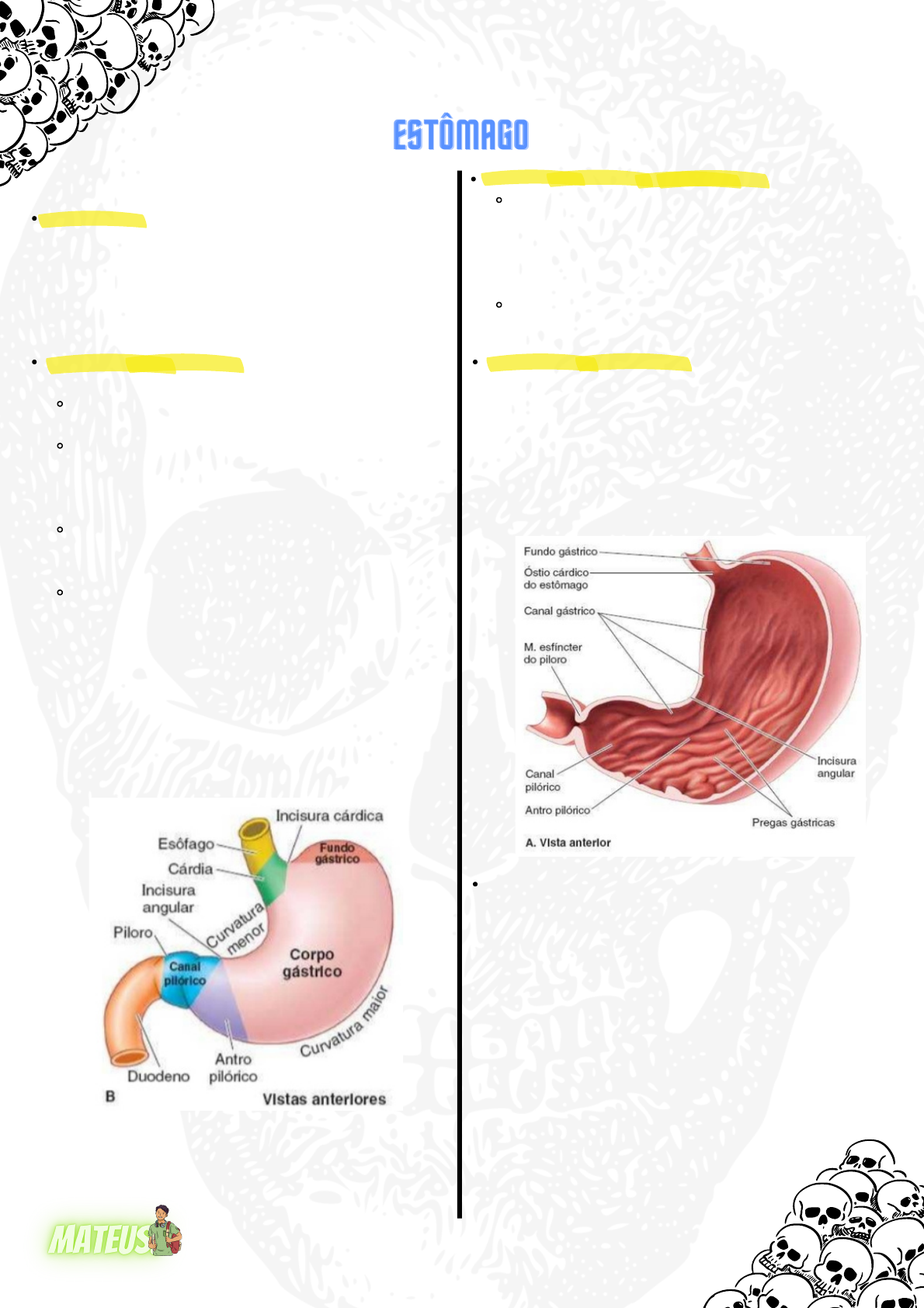 M E D I C I N A U N I F A C I S A ANATOMIA TEÓRICA IIANATOMIA TEÓRICA IIANATOMIA TEÓRICA II 121212 ESTÔMAGOESTÔMAGOESTÔMAGO RESUMO BASEADO NO LIVRO ANATOMIA ORIENTADA PARA CLÍNICA MOORE 7ED ESTÔMAGO: É A PARTE EXPANDIDA DO SISTEMA DIGESTÓRIO ENTRE O ESÔFAGO E O INTESTINO DELGADO. É ESPECIALIZADO PARA O ACÚMULO DO ALIMENTO INGERIDO, QUE ELE PREPARA QUÍMICA E MECANICAMENTE PARA A DIGESTÃO E PASSAGEM PARA O DUODENO. S.DIGESTÓRIO - CAP 02 ANATOMIA DO ESTÔMAGO: O ESTÔMAGO TEM QUATRO PARTES 1-CÁRDIA: A PARTE QUE CIRCUNDA O ÓSTIO CÁRDICO, A ABERTURA SUPERIOR DO ESTÔMAGO. 2-FUNDO GÁSTRICO: A PARTE SUPERIOR DILATADA QUE ESTÁ RELACIONADA COM A CÚPULA ESQUERDA DO DIAFRAGMA, LIMITADA INFERIORMENTE PELO PLANO HORIZONTAL DO ÓSTIO CÁRDICO. 3-CORPO GÁSTRICO: A PARTE PRINCIPAL DO ESTÔMAGO, ENTRE O FUNDO GÁSTRICO E O ANTRO PILÓRICO. 4-PARTE PILÓRICA: A REGIÃO AFUNILADA DE SAÍDA DO ESTÔMAGO; SUA PARTE MAIS LARGA, O ANTRO PILÓRICO, LEVA AO CANAL PILÓRICO, SUA PARTE MAIS ESTREITA. O PILORO É A REGIÃO ESFINCTERIANA DISTAL DA PARTE PILÓRICA. É UM ESPESSAMENTO ACENTUADO DA CAMADA CIRCULAR DE MÚSCULO LISO QUE CONTROLA A SAÍDA DO CONTEÚDO GÁSTRICO ATRAVÉS DO ÓSTIO PILÓRICO PARA O DUODENO. O ESTÔMAGO TEM DUAS CURVATURAS: 1-CURVATURA MENOR: FORMA A MARGEM DIREITA CÔNCAVA MAIS CURTA DO ESTÔMAGO. A INCISURA ANGULAR, PARTE INFERIOR DA CURVATURA, INDICA A JUNÇÃO DO CORPO GÁSTRICO COM A PARTE PILÓRICA DO ESTÔMAGO. 2-CURVATURA MAIOR: FORMA A MARGEM CONVEXA MAIS LONGA DO ESTÔMAGO. INTERIOR DO ESTÔMAGO: A SUPERFÍCIE LISA DA MUCOSA GÁSTRICA É CASTANHO-AVERMELHADA, EXCETO NA PARTE PILÓRICA, ONDE É RÓSEA. QUANDO CONTRAÍDA, A MUCOSA GÁSTRICA FORMA ESTRIAS LONGITUDINAIS DENOMINADAS PREGAS GÁSTRICAS. DURANTE A DEGLUTIÇÃO, FORMA-SE UM SULCO OU CANAL GÁSTRICO TEMPORÁRIO ENTRE AS PREGAS LONGITUDINAIS AO LONGO DA CURVATURA MENOR. O ESTÔMAGO É COBERTO POR PERITÔNIO, EXCETO NOS LOCAIS EM QUE HÁ VASOS SANGUÍNEOS AO LONGO DE SUAS CURVATURAS E EM UMA PEQUENA ÁREA POSTERIOR AO ÓSTIO CARDÍACO. M E D I C I N A U N I F A C I S A ANATOMIA TEÓRICA IIANATOMIA TEÓRICA IIANATOMIA TEÓRICA II 131313 ESTÔMAGOESTÔMAGOESTÔMAGO RESUMO BASEADO NO LIVRO ANATOMIA ORIENTADA PARA CLÍNICA MOORE 7ED VASOS E NERVOS DO ESTÔMAGO: A ABUNDANTE IRRIGAÇÃO ARTERIAL DO ESTÔMAGO TEM ORIGEM NO TRONCO CELÍACO E EM SEUS RAMOS. A MAIOR PARTE DO SANGUE PROVÉM DE ANASTOMOSES FORMADAS AO LONGO DA CURVATURA MENOR PELAS ARTÉRIAS GÁSTRICAS DIREITA E ESQUERDA, E AO LONGO DA CURVATURA MAIOR PELAS ARTÉRIAS GASTROMENTAIS DIREITA E ESQUERDA. O FUNDO GÁSTRICO E A PARTE SUPERIOR DO CORPO GÁSTRICO RECEBEM SANGUE DAS ARTÉRIAS GÁSTRICAS CURTAS E POSTERIORES. S.DIGESTÓRIO - CAP 02 AS VEIAS GÁSTRICAS ACOMPANHAM AS ARTÉRIAS EM RELAÇÃO À POSIÇÃO E AO TRAJETO. AS VEIAS GÁSTRICAS DIREITA E ESQUERDA DRENAM PARA A VEIA PORTA. AS VEIAS GÁSTRICAS CURTAS E AS VEIAS GASTROMENTAIS ESQUERDAS DRENAM PARA A VEIA ESPLÊNICA, QUE SE UNE À VEIA MESENTÉRICA SUPERIOR (VMS) PARA FORMAR A VEIA PORTA. UMA VEIA PRÉ- PILÓRICA ASCENDE SOBRE O PILORO ATÉ A VEIA GÁSTRICA DIREITA. COMO ESSA VEIA É FACILMENTE VISÍVEL EM PESSOAS VIVAS, OS CIRURGIÕES A UTILIZAM PARA IDENTIFICAÇÃO DO PILORO.