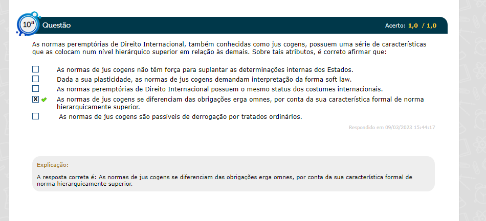 As normas peremptórias de Direito Internacional, também conhecidas como jus cogens, possuem uma série de características que as colocam num nível hierárquico superior em relação às demais. Sobre tais atributos, é correto afirmar que: As normas de jus cogens não têm força para suplantar as determinações internas dos Estados. Dada a sua plasticidade, as normas de jus cogens demandam interpretação da forma soft law. As normas peremptórias de Direito Internacional possuem mesmo status dos costumes internacionais. As normas de jus cogens se diferenciam das obrigações erga omnes, por conta da sua característica formal de norma hierarquicamente superior. As normas de jus cogens são passíveis de derrogação por tratados.
