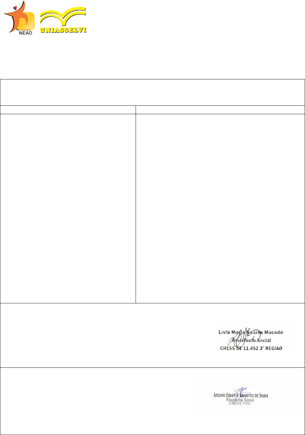 DIÁRIO DE CAMPO ESTÁGIO III Diário de Campo n°5 Campo de estágio: CENTRO DE REFERÊNCIA DA ASSISTÊNCIA SOCIAL (CRAS II DAMIÃO JORGE NETO) Tutora/Orientadora pedagógica Local:ANTÔNIO ERIVAN RODRIGUES MEDEIROS DE SOUSA CRESS Nº: 9492/ CE Região: 3° Supervisora de Campo: LIVIA MARIA SOARES MACÊDO CRESS Nº: 11452/ CE Região: 3° Estagiária:SABRINE RODRIGUES DE MORAES Matrícula: 2543909 Atividade: Requerimento de benefício eventual auxílio passagem. Data: 17/10/2022 Horas: 4 horas ATIVIDADES/AÇÕES REALIZADAS ANÁLISE CRÍTICA DA ATIVIDADE 1) O que foi feito? Requerimento de benefício eventual auxílio passagem. Reflexão, análise e fundamentação teórica Considerando que a oferta de Benefícios Eventuais deve ocorrer, preferencialmente, no contexto do trabalho social com famílias, a concessão deve ser pautada pela escuta qualificada, verificação do atendimento de critérios definidos em lei e registro em instrumental já adotado pelos serviços, tais como Prontuário SUAS, relatório estruturado, formulário de cadastro, entre outros. (MDS, 2018, p.39). Referências: BRASIL. Ministério do Desenvolvimento Social. Benefícios Eventuais no SUAS: Orientações técnicas. Brasília, 2018 OBSERVAÇÃO DO SUPERVISOR: _____________________________ Supervisor de Campo OBSERVAÇÃO DO TUTOR ORIENTADOR LOCAL: _______________________________ Professor-Tutor Externo/Orientador pedagógico Local