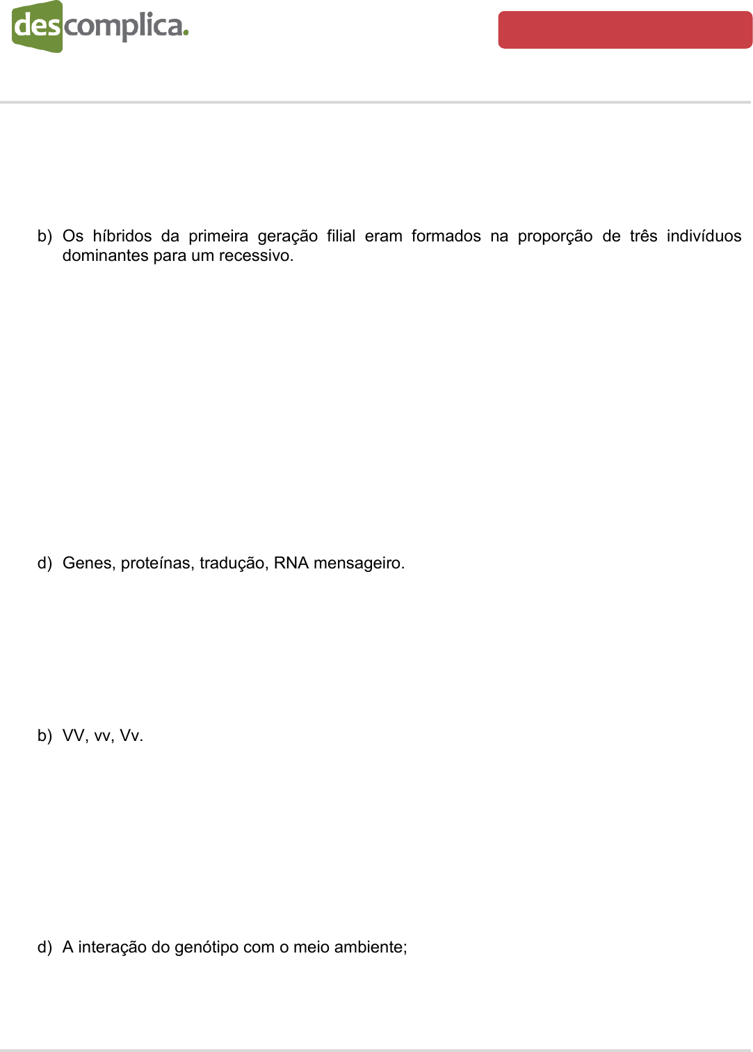 Este conteúdo pertence ao Descomplica. É vedada a cópia ou a reprodução não autorizada previamente e por escrito. Todos os direitos reservados. Material de apoio do Extensivo Biologia Professor: Alexandre Bandeira Exercícios Conceitos Básicos em Genética 1. Sobre os experimentos do Mendel, podemos afirmar: a) A geração parental, que iniciava o experimento, era formada por indivíduos idênticos entre si. b) Os híbridos da primeira geração filial eram formados na proporção de três indivíduos dominantes para um recessivo. c) A geração F2 era obtida do cruzamento de híbridos, apresentando somente indivíduos recessivos. d) A geração parental apresentava somente indivíduos dominantes híbridos puros. e) A autofecundação de F1 produzia a geração F2, que apresentava a proporção característica de 3 dominantes para 1 recessivo. 2. (Fatec) Analise o texto abaixo e assinale a alternativa que contém os termos que preenchem corretamente os espaços (I), (II), (III) e (IV). “O controle das características fenotípicas dos seres vivos é feito pelos (I) através do comando da síntese de (II). No processo de elaboração de uma proteína ocorrem as etapas de transcrição e (III). A primeira etapa forma a molécula de (IV) contendo a mensagem genética e a segunda etapa é responsável pela produção da proteína.” a) Ribossomos, proteínas, tradução, RNA transportador. b) Ribossomos, aminoácidos, duplicação, RNA ribossômico. c) Genes, aminoácidos, duplicação, RNA mensageiro. d) Genes, proteínas, tradução, RNA mensageiro. e) Genes, aminoácidos, cópia, RNA ribossômico. 3. (UNIFESP) Uma planta A e outra B, com ervilhas amarelas e de genótipos desconhecidos, foram cruzadas com plantas C que produzem ervilhas verdes. O cruzamento A x C originou 100% de plantas com ervilhas amarelas e o cruzamento B x C originou 50% de plantas com ervilhas amarelas e 50% verdes. Os genótipos das plantas A, B e C são, respectivamente, a) Vv, vv, VV. b) VV, vv, Vv. c) VV, Vv, vv. d) vv, VV, Vv. e) vv, Vv, VV 4. No milho, um gene produz grãos vermelhos se a espiga for exposta à luz, mas, se as espigas ficarem cobertas, os grãos permanecem brancos. O fenômeno descrito ilustra: a) A atuação do meio das mutações; b) O processo da seleção natural; c) A influência do ambiente na alteração do genótipo; d) A interação do genótipo com o meio ambiente; e) A transmissão dos caracteres adquiridos. Highlight Este conteúdo pertence ao Descomplica. É vedada a cópia ou a reprodução não autorizada previamente e por escrito. Todos os direitos reservados. Material de apoio do Extensivo Biologia Professor: Alexandre Bandeira 5. (Fuvest) Dois genes alelos atuam na determinação da cor das sementes de uma planta: A, dominante, determina a cor púrpura e a, recessivo, determina a cor amarela. A tabela abaixo apresenta resultados de vários cruzamentos feitos com diversas linhagens dessa planta: Apresentam genótipo Aa as linhagens: a) I e II. b) II e III. c) II e IV. d) I e IV. e) III e IV. 6. (Fuvest) A fenilcetonúria é uma doença com herança autossômica recessiva. Em certa comunidade européia, uma em cada vinte pessoas com fenótipo normal é heterozigótica quanto ao gene que determina a fenilcetonúria. Em oitocentos casamentos ocorridos entre membros sadios dessa comunidade, qual o número esperado de casamentos com risco de gerar crianças fenilcetonúricas? a) 2 b) 8 c) 16 d) 40 e) 80 7. (Enem) Em um experimento, preparou-se um conjunto de plantas por técnica de clonagem a partir de uma planta original que apresentava folhas verdes. Esse conjunto foi dividido em dois grupos, que foram tratados de maneira idêntica, com exceção das condições de iluminação, sendo um grupo exposto a ciclos de iluminação solar natural e outro mantido no escuro. Após alguns dias, observou-se que o grupo exposto à luz apresentava folhas verdes como a planta original e o grupo cultivado no escuro apresentava folhas amareladas. Ao final do experimento, os dois grupos de plantas apresentaram: a) Os genótipos e os fenótipos idênticos. b) Os genótipos idênticos e os fenótipos diferentes. c) Diferenças nos genótipos e fenótipos d) O mesmo fenótipo e apenas dois genótipos diferentes. e) O mesmo fenótipo e grande variedade de genótipos. Highlight Highlight Highlight Este conteúdo pertence ao Descomplica. É vedada a cópia ou a reprodução não autorizada previamente e por escrito. Todos os direitos reservados. Material de apoio do Extensivo Biologia Professor: Alexandre Bandeira 8. (Unicamp-SP) Em experimentos feitos no início do século, dois pesquisadores retiraram os ovários de uma cobaia albina e implantaram-lhe um ovário obtido de uma cobaia preta. Mais tarde, o animal foi cruzado com um macho albino e deu origem a uma prole toda preta. a) Sabendo que o albinismo é característica recessiva, como você explica esse resultado? b) Indique os genótipos da fêmea preta e da prole. c) Se fosse possível implantar os pêlos da fêmea preta na fêmea albina, em vez de transplantarem o ovário, o resultado seria o mesmo? Justifique.
