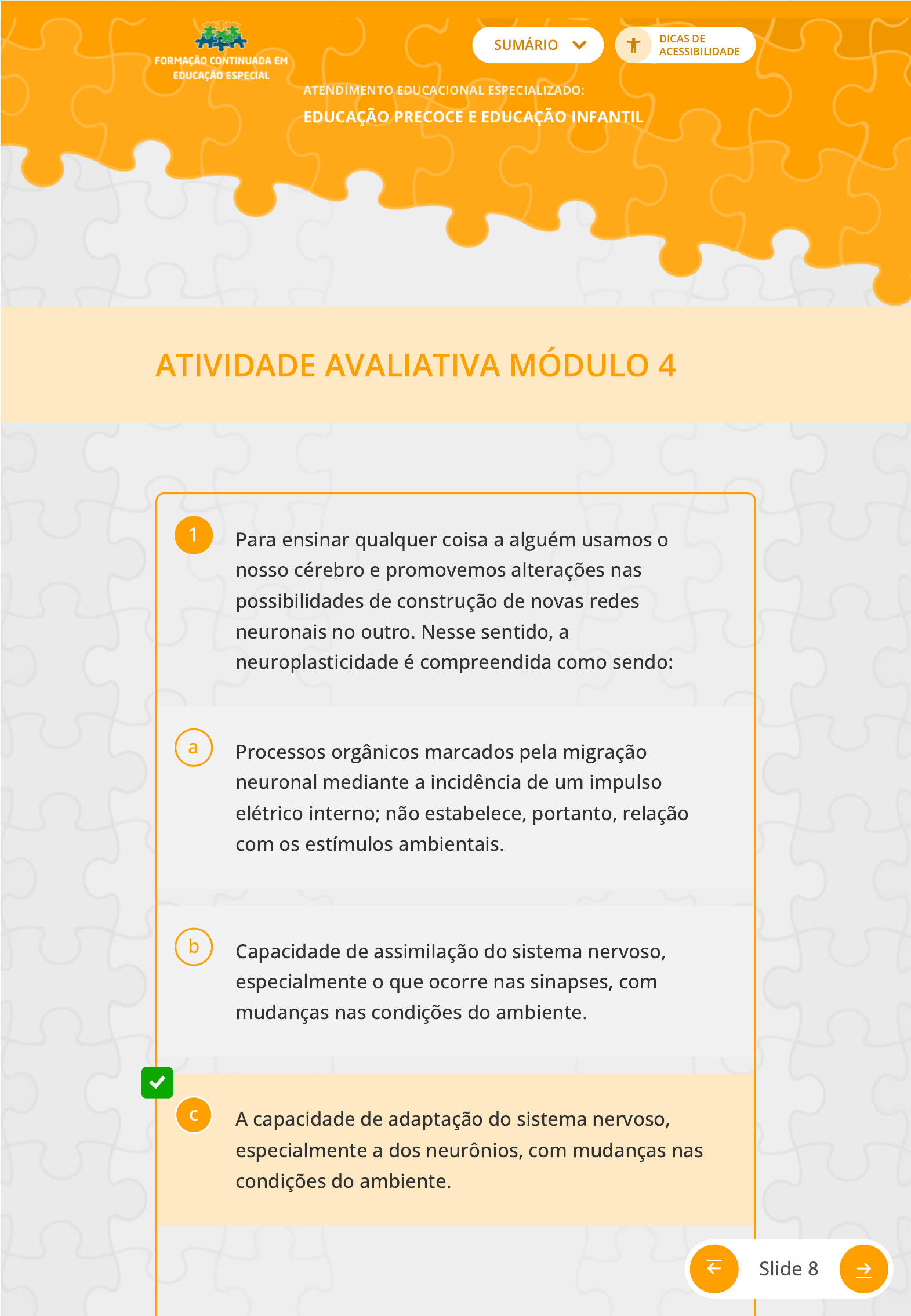 SUMÁRIO ATENDIMENTO EDUCACIONAL ESPECIALIZADO: EDUCAÇÃO PRECOCE E EDUCAÇÃO INFANTIL DICAS DE ACESSIBILIDADE ATIVIDADE AVALIATIVA MÓDULO 4 Para ensinar qualquer coisa a alguém usamos o nosso cérebro e promovemos alterações nas possibilidades de construção de novas redes neuronais no outro. Nesse sentido, a neuroplasticidade é compreendida como sendo: 1 Processos orgânicos marcados pela migração neuronal mediante a incidência de um impulso elétrico interno; não estabelece, portanto, relação com os estímulos ambientais. a Capacidade de assimilação do sistema nervoso, especialmente o que ocorre nas sinapses, com mudanças nas condições do ambiente. b A capacidade de adaptação do sistema nervoso, especialmente a dos neurônios, com mudanças nas condições do ambiente. c Slide 8 https://avamec.mec.gov.br/ava-mec-ws/instituicao/semesp/conteudo/modulo/4610/mod4/uni1/slide09.html https://avamec.mec.gov.br/ava-mec-ws/instituicao/semesp/conteudo/modulo/4610/mod4/uni1/slide07.html O papel elementar do ambiente físico no estabelecimento das características �siológicas e psicológicas do indivíduo. d A sede do pensamento, da razão e do processamento das nossas emoções é o: 2 Encéfalo, também conhecido como cérebro. a Sistema límbico.b Cerebelo.c Lobo frontal do cérebro.d O neurologista Pierre Paul Broca (1824-1880) provou a relação entre o cérebro e o comportamento em 1861, quando evidenciou que uma das funções da linguagem se processa no: 3 Hemisfério esquerdo do cérebro. a Hemisfério direito do cérebro.b Slide 8 https://avamec.mec.gov.br/ava-mec-ws/instituicao/semesp/conteudo/modulo/4610/mod4/uni1/slide09.html https://avamec.mec.gov.br/ava-mec-ws/instituicao/semesp/conteudo/modulo/4610/mod4/uni1/slide07.html Sistema límbico.c Lobo parietal do cérebro.d A perspectiva localizacionista, em que o funcionamento do cérebro ocorre de forma isolada e especí�ca, foi criticada por Luria e sua equipe. Eles propuseram a perspectiva denominada de: 4 Sistema sistêmico, baseado em dois princípios centrais das funções corticais: plasticidade e sistemas funcionais especí�cos e dinâmicos. a Sistema funcional, baseado em três princípios centrais das funções corticais: plasticidade; sistemas funcionais dinâmicos e perspectiva a partir da mente humana. b Sistemas com áreas especializadas dos lobos cerebrais, que atuam de forma isolada e complexa. c A proposta do sistema funcional do cérebro não nega que o cérebro está dividido em cinco lobos cerebrais, sendo quatro mais comuns de serem abordados na neuropedagogia, com ligações entre si, sendo que as denominações de cada lóbulo são decorrentes dos ossos do crânio. A respeito da especialidade de cada um dos lóbulos cerebrais, é correto o que se a�rma em: 5 Slide 8 https://avamec.mec.gov.br/ava-mec-ws/instituicao/semesp/conteudo/modulo/4610/mod4/uni1/slide09.html https://avamec.mec.gov.br/ava-mec-ws/instituicao/semesp/conteudo/modulo/4610/mod4/uni1/slide07.html Refazer Atividade Respondidas 5 de 5 questões I - O lobo frontal é responsável pelas funções executivas, autocontrole, inibição, pensamento, memória, planejamento e comportamentos intencionais; II - O parietal está voltado para recepção e processamento das informações sensoriais do organismo como dor, calor e frio, bem como a percepção espacial; III – O occipital processa a sensação visual por meio de dados relacionados à cor, forma e movimento; IV - O lobo temporal é especializado em processar frequência sonoras, linguagens, estímulos auditivos e noção de equilíbrio do corpo no espaço. Estão corretas as assertivas: Apenas os itens II e IV estão corretos.a Apenas os itens I e III estão corretos.b Apenas os itens II, III e IV estão corretos.c Todas as alternativas estão corretas. d Parabéns por buscar formação e não se eximir de sua responsabilidade! Você �nalizou o Curso de Atendimento Educacional Slide 8 https://avamec.mec.gov.br/ava-mec-ws/instituicao/semesp/conteudo/modulo/4610/mod4/uni1/slide09.html https://avamec.mec.gov.br/ava-mec-ws/instituicao/semesp/conteudo/modulo/4610/mod4/uni1/slide07.html