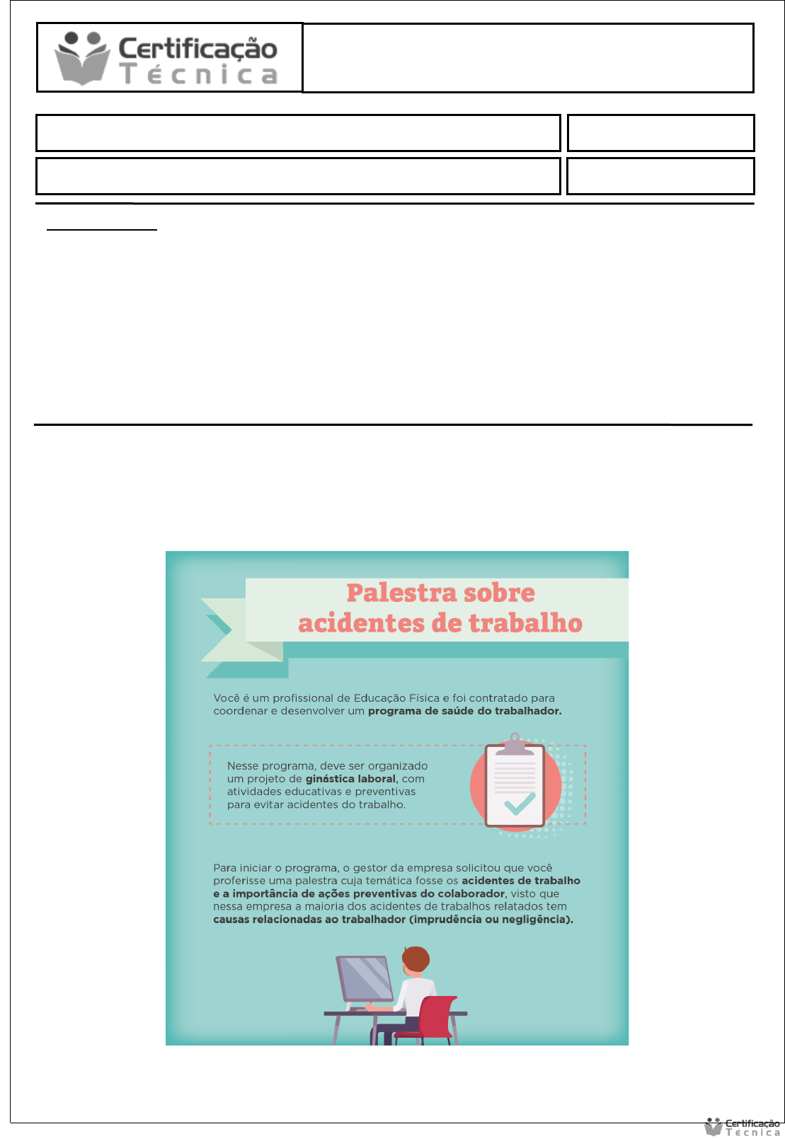 Higiene e Segurança do Trabalho Data: . Aluno (a): Avaliação Pratica INSTRUÇÕES: · Esta Avaliação contém 1 (uma) questão, totalizando 10 (dez) pontos; · Baixe o arquivo disponível com a Atividade Pratica; · Você deve preencher dos dados no Cabeçalho para sua identificação: · Nome / Data de entrega. · As respostas devem ser digitadas abaixo de cada pergunta; · Ao terminar grave o arquivo com o nome Atividade Prática; · Quando solicitado · Envio o arquivo pelo sistema no local indicado; · Em caso de dúvidas consulte o seu Tutor. Os acidentes de trabalho ainda são muito comuns, principalmente no Brasil, que apresenta um dos maiores índices em nível mundial e preocupa trabalhadores, gestores e governantes. Os acidentes podem ter diversas causas, entre elas a negligência ou a atitude imprudente do colaborador. Analise a seguinte situação: Apresente quais os principais tópicos que você considera imprescindível abordar na palestra para evitar acidentes de trabalho com causas atribuídas ao colaborador. Resposta: Ações preventivas que podem fazer a diferença: 1. Desenvolver uma rotina de manutenções das máquinas e equipamentos Ainda existem empresas que investem pouco em manutenção preventiva das máquinas e equipamentos. O que poucos param para colocar “na ponta do lápis” é que atuar somente quando ocorre uma quebra ou um defeito acaba por reduzir a produtividade de toda a operação. Ao mesmo tempo, a falta de manutenção preventiva aumenta muito o risco de acidentes, já que o trabalhador, ao tentar resolver o problema, pode se expor a situações que comprometem sua integridade física. Assim, ao desenvolver uma rotina de manutenções regulares, as indústrias garantem maior segurança dos trabalhadores, redução do custo com reparos fora de hora e aumento da produtividade. É importante lembrar que, para realizar uma manutenção preventiva com segurança, deve-se tomar alguns cuidados, como isolar e sinalizar bem a área que está em manutenção, como no exemplo: um eletricista e dois mecânicos de manutenção vão executar o alinhamento de um eixo de motor de uma grande máquina. O eletricista se desloca ao painel elétrico da máquina e desliga a seccionadora/comutadora, insere a garra com o gancho de 6,5 mm na manopla travando-a com um cadeado vermelho e uma etiqueta. Os dois mecânicos fazem o mesmo com os cadeados azuis e suas respectivas etiquetas. Acionam a máquina para se certificarem que o equipamento está realmente desligado e comunicam aos colegas que vão fazer a manutenção desse equipamento. Após esse procedimento, os técnicos podem fazer a manutenção tranquilamente e com segurança, no que diz respeito ao perigo de religamento do equipamento por outra pessoa. 2. Manter um ambiente de trabalho seguro O conjunto de medidas preventivas é o melhor caminho para proteger a equipe de acidentes a que todos estão sujeitos diariamente. Os EPCs são dispositivos utilizados no ambiente de trabalho com o objetivo de proteger os trabalhadores dos riscos coletivos existentes nos processos de industriais. Entre os principais EPCs estão os cones e faixas de segurança, placas de sinalização, sensores de presença, sirenes e alertas luminosos, cadeados e garras de bloqueio, bloqueios de disjuntores, entre outros. 3. Oferecer EPIs sempre que necessário para garantir a segurança da atividade É responsabilidade da empresa fornecer aos funcionários os EPIs necessários para desempenhar cada atividade. É fundamental que o equipamento tenha o Certificado de Aprovação (conhecido como CA) exigido pelo Ministério do Trabalho (MTE). O CA garante a procedência do material, qualidade e durabilidade, de acordo com a norma NR-6. A escolha do EPI deve estar de acordo com o grau de proteção exigido para a função inerente ao risco do equipamento. 4. Isolar os riscos do chão de fábrica e sinalizá-los bem Qualquer linha de produção é repleta de riscos inerentes as atividades industriais – esses riscos podem ser físicos, químicos ou elétricos. O gerente de produção e a equipe de Segurança do Trabalho devem se preocupar em isolar esses riscos, evitando que os colaboradores tenham contato com componentes de equipamentos e máquinas perigosas. Quando é inevitável a aproximação do colaborador com uma área de risco, todo o ambiente deve estar muito bem sinalizado. Um exemplo de como devemos sinalizar o chão de fábrica é utilizando a etiqueta de identificação do bloqueio. Existem várias mensagens diferentes que podemos encontrar e utilizar conforme a avaliação do técnico de segurança para o local. 5. Investir em treinamento e capacitação das equipes O valor investido em treinamentos para a prevenção de acidentes de trabalho é muito menor do que os custos envolvidos em um acidente de trabalho. Por isso, e também para garantir o bem-estar de todos os colaboradores, a empresa deve exigir a presença de toda a equipe na capacitação e treinamento oferecido para aumentar a segurança interna. O objetivo é educar os trabalhadores sobre as atitudes preventivas que todos devem ter para reduzir os riscos durante as atividades realizadas nas indústrias