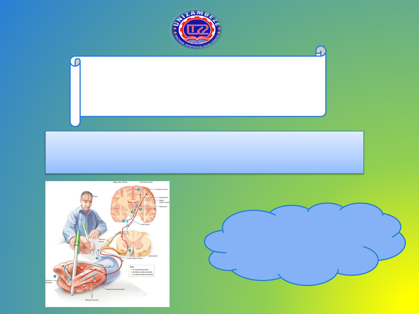 Sistemas Sensoriais Universidade Zambeze Faculdade de Ciências de Saúde Curso de Medicina Dentária Cadeira: Fisiologia Humana I 31/08/2022 Docente: Dr. Eduardo Maferano O certo é certo por mas que ninguém esteja fazendo O errado é errado por mas que todos estejam fazendo. REFLEXÃO Sistemas sensoriais organização geral do sistema nervoso estudo dos sistemas sensoriais. Sistema somatosensorial humano. Objectivos da aula No fim desta aula, cada estudante deve ser capaz de: ❖ Descrever as funções e organização do sistema nervoso. ❖ Descrever os sistemas sensoriais. ❖ Conhecer as propriedades funcionais dos sistemas sensoriais ❖ Descrever as vias do sistema dorsal lemniscal e anterolateral. ❖ Descrever o controle neural da aferencia somatosensorial. ❖ Descrever as alterações do sistema somatosensorial. Introdução ❖ Os sensações somáticos correspondem aos mecanismos neurais responsáveis pela aquisição de informações sensoriais do que se passa em todo o corpo. ❖ Essas formas de sensação, por serem gerais, contrastam com os chamados sentidos especiais, que são especialmente a visão, audição, a olfação, o paladar e o equilíbrio. Definição Definição: conjunto de estruturas e processos que pode captar e interpretar certos aspectos físicos ou químicos, genericamente definidos como estímulos, do meio externo ou interno de um organismo. Sensações: reconhecimento da presença de um estímulo e de suas propriedades básicas – resultado do funcionamento dos sistemas sensoriais. Sensação é a porta de entrada para a percepção. Percepção: é a capacidade de dar às sensações significado e integração. Classificação das Sensações Somáticos Os sentidos somáticos podem ser classificados em três diferentes tipos fisiológicos: 1. Os sensações somáticos mecanorreceptivas (táteis e de posição) 2. As sensações termorreceptivas (calor e frio) 3. A sensações de dor (nociceptiva). As modalidades sensoriais tateis ❖ Os SENTIDOS TÁTEIS incluem os sentidos de toque, pressão, vibração e cócegas, e os sentidos de POSIÇÃO incluem os sentidos de posição estática e de velocidade de movimento. Outras classificações das sensações somáticas ❖ As sensações somáticas são também frequentemente agrupadas em outras classes, como se segue: ❖ Sensações exterorreceptivas; ❖ Sensações proprioceptivas; ❖ Sensações viscerais; ❖ Sensações profundas. Inter-relação entre as sensações de Tato, Pressão e de Vibração ❖ Embora o tato, a pressão e a vibração sejam classificados como sensações distintas todas são detetadas pelo mesmo recetor. Existem três diferenças principais entre elas: 1. A sensibilidade tátil resulta geralmente da estimulação dos recetores para o tato na pele ou nos tecidos imediatamente abaixo da pele 2. A sensação de pressão resulta geralmente da deformação dos tecidos mais profundos Inter-relação entre as sensações de tato, pressão e de vibração 3. A sensação da vibração é resultado da ocorrência de sinais sensoriais repetitivos e rápidos, porem são usados alguns dos tipos de recetores para o tato e pressão; RECEPTORES TÁTEIS 1. Terminações nervosas livres 2. Corpúsculos de Meissner 3. Discos de Merkel 4. Órgão terminal do pelo 5. Terminações de Ruffini 6. Corpúsculo de Pacini RECEPTORES TÁTEIS RECEPTORES TÁTEIS RECEPTORES SENSORIAIS SOMESTÉSICOS Terminações nervosas livres ❖ É mais eclética, encontradas em toda a pele e em muitos outros tecidos, podem detetar tato e pressão, dor, temperatura, cocega e prurido. Ex.: Córnea do olho 1. Algumas transmitem impulsos por fibras Aƍ que conduzem com velocidade de apenas 5 a 30m/s 2. Outras transmitem por fibras amielinicas do tipo C, com velocidade variando com menos de 1m ate 2m/s 3. Enviam sinais para Medula Espinhal, e parte inferior do Tronco Encefálico. Cocegas e prurido. Corpúsculo de Meissner ❖ Fibra nervosa sensorial mielinizada grossa (tipo Aβ) alongada e encapsulada; ❖ Pele glabra, abundantes na ponta dos dedos, lábios, entre outros; ❖ Os corpúsculos de Meissner se adaptam em fração de segundo depois de serem estimulados, o que significa que são particularmente sensíveis ao movimento de objetos na superfície da pele, como também a vibração de baixa frequência. Discos de Merkel ❖ Presentes na ponta dos dedos, nas peles com pelos ❖ Estes Receptores transmitem sinal (por fibras Aβ) inicialmente forte mas que se adapta parcialmente e, em seguida, sinal mais fraco e continuo que se adapta lentamente ❖ Detetam sinais mantidos ❖ Os discos de Merkel são frequentemente agrupados no órgão receptor chamado: receptor em cúpula de Iggo. Órgão terminal do pelo ❖ Se adaptam rapidamente e detetam: ❖ Movimento de objetos na superfície do corpo ❖ O contato inicial do objeto com o corpo ❖ Estes Receptores transmitem sinal por fibras Aβ Terminações de Rufini ❖ Terminações encapsuladas e multirramificadas, viajam por fibras Aβ ❖ Se adaptam muito lentamente ❖ Detetam estímulos contínuos de deformação dos tecidos, como sinais de tato e de pressão intensos e prolongados ❖ Encontradas também nas capsulas articulares e ajudam a sinalizar o grau de rotação Corpúsculo de Pacini ❖ Situam-se imediatamente abaixo da pele e, profundamente nos tecidos das fáscias; ❖ Estimulados pela compressão local dos tecidos; ❖ Importantes para a deteção da vibração tecidual ou de outras alterações rápidas do estado mecânico dos tecidos; ❖ Estes Receptores transmitem sinal por fibras Aβ Receptor de cúpula de Iggo. Discos de Merkel conectados a uma única fibra mielinizada grossa Receptor Estimulo Localização estrutura Adaptação Terminações nervosas livres Temperatura, estimulo nocivo, movimento do pelo Ao redor da raiz dos pelos e sob a superfície da pele Terminações nervosas não mielinizadas Variável Corpúsculos de Meissner Vibraçã