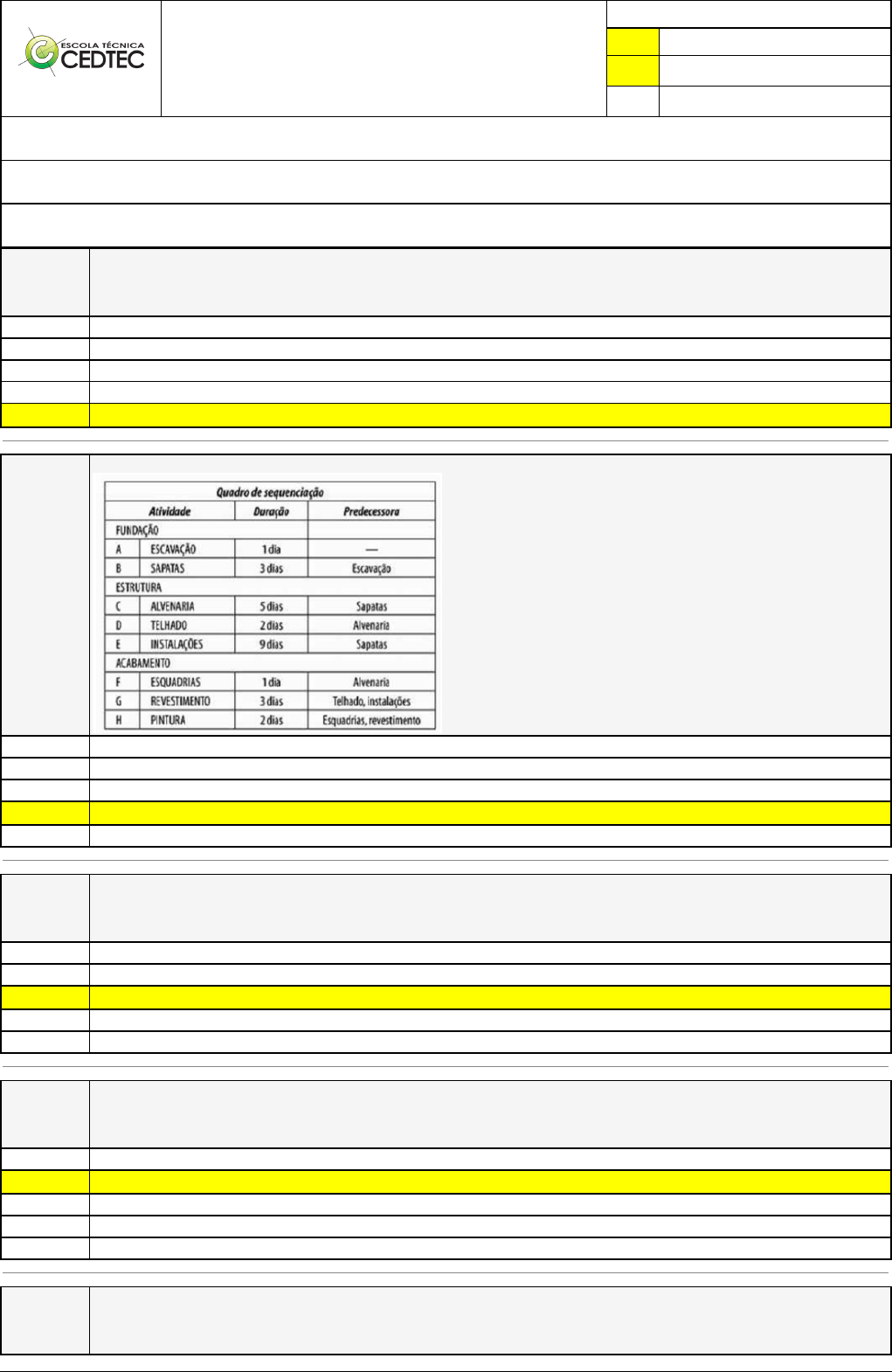Pincel Atômico - 10/03/2023 13:41:15 1/3 FILIPE MARTINS FELIX Exercício Online (EAD) Atividade finalizada em 26/06/2022 22:14:55 (384896 / 1) LEGENDA Resposta correta na questão # Resposta correta - Questão Anulada X Resposta selecionada pelo Aluno Disciplina: GERENCIAMENTO E ORÇAMENTO [439627] - Avaliação com 10 questões, com o peso total de 10,00 pontos [capítulos - Todos] Turma: Curso Técnico: Edificações - Grupo: EAD - FEVEREIRO/22 - EAD EDI [64777] Aluno(a): 91295106 - FILIPE MARTINS FELIX - Respondeu 9 questões corretas, obtendo um total de 9,00 pontos como nota [350159_8530 ] Questão 001 A Empresa “X”, na compra de um item ou serviço de um fornecedor, deve observar vários fatores que se incluem no pacote comprado e que devem ser considerados quando as especificações estão sendo desenvolvidas. Essas especificações podem ser divididas em categorias relacionadas a: Preço, cotações, entrega e quantidade. Preço, quantidade, qualidade e entrega. Quantidade, funcionalidade, fornecedores e preço. Quantidade, preço, qualidade e fornecedores. X Quantidade, preço, funcionalidade e qualidade. [350159_1479 71] Questão 002 Qual o prazo total do projeto abaixo? 13 dias 12 dias 26 dias X 18 dias 9 dias [350159_5158 ] Questão 003 A composição de custos unitários é uma tabela que indica todos os insumos que fazem parte da execução de uma unidade de serviço, abrangendo seus custos unitários e totais. Todas as definições relativas a esse tipo de serviço estão corretas, EXCETO: Custo unitário é o emprego de uma unidade do insumo. Índice é a incidência de cada insumo na execução de uma unidade do serviço. X Custo total é o quociente do índice pelo custo unitário. Unidade é a medida do insumo; no caso de mão de obra, é homem-hora. Insumo é cada item referente a material, a equipamento e à mão de obra. [350159_8512 ] Questão 004 O processo de Planejamento Estratégico compreende algumas etapas principais para sua elaboração. NÃO constitui uma etapa de elaboração deste processo: Análise do ambiente. X Ação corretiva de tarefas. Análise da situação presente da organização. Definição do plano estratégico. Análise interna. [350159_1480 32] Questão 005 Em relação ao canteiro de obras assinale a alternativa correta: Pincel Atômico - 10/03/2023 13:41:15 2/3 São camadas aplicadas sobre paredes, pisos e teto a com a finalidade de proteger o substrato contra umidade, aumentar a resistência e o isolamento termoacústico, adequá-los à aplicação de novas camadas de revestimento e conferir efeito estético. São as estruturas que envolvem uma edificação pela parte superior. Desta maneira, pretendem garantir a proteção da edificação contra qualquer tipo de ação de intempéries e fatores externos. Além de garantir conforto térmico e atender às funções utilitárias, estéticas e econômicas. X É a área de trabalho fixa e temporária, onde se desenvolvem operações de apoio e execução de uma obra e é composto por áreas devivência e áreas operacionais. É o processo de transferência dos elementos da planta baixa de uma edificação para o terreno em que será realizada a obra. Essa transferência é realizada por meio de marcações no terreno com o auxílio de pontaletes e linhas de nylon. É um conjunto de equipamentos que torna possível a instalação de energia em um projeto, o corpo da instalação é constituído por fios, cabos e outros acessórios que juntos formam uma ponte entre a fonte geradora de energia e as cargas elétricas. [350160_8518 ] Questão 006 O processo de planejamento acontece nos três níveis da empresa: o estratégico, o tático, e o operacional. O que caracteriza o planejamento operacional? X Ele é detalhado e analítico. Ele é genérico e analítico. Ele é menos genérico e menos detalhado. Ele é genérico e menos detalhado. Ele é genérico e sintético. [350160_1480 12] Questão 007 Qual o principal objetivo da Gerência de Integração de Projetos? Controlar das alterações feitas no cronograma. X Identificar as atividades específicas do cronograma que necessitam ser executadas dentro do projeto; Assegurar que os diversos elementos do projeto estão adequadamente coordenados. Estimar o tipo e das quantidades de recursos exigidos para execução de cada atividade do projeto; Maximizar os resultados advindos de eventos positivos e minimizar os eventos negativos dentro de um processo. [350160_1480 60] Questão 008 A imagem abaixo se refere: Programação com cronograma de barras (Gantt); X Programação com PERT- CPM. Histograma Quadro sequenciação Cronograma físico-financeiro; [350157_1480 42] Questão 009 A que se refere a afirmativa a seguir: “processo de transferência dos elementos da planta baixa de uma edificação para o terreno em que será realizada a obra. Essa transferência é realizada por meio de marcações no terreno com o auxílio de pontaletes e linhas de nylon.” Aterro e reaterro Fundação Limpeza do terreno Escavação X Locação da obra [350157_1480 28] Questão 010 O que é Avaliação do Ciclo de Vida (ACV) de um projeto? X É uma técnica adequada para a avaliação dos materiais e da energia envolvidos no desenvolvimento do produto, com a medição dosimpactos ambientais ao longo da vida útil de uma edificação. Pincel Atômico - 10/03/2023 13:41:15 3/3 Uma metodologia que proporciona melhora contínua de processos por meio de planejamento e medição de resultados. É um documento no qual devem constar todas as atividades que compõem as etapas de construção da obra, assim como prazo para execução com datas de início e fim, além de também descrever o orçamento disponível para cada uma das fases do projeto É uma ferramenta que organiza o sequenciamento das atividades que precisam ser realizadas para se concluir um projeto. É um dos termos utilizados em diversas áreas como gestão de projetos, comunicação social administraç
