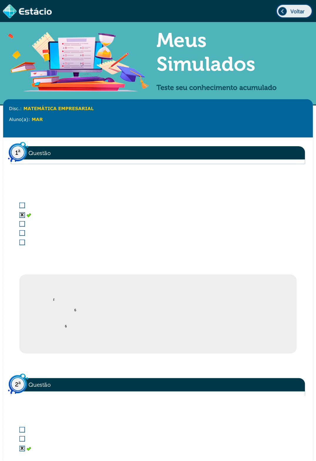 08/03/23, 14:27 Estácio: Alunos https://simulado.estacio.br/alunos/ 1/7 Meus Simulados Teste seu conhecimento acumulado Disc.: MATEMÁTICA EMPRESARIAL Aluno(a): MARIANA DA SILVA ROSA 202301518563 Acertos: 10,0 de 10,0 08/03/2023 Acerto: 1,0 / 1,0 Com a finalidade de atrair novos clientes, um banco oferece empréstimos a uma taxa de juro composto de i= 12% ao ano. Se um cliente pedir um empréstimo de R$10.000,00 para quitar tudo ao final de 6 meses, qual será o valor da dívida que o cliente terá que pagar ao final desse período? R$19.685,23. R$10.615,20 R$13.435,45 R$22.425,50 R$16.755,30 Respondido em 08/03/2023 14:23:18 Explicação: Cálculo do montante com juros composto é: M = C (1 + i) M = 10.000 (1 + 0,01) , note que o tempo e a taxa precisam estar na mesma unidade de tempo, foi preciso transformar 12% ao ano em 1% ao mês para seguir com o cálculo. M = 10.000 (1,01) M = 10.000 x 1,06152 M = 10.615,20 reais. Acerto: 1,0 / 1,0 Um investidor aplicou R$20.000,00 em um fundo de garantia no regime de capitalização simples, que gera lucro de 5% ao mês. Se o investimento tiver duração de 1 ano, qual será o valor que o investidor receberá ao final desse período? R$26.000,00 R$40.000,00 R$32.000,00 t 6 6 Questão1 a Questão2 a https://simulado.estacio.br/alunos/inicio.asp javascript:voltar(); 08/03/23, 14:27 Estácio: Alunos https://simulado.estacio.br/alunos/ 2/7 R$21.000,00 R$36.000,00 Respondido em 08/03/2023 14:24:18 Explicação: O valor que o investidor receberá ao final desse período é o montante. Como o juro que incorre é simples, o cálculo do montante é: M = C ( 1 + it ) M = 20.000 ( 1 + (0,05 x 12)), observe que o tempo e a taxa precisam estar na mesma unidade de tempo, logo a taxa foi transformada de ano em meses. M = 20.000 (1 + 0,6) M = 20.000 x 1,6 M = 32.000 Acerto: 1,0 / 1,0 Um dos principais esportes nos EUA é o basquete, país onde todos os bairros possuem pelo menos uma quadra para a sua prática. Dessa forma, 5 amigos resolveram testar suas habilidades em arremessar e acertar na cesta. A razão entre o total de cestas acertadas por um jogador e o total de arremessos realizados determina qual deles teve o melhor desempenho. Sabendo que: Jogador 1: Acertou 12 cestas em 20 arremessos. Jogador 2: Acertou 15 cestas em 20 arremessos. Jogador 3: Acertou 20 cestas em 25 arremessos. Jogador 4: Acertou 15 cestas em 30 arremessos. Jogador 5: Acertou 25 cestas em 35 arremessos. Qual jogador teve o melhor desempenho? Jogador 4 Jogador 5 Jogador 1 Jogador 3 Jogador 2 Respondido em 08/03/2023 14:24:29 Explicação: Jogador 1: 12/20 = 0,6 Jogador 2: 15/20 = 0,75 Jogador 3: 20/25 = 0,8 Jogador 4: 15/30 = 0,5 Jogador 5: 25/35 = 0,72 Logo, o jogador com o melhor desempenho foi o jogador 3. Questão3 a 08/03/23, 14:27 Estácio: Alunos https://simulado.estacio.br/alunos/ 3/7 Acerto: 1,0 / 1,0 Considere que os conjuntos A, B e C são não vazios. Em qual diagrama está destacado o conjunto : (A ∩ B) − C Questão4 a 08/03/23, 14:27 Estácio: Alunos https://simulado.estacio.br/alunos/ 4/7 Respondido em 08/03/2023 14:24:40 Explicação: A resposta correta é: Acerto: 1,0 / 1,0 Numa pesquisa sobre audiência de canais da TV, ao entrevistar 150 pessoas, obteve-se o seguinte resultado: 60 assistem ao canal A, 45 assistem ao canal B, 25 assistem ao canal C, 20 assistem aos canais A e B, 15 assistem aos canais B e C, 8 assistem aos canais A e C e 3 assistem aos três canais. Quantas pessoas não assistem nenhum desses canais? 30 20 50 40 60 Respondido em 08/03/2023 14:24:53 Explicação: A resposta correta é: 60 Acerto: 1,0 / 1,0 Considere os intervalos: , , e O intervalo é o resultado de qual operação? A = [−1, 4) B = [1, 5] C = [2, 5) D = (−∞, 3] E = [−1, 2) Questão5 a Questão6 a 08/03/23, 14:27 Estácio: Alunos https://simulado.estacio.br/alunos/ 5/7 Respondido em 08/03/2023 14:25:15 Explicação: A resposta correta é: Acerto: 1,0 / 1,0 No gráfico a seguir, temos o nível da água armazenada em uma barragem, ao longo de três anos. O nível de 40m foi atingido quantas vezes neste período? 3 5 4 1 2 Respondido em 08/03/2023 14:25:19 Explicação: Percebemos que o gráfico possui uma queda acentuada quando o nível da água chega em 10m. É nesta queda que o nível de 40m é atingido pela primeira vez. Logo em seguida o gráfico apresenta uma subida também acentuada e o nível novamente atinge a marca de 40m. Logo a resposta correta é 2 vezes. Acerto: 1,0 / 1,0 O gráfico mostra o faturamento de duas empresas, A e B, em milhões de reais (eixo y) durante o primeiro semestre do ano (eixo x). A empresa A está representada no gráfico pela linha azul e a empresa B pela linha verde. (D ∪ C) − (A ∩ B) (D − C) ∩ (A ∪ B) (D ∩ C) ∪ (A − B) (D ∪ C) ∩ (A − B) (D − C) ∪ (A ∩ B) (D − C) ∩ (A ∪ B) Questão7 a Questão8 a 08/03/23, 14:27 Estácio: Alunos https://simulado.estacio.br/alunos/ 6/7 Das opções apresentadas abaixo, assinale aquela que apresenta um intervalo de faturamento simultâneo das empresas A e B que esteja entre 20 milhões e 30 milhões de reais. [4,3 ; 5,8] [2,1 ; 4] [0 ; 2] [4,2 ; 6] [4,5 ; 5,8] Respondido em 08/03/2023 14:25:24 Explicação: Veja no gráfico que ambas as curvas se apresentam acima da curva dos 20 milhões somente um pouco após o valor de t > 5,4. Então neste caso, dos intervalos descritos nas alternativas, somente o [4,5 ; 5,8] apresenta simultaneamente faturamento entre 20 milhões e 30 milhões. OBS: Veja que cada quadradinho tem lado igual a 0,2. Acerto: 1,0 / 1,0 O lucro L obtido com a comercialização de Q unidades de um modelo de ventilador fabricado pela empresa Vent- lar pode ser estimado pela função L(Q)=-0,002Q2+9Q-4.950 com L em reais. O lucro máximo que pode ser obtido é 1.788 reais. 4.950 reais. 5.175 reais. 6.750 reais. 2.250 reais. Respondido em 08/03/2023 14:25:49 Questão9 a 08/03/23, 14:27 Estácio: Alunos https://simulado.estacio.br/alunos/ 7/7 Explicação: A quant