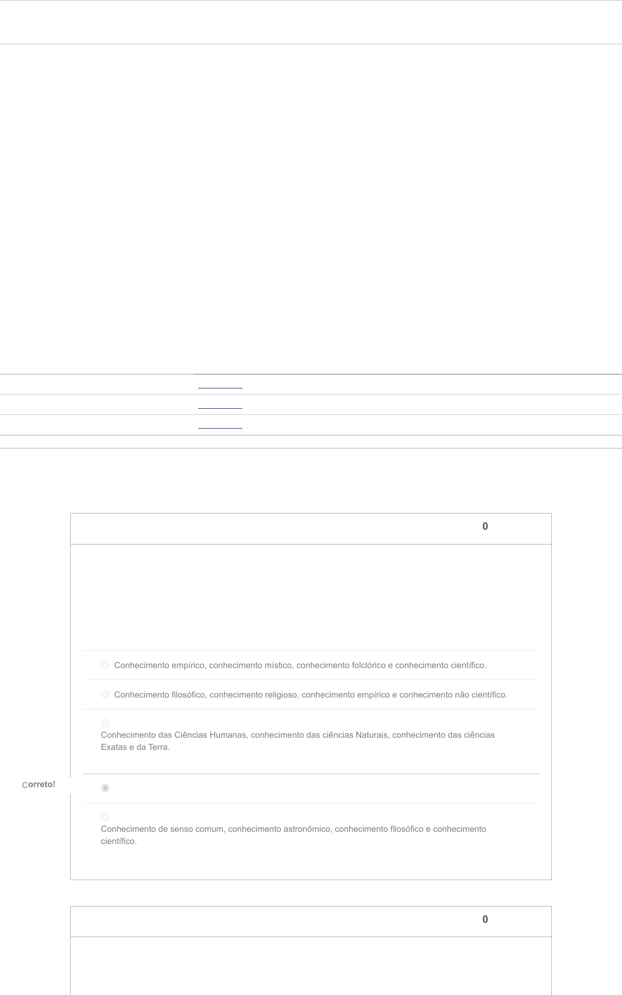 Q01 - Questionário 01 Entrega 12 mar em 23:59 Pontos 0,4 Perguntas 4 Disponível 9 jan em 19:00 - 12 mar em 23:59 Limite de tempo Nenhum Tentativas permitidas 2 Instruções Histórico de tentativas Tentativa Tempo Pontuação MANTIDO Tentativa 2 3 minutos 0,4 de 0,4 MAIS RECENTE Tentativa 2 3 minutos 0,4 de 0,4 Tentativa 1 15 minutos 0,3 de 0,4 Pontuação desta tentativa: 0,4 de 0,4 Enviado 14 fev em 21:53 Esta tentativa levou 3 minutos. Instruções do Questionário! 1. Antes de responder o Questionário: Assista a videoaula e leia o capitulo correspondente do livro ! 2. Abra o questionário somente quando for responder; 3. Ao abrir o questionário você terá 4 questões para responder; 4. Leia com calma todas as questões e entenda o que pede a questão: se pede a incorreta, a correta e qual o tema da questão; 5. Lembre de Clicar no botão "Enviar Teste"; 6. Você tem duas tentativas para fazer o teste, a segunda tentativa é opcional; 7. Lembre-se que as respostas mudam de lugar em cada tentativa; 8. As respostas corretas só aparecem após o envio da segunda tentativa; 9. O sistema considera a maior nota entre as duas tentativas; 10. Lembre-se que a segunda tentativa vai zerar TODAS as questões, inclusive as que você acertou na primeira tentativa; 11. Caso queira ter o questionário para arquivo pessoal, basta selecionar a impressão do questionário e escolher a opção de "salvar em PDF"; Bons estudos! 😀 0,1 / 0,1 ptsPergunta 1 A nossa espécie sempre teve a necessidade de compreender e explicar o mundo que a cerca, bem como os fenômenos presentes em seu cotidiano. Justamente para poder alcançar esses objetivos é que fomos desenvolvendo diferentes tipos de conhecimento ao longo da história. De acordo com o capítulo um. Esses conhecimentos podem ser nomeados, respectivamente como: Conhecimento empírico, conhecimento místico, conhecimento folclórico e conhecimento científico. Conhecimento filosófico, conhecimento religioso, conhecimento empírico e conhecimento não científico. Conhecimento das Ciências Humanas, conhecimento das ciências Naturais, conhecimento das ciências Exatas e da Terra. Conhecimento filosófico, conhecimento religioso, conhecimento empírico e conhecimento científico. Correto!Correto! Conhecimento de senso comum, conhecimento astronômico, conhecimento filosófico e conhecimento científico. 0,1 / 0,1 ptsPergunta 2 Cada tipo de conhecimento desenvolvido por nós, seres humanos, traz consigo características e particularidades próprias daquele conhecimento. Cada um deles se constrói a partir de bases diferentes https://ucaead.instructure.com/courses/60228/quizzes/132349/history?version=2 https://ucaead.instructure.com/courses/60228/quizzes/132349/history?version=2 https://ucaead.instructure.com/courses/60228/quizzes/132349/history?version=1 entre si. O conhecimento religioso, por exemplo, tem como base a fé. Diferente do conhecimento científico que tem como base: verdades absolutas. o método científico, se pautando em informações e fatos comprovados. Correto!Correto! apenas as experiências do sujeito. uma lógica racional pautada na construção de conceitos. apenas o ato de observação. 0,1 / 0,1 ptsPergunta 3 A palavra pesquisa é amplamente utilizada em nosso cotidiano, mas essa palavra pode ter significados muito diferentes entre si. Pesquisa escolar, pesquisa eleitoral, pesquisa de preço ou pesquisa científica. No caso específico da disciplina de metodologia científica, o significado que nos interessa é justamente o da pesquisa científica. De acordo com os saberes trabalhados na disciplina, assinale a frase cuja o significado se refere a uma pesquisa de ordem científica: Fui convidado para participar como voluntário de uma pesquisa que irá desenvolver um remédio contra hipertensão. Correto!Correto! Meu irmão estava assistindo ao jornal e viu que na pesquisa o candidato do partido x está com mais intenções de votos que a candidata do partido y. Amanhã irei à biblioteca fazer uma pesquisa sobre a Independência do Brasil. Minha professora pediu que fizéssemos uma pesquisa sobre o dia de Tiradentes. Pesquisei na internet e vi que amanhã irá chover. 0,1 / 0,1 ptsPergunta 4 No campo educacional o desenvolvimento da pesquisa aconteceu paulatinamente através da criação de institutos e centros de pesquisa. Com o aumento dos cursos de pós-graduação stricto sensu a partir da década de 60, o desenvolvimento das pesquisas nesse campo passou por uma aceleração, mas essa aceleração também trouxe problemas na produção das pesquisas, com base em André (2007), assinale a alternativa que apresenta de maneira correta esses problemas: problemas referentes aos fins da investigação e à natureza dos conhecimentos produzidos, problemas relativos aos critérios de avaliação dos trabalhos científicos, problemas voltados aos pressupostos dos métodos e técnicas de investigação. Correto!Correto! problemas quanto a finalidade da pesquisa e questões metodológicas. problemas no processo de avaliação das pesquisas, bem como em seus objetivos. problemas relativos aos critérios de avaliação dos trabalhos científicos, problemas voltados aos pressupostos dos métodos e técnicas de investigação. problemas referentes às hipóteses da investigação e à natureza dos conhecimentos produzidos, problemas relativos aos critérios de avaliação dos trabalhos científicos, problemas voltados aos pressupostos dos métodos e técnicas de investigação. Pontuação do teste: 0,4 de 0,4