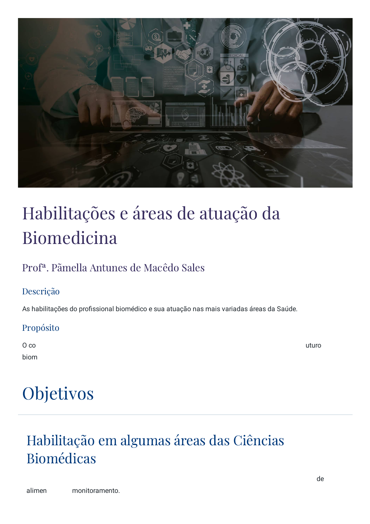 29/03/2022 11:41 Habilitações e áreas de atuação da Biomedicina https://stecine.azureedge.net/repositorio/00212sa/03019/index.html# 1/60 Habilitações e áreas de atuação da Biomedicina Profª. Pãmella Antunes de Macêdo Sales Descrição As habilitações do profissional biomédico e sua atuação nas mais variadas áreas da Saúde. Propósito O conhecimento sobre todas as possibilidades de atuação profissional é essencial para que o futuro biomédico opte pela área que mais tem afinidade, podendo direcionar seus estudos em busca do crescimento na carreira escolhida. Objetivos Módulo 1 Habilitação em algumas áreas das Ciências Biomédicas Reconhecer algumas habilitações do biomédico no diagnóstico, na análise ambiental, na análise de alimentos e no monitoramento. 29/03/2022 11:41 Habilitações e áreas de atuação da Biomedicina https://stecine.azureedge.net/repositorio/00212sa/03019/index.html# 2/60 Módulo 2 Habilitações no cuidado da saúde e em algumas áreas das Ciências Biológicas Reconhecer algumas habilitações da Biomedicina nas Ciências Biológicas, no cuidado da saúde e no bem-estar físico, mental e social. Módulo 3 Habilitações nas áreas microbiológica, farmacológica e atenção à saúde Descrever as habilitações do biomédico na Microbiologia, na Parasitologia, na Farmacologia, nas Ciências Sociais e na Administração e Gerenciamento. Módulo 4 Outras áreas de atuação do biomédico Descrever os principais pontos da responsabilidade técnica e outras áreas de atuação do biomédico. A Biomedicina é uma profissão que também faz parte do campo da Saúde. O biomédico é o profissional que atua nessa área, se dedicando a pesquisar e a estudar inúmeros setores da Saúde, com extensa área de atuação. A Biomedicina participa dos processos de diagnóstico das doenças, além de contribuir no controle, prevenção, investigação de novos tratamentos e medidas profiláticas importantes no âmbito individual ou de saúde coletiva. Além disso, tem a capacidade de atuar diretamente no bem-estar dos indivíduos. Assim como em outras profissões, o biomédico é um profissional versátil que pode se especializar e atuar em inúmeros setores. Após a realização da graduação, ainda é possível fazer uma pós- graduação, ter título de especialista, cursos de aprimoramento e residência biomédica. Introdução 29/03/2022 11:41 Habilitações e áreas de atuação da Biomedicina https://stecine.azureedge.net/repositorio/00212sa/03019/index.html# 3/60 1 - Habilitação em algumas áreas das Ciências Biomédicas Ao �nal deste módulo, você será capaz de reconhecer algumas habilitações do biomédico no diagnóstico, análise ambiental e de alimentos e monitoramento. Todos esses cursos poderão auxiliar na obtenção de uma nova habilitação. E será que você conhece todas elas? Ou será que apenas ouviu falar das mais famosas? Tenho certeza de que algumas você já deve conhecer e outras serão uma completa novidade. Por isso, neste conteúdo, conheceremos todas as habilitações do biomédico regulamentadas pelo Conselho Federal de Biomedicina e suas áreas de atuação. Orientação sobre unidade de medida Em nosso material, unidades de medida e números são escritos juntos (ex.: 25km) por questões de tecnologia e didáticas. No entanto, o Inmetro estabelece que deve existir um espaço entre o número e a unidade (ex.: 25 km). Logo, os relatórios técnicos e demais materiais escritos por você devem seguir o padrão internacional de separação dos números e das unidades. 29/03/2022 11:41 Habilitações e áreas de atuação da Biomedicina https://stecine.azureedge.net/repositorio/00212sa/03019/index.html# 4/60 Análise ambiental O crescimento populacional das últimas décadas aumentou a necessidade de espaços para habitação. Entretanto, em muitas cidades, ocorreu de maneira desordenada e sem planejamento estrutural. Efetivamente, isso mostra uma necessidade cada vez maior de um aporte de alimentos e espaço, que nos colocou em constante choque com a natureza. Neste sentido, podemos observar um aumento no consumo dos recursos hídricos, assim como o manejo do esgoto doméstico e rejeitos da produção industrial. O aumento das parasitoses devido à falta de saneamento é um importante problema do país. Não precisamos ir muito longe para vivenciar os problemas pelo crescimento desordenado e sem planejamento das grandes cidades, com o esgotamento de recursos naturais, como a crise hídrica vivida no Brasil, em 2021, que é a maior em 91 anos, e as doenças causadas pela falta de saneamento básico, como acontece com as parasitoses, um importante problema de saúde pública vivido pelo país. Pensando na necessidade de profissionais que fossem habilitados para atuar nas análises laboratoriais dessa interação intensa com a natureza, o Conselho Federal de Biomedicina, por meio da Resolução nº78, de 2002, e nº188, de 2010, autorizou o profissional biomédico a atuar também como analista ambiental. O biomédico que se dedica à análise ambiental pode desenvolver maneiras de intervenção nos ambientes urbanos, minerais e hidroelétricos. Tendo em vista os desafios enfrentados atualmente nesse campo, a profissão de analista ambiental se torna cada vez mais promissora. Nessa função, o profissional pode atuar realizando análises microbiológicas para saneamento ambiental e ainda análises físico-químicas da água, do esgoto e do ar. Por isso, cada vez mais será notada a presença do biomédico em empresas de distribuição de água e de saneamento básico de grandes ou pequenos 29/03/2022 11:41 Habilitações e áreas de atuação da Biomedicina https://stecine.azureedge.net/repositorio/00212sa/03019/index.html# 5/60 municípios. Além disso, o biomédico poderá atuar na regulação, controle, fiscalização, monitoramento e licenciamento, além de auditoria ambiental. Para atuar nesta última área, 
