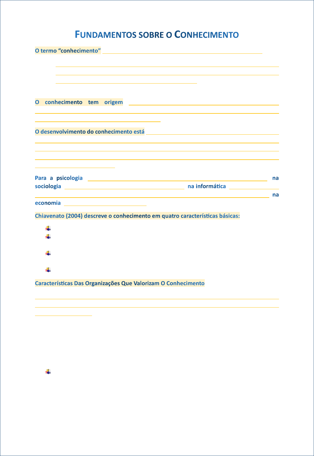 @laismazzini origina-se no latim “cognoscere”, que significa conhecer, saber. → O ato de conhecer envolve processos mentais, como “percepção, atenção, memória, interpretação, raciocínio lógico, julgamento, além de habilidades como a capacidade de planejar uma atividade ou de solucionar um problema” (CORDIOLI, 2008, p. 86). → Então, entende-se que a produção do conhecimento pode ser pessoal e individual. nas experiências individuais, nas observações, nos relacionamentos, na leitura de publicações, na internet, na religião, no desenvolvimento das ciências e nos diferentes estudos que realizamos. intimamente ligado à convivência em grupo, quando o conhecimento de uma pessoa é transmitido à outra, de forma que cada ser humano evolui movido pela necessidade de compreender a si mesmo, conhecer o outro e o mundo em que está inserido. Assim, o conhecimento pessoal pode ser transformado em conhecimento coletivo, impactando nos grupos sociais. , o conhecimento é compreendido como o conteúdo da memória; , está associado a grupos sociais e a instituições; , especificamente na área da inteligência artificial, refere-se à cognição de uma pessoa nos processos eletrônicos; , como fator de produção coletiva (NORTH, 2010). é tácito (pessoal e individual e construído socialmente); é orientado para a ação (novos conhecimentos são gerados por intermédio da percepção); é sustentado por regras (que são inconscientes e dificultam as pessoas de aceitar coisas novas); e está em constante mutação. Só existe organização quando os seus integrantes se comunicam e cooperam uns com os outros com a finalidade de alcançar um objetivo comum, uma vez que pessoas isoladamente não conseguiriam alcançar (CHIAVENATO, 2009). São exemplos de organização: escolas, exército, comunidades de bairro, empresas privadas, empresas públicas, comunidades religiosas, hospitais, instituições bancárias, sindicatos, lojas comerciais e outras organizações voltadas para a produção de bens ou produtos ou para a prestação de serviços. Na visão tradicional de organização, seus integrantes são os proprietários, os administradores e os empregados. Organizações que valorizam o conhecimento são conhecidas como empresas inteligentes e empresas criadoras do conhecimento. “Em uma economia onde a única certeza é a incerteza, a fonte certa de vantagem competitiva duradoura é o conhecimento”. Dessa forma, Nonaka (2008, p. 39) reflete a respeito da empresa “criadora de conhecimento”, onde a inovação constante é o negócio principal. E continua explicando que: [...] quando os @laismazzini mercados transformam-se, as tecnologias proliferam, os competidores multiplicam-se e os produtos tornam-se obsoletos quase do dia para a noite, as empresas bem-sucedidas são as que criam consistentemente novos conhecimentos, disseminam-no amplamente pela organização e o incorporam rapidamente em novas tecnologias e produtos. Isso quer dizer que, para ter sucesso e garantir longevidade, as organizações atuais devem criar, disseminar e incorporar novas tecnologias e produtos ou serviços aos clientes ou consumidores. O mesmo autor aponta que ter capacidade de resposta rápida aos clientes, criar novos mercados, desenvolver novos produtos com agilidade e dominar tecnologias emergentes caracterizam as organizações que pensam no conhecimento e em seu relevante papel. Após estudos aprofundados para compreender , Veraszto et al. (2008) concluíram que a tecnologia tem o seu lado cultural (metas, valores, códigos éticos e crença no desenvolvimento e na criatividade humana) e tem o seu aspecto organizacional (economia e atividades industriais, trabalhadores, consumidores/ usuários); é um saber que se adquire pelas teorias, práticas e pesquisas tecnológicas. Homem, cultura, saberes e necessidades, trabalho e instrumentos fazem parte da concepção de tecnologia. Podemos compreender, então, a importância do conhecimento, uma vez que ele é criado, aplicado e utilizado pelas próprias pessoas. As organizações devem proporcionar às pessoas um trabalho desafiador, que agregue experiências e conhecimentos; devem saber conquistar, reter e motivá-las, pois são elas que detêm o conhecimento que contribuirá para o sucesso organizacional. dar poder e autonomia (empowerment) aos trabalhadores; criar condições para disseminação de informação para facilitar a tomada de decisões e a busca pelo novo; recompensar os trabalhadores pelos objetivos organizacionais atingidos; e definir as competências que a organização necessita para alcançar os seus objetivos, de modo a criar condições internas para que os trabalhadores desenvolvam essas competências. Cada gestor e a organização como um todo passam a ter o papel de aumentar e aplicar continuamente o capital humano (CHIAVENATO, 2009). O conhecimento de uma organização inclui patentes, processos, tecnologias, competências dos trabalhadores, informações sobre a clientela, os mercados e os fornecedores. North (2010) denomina “empresas inteligentes”, aquelas que são orientadas para o conhecimento. atendem às “exigências diferenciadas dos clientes” (NORTH, 2010, p. 24), equilibrando, por exemplo, a queda de preços para os produtos ou serviços; oferecem soluções para os problemas dos clientes, intensificando em conhecimentos dificilmente imitáveis ou não substituíveis em curto prazo; desenvolvem produtos melhores que os dos concorrentes; transferem conhecimentos para clientes, fornecedores, parceiros e competidores e também promovem troca com eles; têm como valores fundamentais a confiança, a liberdade para as inovações e a autenticidade; @laismazzini utilizam benchmarking interno e externo, destacando as melhores práticas em prol da melhoria contínua; fomentam contatos informais, reuniões, trabalho em equipe, de forma que estimulam a comunicação e os espaços sociais e profission