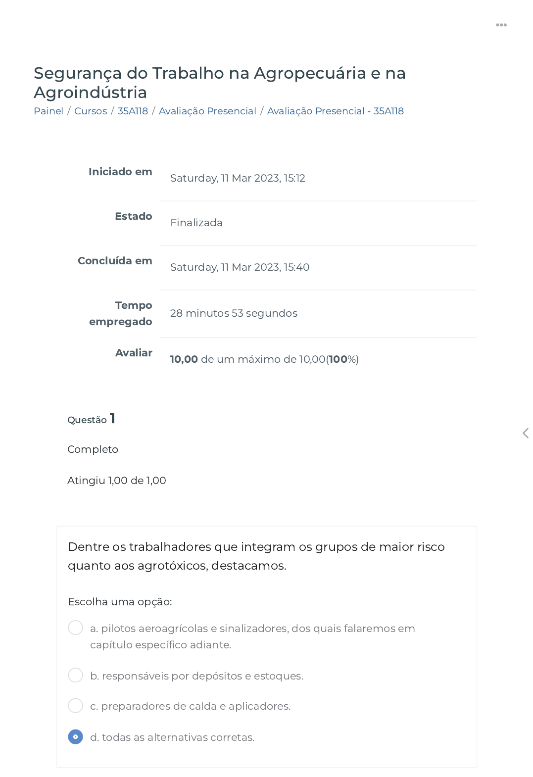 11/03/2023, 14:41 Avaliação Presencial - 35A118 https://ava.politecnicabr.com.br/mod/quiz/review.php?attempt=4528290 1/11 Painel / Cursos / 35A118 / Avaliação Presencial / Avaliação Presencial - 35A118 Segurança do Trabalho na Agropecuária e na Agroindústria Iniciado em Saturday, 11 Mar 2023, 15:12 Estado Finalizada Concluída em Saturday, 11 Mar 2023, 15:40 Tempo empregado 28 minutos 53 segundos Avaliar 10,00 de um máximo de 10,00(100%) Questão 1 Completo Atingiu 1,00 de 1,00 Dentre os trabalhadores que integram os grupos de maior risco quanto aos agrotóxicos, destacamos. Escolha uma opção: a. pilotos aeroagrícolas e sinalizadores, dos quais falaremos em capítulo especí�co adiante. b. responsáveis por depósitos e estoques. c. preparadores de calda e aplicadores. d. todas as alternativas corretas. https://ava.politecnicabr.com.br/my/ https://ava.politecnicabr.com.br/course/index.php https://ava.politecnicabr.com.br/course/view.php?id=1040 https://ava.politecnicabr.com.br/course/view.php?id=1040#section-21 https://ava.politecnicabr.com.br/mod/quiz/view.php?id=32406 https://ava.politecnicabr.com.br/ 11/03/2023, 14:41 Avaliação Presencial - 35A118 https://ava.politecnicabr.com.br/mod/quiz/review.php?attempt=4528290 2/11 Questão 2 Completo Atingiu 1,00 de 1,00 Marque (V) Verdadeiro ou (F) Falso, com relação ao ruído. ( ) O trabalho sob exposição solar muitas vezes provoca excessiva sudorese localizada, que pode resultar amplo desconforto na interface pavilhão auditivo – protetor, sendo capaz de causar a descontinuidade do uso do equipamento por parte dos trabalhadores. ( ) A gestão do ruído laboral deverá, então, contemplar a identi�cação das fontes emissoras, a avaliação das intensidades a que os trabalhadores diretamente envolvidos e do entorno estarão submetidos, a tomada de medidas para a minimização da exposição, o que pode ser di�cultado em razão do ambiente e das condições em que se dará a execução de determinada tarefa (por exemplo, no trato com tratores de rabiça, sem cabine, a plena potência de tração), restando, então, como única medida de atenuação, se impossibilitada a intervenção junto à fonte, os EPIs fornecidos, cuja utilização e conservação devem ser rigorosamente controladas. Escolha uma opção: a. V, V. b. F, V . c. F, F. d. V, F. https://ava.politecnicabr.com.br/ 11/03/2023, 14:41 Avaliação Presencial - 35A118 https://ava.politecnicabr.com.br/mod/quiz/review.php?attempt=4528290 3/11 Questão 3 Completo Atingiu 1,00 de 1,00 Marque a alternativa correta, quando a prevenção e combate a incêndio. Escolha uma opção: a. todos os empregadores devem adotar medidas de prevenção de incêndios, em conformidade com a legislação estadual e as normas técnicas aplicáveis. b. todas as alternativas corretas. c. as aberturas, saídas e vias de passagem devem ser claramente assinaladas por meio de placas ou sinais luminosos, indicando a direção da saída. d. os locais de trabalho deverão dispor de saídas, em número su�ciente e dispostas de modo que aqueles que se encontrem nesses locais possam abandoná-los com rapidez e segurança, em caso de emergência. https://ava.politecnicabr.com.br/ 11/03/2023, 14:41 Avaliação Presencial - 35A118 https://ava.politecnicabr.com.br/mod/quiz/review.php?attempt=4528290 4/11 Questão 4 Completo Atingiu 1,00 de 1,00 Apesar de controlado em sua superfície, o incêndio nos grãos poderá prolongar-se por várias horas, uma vez que ocorre em camadas, sendo necessária redobrada atenção para que o particulado depositado em estruturas, tubulações e em outros locais de difícil acesso, limpeza e visualização não seja colocado em suspensão, formando nova nuvem de poeira, por reunir as condições para originar uma nova explosão e todas as suas consequências cíclicas. Dentre as ações relativas à operação e à manutenção dessa edi�cação, podemos elencar: Escolha uma opção: a. proceder à limpeza periódica dessas instalações, bem como dos sistemas de captação de pó, renovando e substituindo os elementos �ltrantes, evitando, dessa feita, o acúmulo de pós e sua posterior dispersão para outras áreas das instalações. b. veri�car periodicamente o estado do aterramento de todos os potenciais geradores de cargas estáticas, assim como do sistema contra descargas atmosféricas, observando cabos e demais componentes; preferir (e mesmo substituir) todos os componentes metálicos por plásticos (caçambas dos elevadores, pás dos transportadores e correntes). c. executar rigoroso programa de manutenção de todos os dispositivos e equipamentos eletromecânicos, para a pronta disponibilidade destes em seu mais perfeito estado de operação. d. todas as alternativas corretas. e. se tal ocorrer, proceder à remoção por aspiração e não por varrição. https://ava.politecnicabr.com.br/ 11/03/2023, 14:41 Avaliação Presencial - 35A118 https://ava.politecnicabr.com.br/mod/quiz/review.php?attempt=4528290 5/11 Questão 5 Completo Atingiu 1,00 de 1,00 Assinale (C) Certo ou (E) Errado. LISTA DAS PIORES FORMAS DE TRABALHO INFANTIL (LISTA TIP) – Anexo do Decreto n. 6.481/2008 I. TRABALHOS PREJUDICIAIS À SAÚDE E À SEGURANÇA (Excerto) ( ) Descrição dos trabalhadores: No bene�ciamento do fumo, sisal, castanha-de-caju e cana-de-açúcar. Prováveis riscos ocupacionais: Esforço físico, levantamento e transporte de peso; exposição a poeiras orgânicas, ácidos e substâncias tóxicas. Prováveis repercussões a saúde: Intoxicações agudas e crônicas; polineuropatias; dermatites de contato; dermatites alérgicas; osteomalácias do adulto induzidas por drogas; cânceres; arritmias cardíacas; leucemias e episódios depressivos. ( ) Descrição dos trabalhadores: Na colheita de cítricos, pimenta- malagueta e semelhantes. Prováveis riscos ocupacionais: Esforço físico, levantamento e transporte de peso; exposição a poeiras orgânicas, ácido