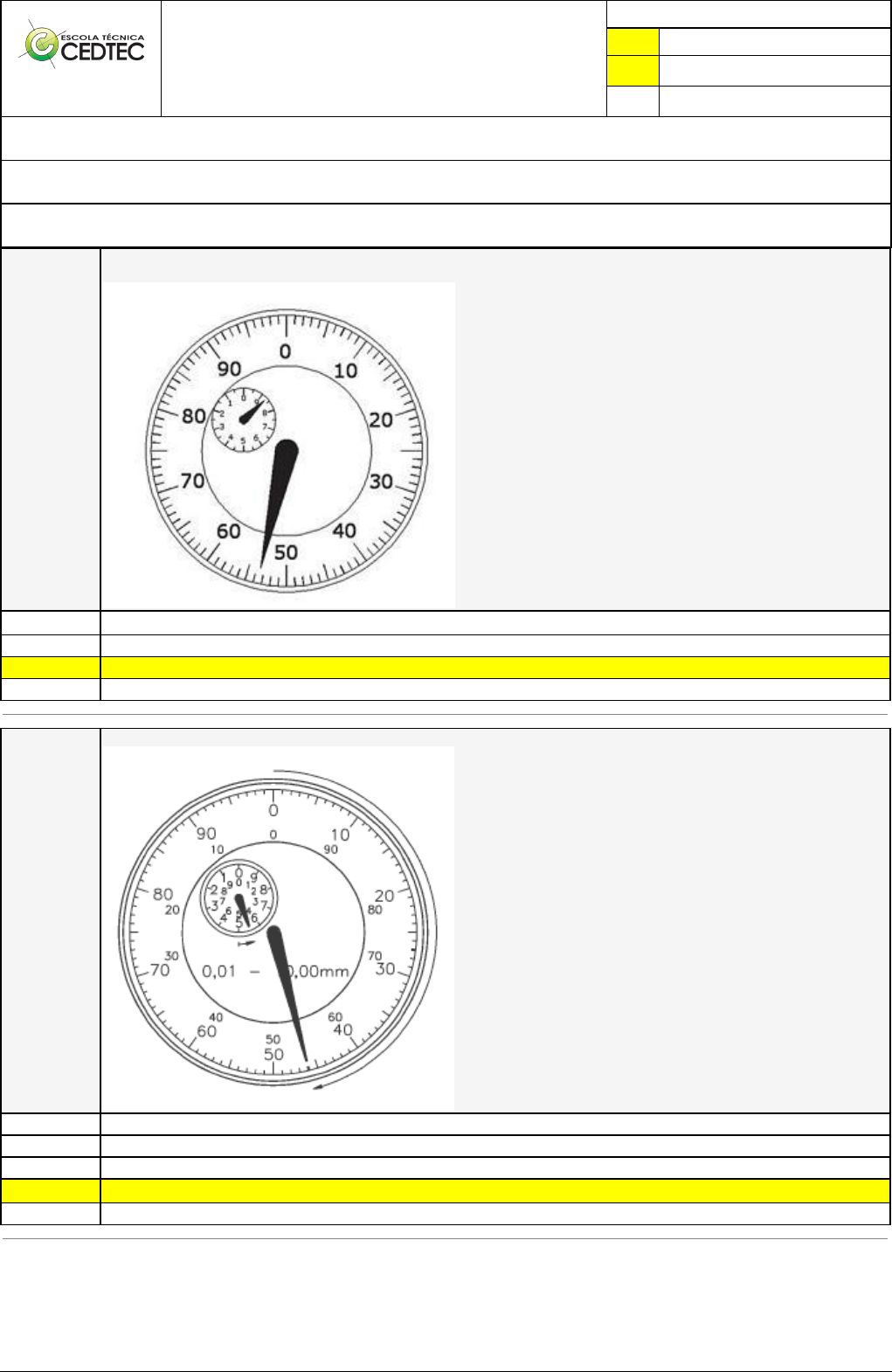 Pincel Atômico - 11/03/2023 22:02:40 1/2 THIAGO LOBÃO MEDEIRO Exercício Caminho do Conhecimento - Etapa 14 (15349) Atividade finalizada em 18/12/2022 16:29:45 (556189 / 1) LEGENDA Resposta correta na questão # Resposta correta - Questão Anulada X Resposta selecionada pelo Aluno Disciplina: METROLOGIA [513037] - Avaliação com 4 questões, com o peso total de 6,50 pontos [capítulos - 106] Turma: Curso Técnico: Mecânica - Grupo: EAD - OUTUBRO/22 - EAD MEC [73879] Aluno(a): 90099974 - THIAGO LOBÃO MEDEIRO - Respondeu 2 questões corretas, obtendo um total de 3,25 pontos como nota [350185_28189] Questão 001 Um relógio comparador com VERNIER igual a 0,01 mm foi utilizado para medir o desalinhamento máximo de uma roda. Qual é, em mm, a leitura indicada ? X 8,53 ± 0,01 mm 53,08 ± 0,005 mm 8,53 ± 0,005 mm 8,54 ± 0,001 mm [350186_612] Questão 002 Calcule e informe a leitura abaixo. - 0,46 mm +1,46 mm - 0,55 mm X +0,46 mm -1,54 mm Pincel Atômico - 11/03/2023 22:02:40 2/2 [350185_606] Questão 003 Marque a alternativa correta que corresponde à leitura do instrumento abaixo: 0,157” -1,157” 1,157” 2,257” X -0,157” [350186_28190] Questão 004 Um relógio comparador foi montado em uma base magnética com intuito de ser utilizado para medir as dimensões de sucessivas peças produzidas por uma máquina. Para definir uma posição zero a partir da qual o relógio deveria medir as peças, um bloco-padrão com comprimento de 50 mm foi utilizado. O relógio foi zerado no seu curso máximo, com 10 mm de contração. A primeira peça medida resultou na indicação do relógio comparador mostrada abaixo. 7,71 mm X 57,71 mm 2,29 mm 47,71 mm