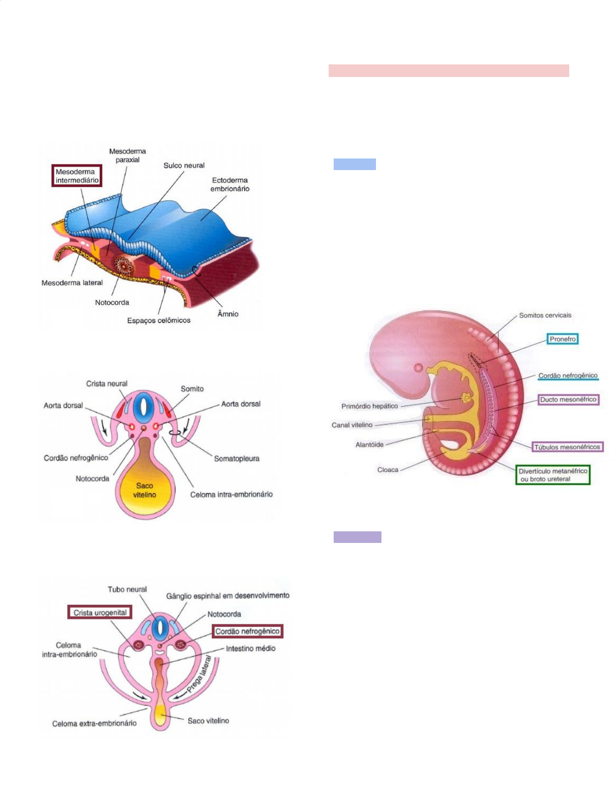 SISTEMA UROGENITAL Embriologicamente, os sistemas urinário e genital estão associados. Ambos, inicialmente desembocam na cloaca. O sistema urogenital deriva do mesoderma intermediário, o qual se estende por toda parede dorsal do embrião e conecta o mesoderma paraxial (somitos) com o mesoderma lateral. Durante os dobramentos do embrião (4ª semana) o mesoderma intermediário forma uma projeção (crista urogenital) de cada lado da aorta dorsal. A parte da crista urogenital que formará o sistema urinário é o cordão nefrogênico e a parte da crista urogenital que formará o sistema reprodutor é a crista gonadal. Após o dobramento no plano horizontal, o mesoderma intermediário se desloca para a região ventral. DESENVOLVIMENTO DO SISTEMA URINÁRIO Constituído pelos rins, ureteres, bexiga e uretra. Os túbulos renais originam-se das várias alturas do blastema nefrogênico adquirindo formas diferentes, dividimos a evolução em três etapas sucessivas, onde se formam três tipos renais (em humanos): . Pronefro → Início 4ª semana. Originário da porção cefálica do blastema nefrogênico. No interior do mesoderma da região cefálica forma-se precocemente um ducto que progride em direção caudal, formando um tubo contínuo ao longo do blastema nefrogênico, indo desembocar na cloaca. Esse ducto é um grupo de sete a dez células que formam unidades excretoras, denominadas nefrótomos, rudimentares e não funcionais, que degenera-se rapidamente. ✱ Funcional em vertebrados inferiores (peixes) . Mesonefro → Ao final da 4ª semana, surgem caudalmente aos pronefros, na região torácica e lombar superior. Funcionará até que os rins permanentes estejam desenvolvidos. São constituidos por glomérulos e túbulos mesonéfricos. Os túbulos abrem-se nos ductos mesonéfricos que por sua vez, abrem-se na cloaca. Ao final do 1º trimestre o mesonefro degenera-se e seus túbulos mesonéfricos irão originar os ductos eferentes dos testículos, ligamentos do útero e os ductos mesonéfricos (ductos de Wolff) darão os túbulos do epidídimo, ductos deferentes, ducto ejaculatório, vesícula seminal e ureteres. ✱ Funcional em vertebrados inferiores (anfíbios) Vista lateral de um embrião de 5 semanas mostrando a extensão do mesonefro e do primórdio do metanefro (ou rim permanente): Estágios sucessivos do desenvolvimento do broto uretérico (5ª à 8ª semana). Desenvolvimento do ureter, pelve, renal, cálices e túbulos coletores: Secções transversais mostrando estágios sucessivos do desenvolvimento de um túbulo mesonéfrico. O acúmulo de células mesenquimais do cordão nefrogênico adquire uma luz, formando uma vesícula mesonéfrica. Esta vesícula torna-se logo, um túbulo mesonéfrico em forma de S e se estende, lateralmente, para unir-se ao ducto pronéfrico, agora chamado ducto mesonéfrico. A extremidade medial, expandida, do túbulo mesonéfrico é invaginada por vasos sanguíneos, formando a cápsula glomerular (cápsula de Bowman). O grupo de capilares que se projeta para dentro da cápsula é o glomérulo: . Metanefro → Surgem os primórdios dos rins permanentes, no início da 5ª semana e seu funcionamento dá-se 4 semanas após (± 9ª semana). Os rins permanentes desenvolvem-se de duas fontes: -Broto uretérico (divertículo metanéfrico): Evaginação do ducto mesonéfrico, próximo a cloaca. Ele alonga-se e penetra no blastema, formando o primórdio do ureter, pelve renal, cálices e túbulos coletores. - Blastema metanefrogênico (massa celular metanéfrica): Derivado da parte caudal do cordão nefrogênico; origina os glomérulos, cápsula de Bowman, túbulo contorcido distal e proximal e alça de Henle. Desenvolvimento dos rins e ureteres. Variações no aspecto macroscópico dos rins maduros: Diferenças nas ramificações do broto uretérico e dos arranjos dos néfrons. Suínos → córtex não lobulado, a medula é subdividida em pirâmides renais. Aparência superficial lisa → multilobular Bovinos → rim multipiramidal → ductos papilares dos lobos drena para o cálice → não tem pelve renal Equinos → nenhum cálice → Ducto papilar drena directamente para a pelve. Pequenos ruminantes e carnívoros → nenhum cálice → Ducto papilar drena directamente para a pelve. Desenvolvimento da bexiga Durante a 5ª semana a cloaca sofre uma divisão, originando o seio urogenital ventralmente e o reto dorsalmente. O seio urogenital é dividido em 3 partes: . Parte vesical cranial → forma a maior parte da bexiga . Parte pélvica mediana → forma a uretra no colo da bexiga . Parte fálica caudal → cresce em direção ao tubérculo genital Divisão da cloaca em seio urogenital e reto; absorção dos ductos mesonéfricos; desenvolvimento da bexiga urinária, uretra e úraco; mudanças na localização dos ureteres. ✱ Inicialmente, a bexiga urinária é contínua com o Alantóide, que depois sofre constrição, formando o Úraco, que corresponderá ao ligamento umbilical mediano no adulto. Desenvolvimento da uretra . Endoderma do seio urogenital → maior parte da uretra masculina e toda uretra feminina. . Parte distal da uretra na glande do pênis se une com o restante da uretra esponjosa → o epitélio da parte terminal da uretra é derivado do ectoderma superficial. ✱ Uretra genital = Endoderma Urogenital Desenvolvimento do Sistema Genital Os Sistemas genitais iniciais são semelhantes nos 2 sexos. A urina fetal é uma importante fonte de líquido amniótico, principalmente na segunda metade da gravidez. Por isso, situações que interferem na produção de urina ou impedem sua eliminação na cavidade amniótica causam oligoidrâmnio. O feto deglute o líquido amniótico, o que ajuda no desenvolvimento dos pulmões. A estrutura morfológica (histológica) das gônadas é reconhecível a partir da décima semana (sexo gonadal), e a partir da dierenciação fonadal e de seus produtos hormonais, ocorre a determinação sexual secundária, que