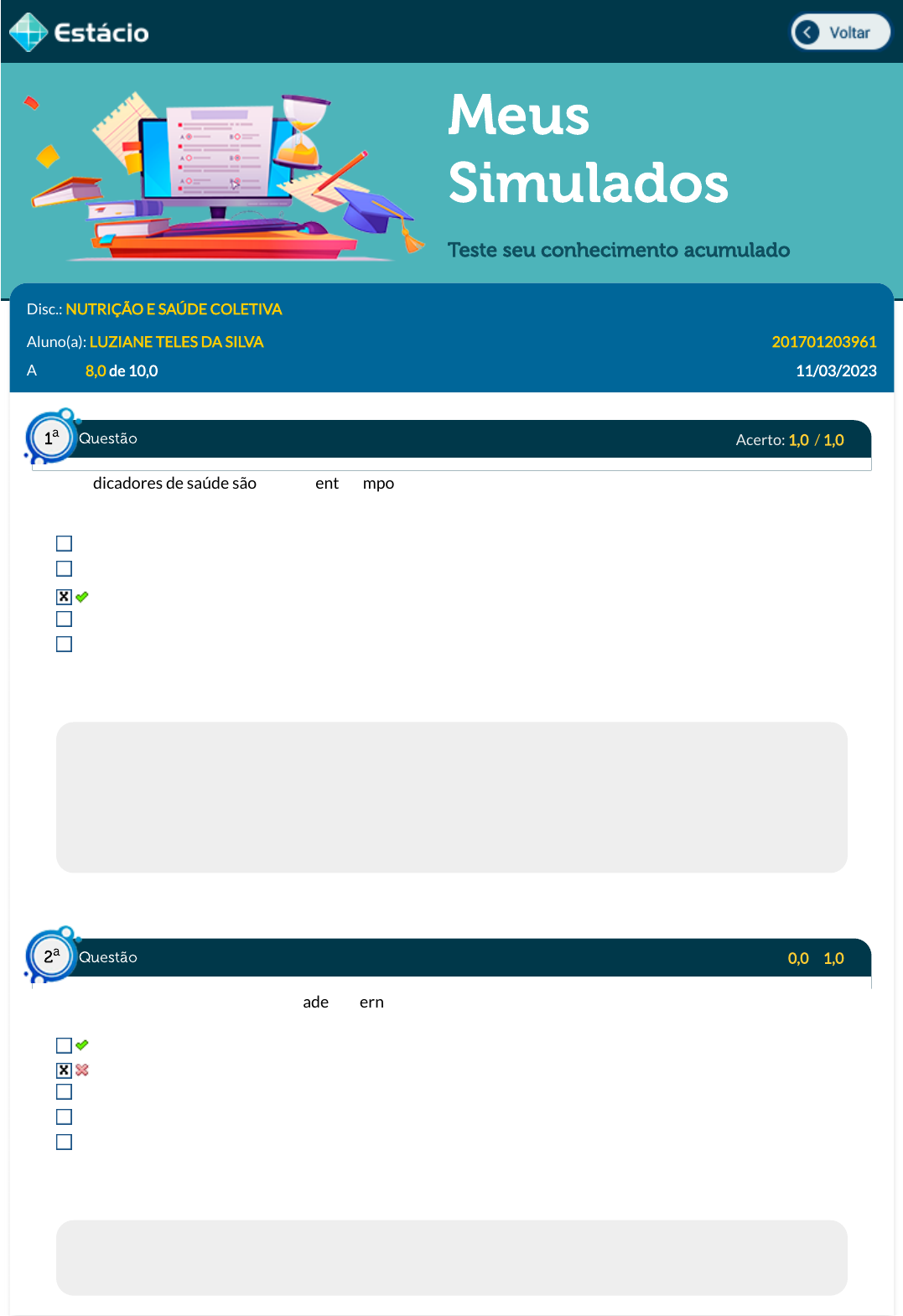 12/03/2023, 15:42 Estácio: Alunos https://simulado.estacio.br/alunos/ 1/5 Meus Simulados Teste seu conhecimento acumulado Disc.: NUTRIÇÃO E SAÚDE COLETIVA Aluno(a): LUZIANE TELES DA SILVA 201701203961 Acertos: 8,0 de 10,0 11/03/2023 Acerto: 1,0 / 1,0 Os indicadores de saúde são instrumentos importantes que auxiliam os gestores no planejamento das ações e na tomada de decisão. Espera-se que um bom indicador apresente como atributo: Velocidade Flexibilidade Con�abilidade Agilidade Viabilidade Respondido em 12/03/2023 00:34:19 Explicação: Para que possa cumprir sua função de mensuração, o bom indicador deve atender a alguns critérios de qualidade essenciais. A saber: 1) Validade -capacidade de representar, com a maior proximidade possível, a realidade que se deseja medir e modi�car; 2) Con�abilidade - origem em fontes con�áveis, que utilizem metodologias reconhecidas e transparentes de coleta, processamento e divulgação; e 3) Simplicidade - de fácil obtenção, construção, manutenção, comunicação e entendimento pelo público em geral. Acerto: 0,0 / 1,0 Para o cálculo da razão de mortalidade materna, no numerador, devem ser usados os dados de: Mortes de mulheres em idade fértil Mortes de mulheres durante a gravidez Nascidos vivos População feminina Gestantes Respondido em 12/03/2023 00:34:43 Explicação: A resposta correta é: Mortes de mulheres em idade fértil Questão1 a Questão2 a https://simulado.estacio.br/alunos/inicio.asp javascript:voltar(); 12/03/2023, 15:42 Estácio: Alunos https://simulado.estacio.br/alunos/ 2/5 Acerto: 1,0 / 1,0 (UNESP/2019) Em seu processo de transição demográ�ca, a população brasileira registrou mudanças relacionadas à revolução médico-sanitária. Essas mudanças provocaram: A redução da taxa de dependência e a diminuição do número de idosos A ampliação da taxa de natalidade e o aumento da população relativa. A redução da taxa de fertilidade e a diminuição da população absoluta. A redução da taxa de mortalidade e o aumento da expectativa de vida. A ampliação da taxa de fecundidade e a diminuição da quantidade de adultos Respondido em 12/03/2023 00:35:05 Explicação: A resposta certa é: A redução da taxa de mortalidade e o aumento da expectativa de vida. Acerto: 1,0 / 1,0 (SECRETARIA DE SAÚDE DE PERNAMBUCO PROGRAMA DE RESIDÊNCIA EM ÁREA MULTIPROFISSIONAL E UNIPROFISSIONAL DE SAÚDE PROCESSO SELETIVO/2018, 2018) Acerca dos aspectos da transição epidemiológica observada no Brasil, é CORRETO a�rmar que: Atinge de igual maneira todas as regiões do Brasil, não havendo especi�cidades loco-regionais relacionadas a aspectos socioeconômicos. Apesar da alta carga das doenças crônicas na atualidade, faz-se necessário o controle dos agravos infecciosos bem como das doenças crônicas não transmissíveis concomitantemente Apresenta uma ruptura com o cenário global epidemiológico devido à prevalência das doenças infectocontagiosas. Não permite estimar acerca da transição epidemiológica em virtude das grandes variabilidades regionais e surtos de doenças negligenciadas. Não há convivência das doenças transmissíveis e crônicas, e sim exclusividade desta. Respondido em 12/03/2023 00:35:26 Explicação: A resposta certa é: Apesar da alta carga das doenças crônicas na atualidade, faz-se necessário o controle dos agravos infecciosos bem como das doenças crônicas não transmissíveis concomitantemente Acerto: 1,0 / 1,0 Com base na classi�cação NOVA proposta no Guia Alimentar para População Brasileira, quais desses alimentos são considerados processados? Geleia de morango, polpa de açaí e azeitonas em conserva Lasanha congelada, pipoca para micro-ondas e refrigerante Purê de batata, mingau de aveia e salada de frutas Salgadinho de milho em pacote, gelatina diet e sorvete de �ocos Sal, açúcar e azeite de oliva Respondido em 12/03/2023 00:35:33 Questão3 a Questão4 a Questão5 a 12/03/2023, 15:42 Estácio: Alunos https://simulado.estacio.br/alunos/ 3/5 Explicação: A resposta correta é: Geleia de morango, polpa de açaí e azeitonas em conserva Acerto: 1,0 / 1,0 Diversas cidades impuseram medidas restritivas para o enfrentamento da pandemia do novo coronavírus, determinando a obrigatoriedade do uso de máscara facial no deslocamento pelas ruas. Quando cidadãos se deslocam sem a máscara, podem ser multados por órgão competente. Trata-se de uma medida de intervenção fundamentada primordialmente: Na re�exão crítica quanto ao naturalismo médico No campo da Saúde Pública No campo da Saúde Coletiva Na abordagem minuciosa dos determinantes sociais em saúde Em saberes interdisciplinares, com ênfase na articulação entre Ciências Sociais e Saúde Respondido em 12/03/2023 00:36:05 Explicação: A resposta correta é: No campo da Saúde Pública Acerto: 1,0 / 1,0 As diretrizes que integram a PNAN indicam as linhas de ações para o alcance do seu propósito, capazes de modi�car os determinantes de saúde e promover a saúde da população. São determinadas as seguintes diretrizes, exceto Gestão das Ações de Alimentação e Nutrição e Participação e Controle Social. Determinação do território onde a população está alocada. Vigilância Alimentar e Nutricional e Cooperação e articulação para a Segurança Alimentar e Nutricional. Controle e Regulação dos Alimentos e Pesquisa, Inovação e Conhecimento em Alimentação e Nutrição. Organização da Atenção Nutricional e Promoção da Alimentação Adequada e Saudável. Respondido em 12/03/2023 00:36:16 Explicação: A resposta certa é: Determinação do território onde a população está alocada. Acerto: 0,0 / 1,0 (Prefeitura de Juarez Távora-PB, 2019) Estão inclusas no campo de atuação do Sistema Único de Saúde, todas as alternativas abaixo, exceto: Fiscalização da água para consumo humano Orientação alimentar Formulação de políticas para controle de praga