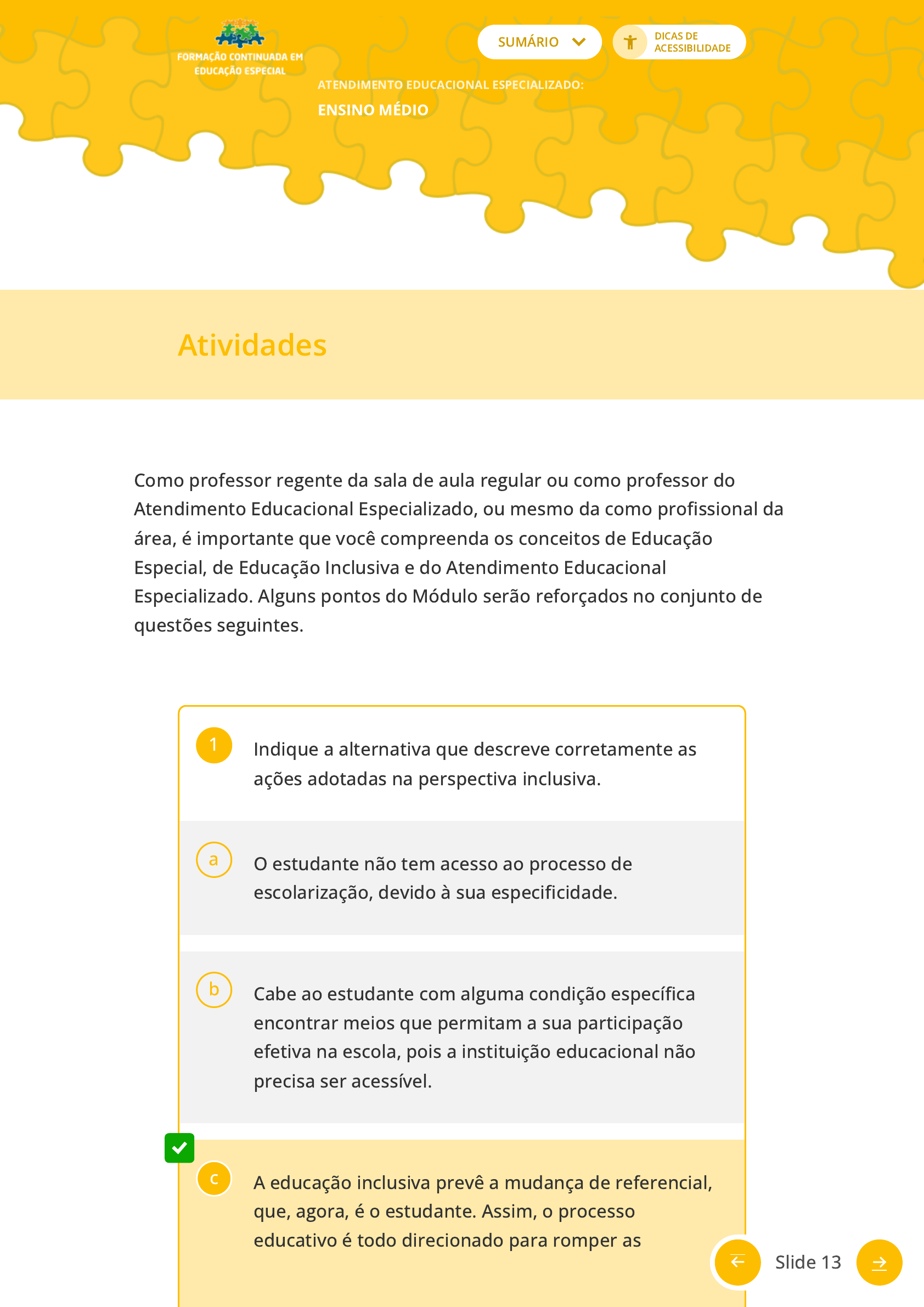 SUMÁRIO ATENDIMENTO EDUCACIONAL ESPECIALIZADO: ENSINO MÉDIO DICAS DE ACESSIBILIDADE Atividades Como professor regente da sala de aula regular ou como professor do Atendimento Educacional Especializado, ou mesmo da como pro�ssional da área, é importante que você compreenda os conceitos de Educação Especial, de Educação Inclusiva e do Atendimento Educacional Especializado. Alguns pontos do Módulo serão reforçados no conjunto de questões seguintes. Indique a alternativa que descreve corretamente as ações adotadas na perspectiva inclusiva. 1 O estudante não tem acesso ao processo de escolarização, devido à sua especi�cidade. a Cabe ao estudante com alguma condição especí�ca encontrar meios que permitam a sua participação efetiva na escola, pois a instituição educacional não precisa ser acessível. b A educação inclusiva prevê a mudança de referencial, que, agora, é o estudante. Assim, o processo educativo é todo direcionado para romper as c Slide 13 javascript:void(0) https://avamec.mec.gov.br/ava-mec-ws/instituicao/semesp/conteudo/modulo/4613/mod1/slide12.html Parabéns! Essa é a resposta certa! Na educação inclusiva ocorre a mudança de referencial, o que possibilita a acessibilidade dos espaços escolares para os estudantes com alguma necessidade especí�ca. barreiras que podem existir em um contexto social não acessível, por exemplo. A educação inclusiva indica que os estudantes com de�ciência, transtorno do espectro autista e altas habilidades ou superdotação não terão acesso aos espaços educacionais, sejam em escolas regulares ou em escolas especializadas. d Retomando o conceito de Educação Especial, indique a alternativa que descreve esse conceito. 2 A Educação Especial é uma modalidade de educação escolar que é facultativa aos estados e municípios, existindo apenas em função da demanda de estudantes e seus familiares. a A Educação Especial é uma modalidade de educação que está presente em todos os níveis e etapas da educação, oferecendo recursos e serviços especializados aos educandos com de�ciência, transtornos globais do desenvolvimento (transtorno do espectro autista) e altas habilidades ou superdotação. b A matrícula de estudante do público-alvo da Educação Especial é facultativa. c Slide 13 javascript:void(0) https://avamec.mec.gov.br/ava-mec-ws/instituicao/semesp/conteudo/modulo/4613/mod1/slide12.html Parabéns! Essa é a resposta certa! A Educação Especial, de acordo com a legislação, tem o caráter transversal, presente em todos os níveis e modalidades de ensino. A Educação Especial é uma exigência na Educação Básica, sendo facultativa na Educação Superior. d A partir do que foi abordado no Módulo I, indique a alternativa que descreve a função do Atendimento Educacional Especializado - AEE: 3 O AEE tem a função de substituir o ensino regular, garantindo ao estudante com alguma necessidade especí�ca um espaço de aprendizagem. a Dentro da sala do ensino regular, o pro�ssional do Atendimento Educacional Especializado tem a função de atuar como um professor de apoio, trocando de lugar com o professor regente. b O pro�ssional do Atendimento Educacional Especializado tem a função de acompanhar os estudantes do ensino regular, sanando suas dúvidas, na sala de aula, sempre que possível. c O Atendimento Educacional Especializado tem como função identi�car, elaborar e organizar recursos pedagógicos e de acessibilidade que eliminem as barreiras para a plena participação dos estudantes do público-alvo da Educação Especial, considerando suas necessidades especí�cas. d Slide 13 javascript:void(0) https://avamec.mec.gov.br/ava-mec-ws/instituicao/semesp/conteudo/modulo/4613/mod1/slide12.html Parabéns! Essa é a resposta certa! O Atendimento Educacional Especializado tem a função de elaborar ferramentas que minimizem as barreiras que prejudicam o processo de escolarização do estudante com alguma necessidade especí�ca. Retomando o que foi apresentado, indique a alternativa correta, segundo a visão do Atendimento Educacional Especializado, conforme consta no Decreto nº 7.611, de 17 de novembro de 2011. 4 O AEE pode atuar de forma a complementar o ensino regular, proporcionando aos estudantes com de�ciência, transtorno do espectro autista e altas habilidades ou superdotação, condições de participarem do processo de escolarização. a O AEE deve atuar na suplementação dos estudantes que possuem di�culdade de aprendizagem, possibilitando o acesso a conceitos e conteúdos extras. b A suplementação e a complementação que são oferecidas pelo AEE devem ser substitutivas do trabalho pedagógico do professor regente, possibilitando o processo inclusivo. c A complementação ao processo de escolarização regular do estudante com alguma necessidade especí�ca não é oferecida pelo AEE, devendo o estudante encontrar meios que possibilitem a sua permanência na escola. d Slide 13 javascript:void(0) https://avamec.mec.gov.br/ava-mec-ws/instituicao/semesp/conteudo/modulo/4613/mod1/slide12.html