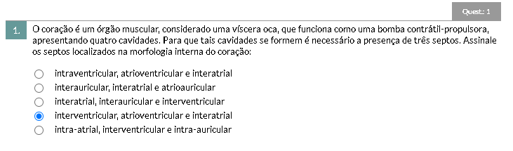 coração é um órgão muscular, considerado uma oca, que funciona como uma bomba contrátil-propulsora apresentando quatro cavidades. Para que tais cavidades se formem é necessário a presença de três septos. Assinale os septos localizados na morfologia interna do coração: intraventricular, atrioventricular e interatrial interauricular, interatrial e atrioauricular interatrial, interauricular e interventricular interventricular, atrioventricular e interatrial intra-atrial, interventricular e intra-auricular