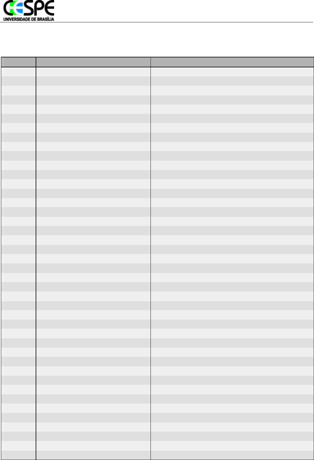 Universidade de Brasília Centro de Seleção e de Promoção de Eventos 1o Vestibular de 2002 – Candidatos Selecionados Página 1 de 11 Área: CIÊNCIAS INSCRIÇÃO NOME CURSO 16350 ACLESIO BESERRA MOREIRA MATEMATICA(BACHARELADO/LICENCIATURA) 17869 ADAM VICTOR NAZARETH BRANDIZZI CIENCIA DA COMPUTACAO(BACHARELADO) 00030 ADELMO DE OLIVEIRA TEIXEIRA MARINHO EDUCACAO FISICA 23305 ADRIANA AMARAL DA SILVA ENGENHARIA FLORESTAL 00145 ADRIANO ABREU RANGEL INFORMATICA(LICENCIATURA) – NOTURNO 00158 ADRIANO FERREIRA CARATTI ENGENHARIA CIVIL 00218 AKEMI VIDIGAL QUIMICA(LICENCIATURA) – NOTURNO 25730 ALBERTO DE OLIVEIRA NASCIMENTO ENGENHARIA MECATRONICA 25736 ALESSANDRA DUARTE GUIMARAES E SILVA ODONTOLOGIA 00293 ALESSANDRA KEMPER CIENCIAS BIOLOGICAS(BACHARELADO/LICENCIATURA) 00305 ALESSANDRA OLIVEIRA SILVA ENGENHARIA FLORESTAL 16398 ALESSANDRO DOMBROSKI SANTOS AGRONOMIA 00379 ALEXANDRE ALMEIDA BURSZTYN CIENCIAS BIOLOGICAS(BACHARELADO/LICENCIATURA) 00394 ALEXANDRE BRANDAO SE MEDICINA 25744 ALEXANDRE COSTA DE FREITAS ENGENHARIA DE REDES DE COMUNICACAO 00422 ALEXANDRE LADA DO CARMO ENGENHARIA DE REDES DE COMUNICACAO 00466 ALFREDO ASSIS DE CARVALHO ENGENHARIA CIVIL 00510 ALINE CATUNDA DE CLODOALDO PINTO MEDICINA 00526 ALINE DE SOUZA LEMOS GEOLOGIA 00587 ALISON DA SILVA ALEXANDRE FARMACIA 18155 AMAURY LEMES DA SILVA INFORMATICA(LICENCIATURA) – NOTURNO 18157 ANA BARBARA ROCHA SILVA MEDICINA VETERINARIA 00745 ANA CAROLINA DE CARVALHO FONSECA MEDICINA 25785 ANA CAROLINA VALADAO LACERDA AGRONOMIA 25786 ANA CAROLINE DE OLIVEIRA MEDICINA 00813 ANA CECILIA NEIVA GONDIM MEDICINA 25794 ANA FLAVIA RIBEIRO DOS SANTOS CIENCIAS BIOLOGICAS(BACHARELADO/LICENCIATURA) 01031 ANA RACHEL CARVALHO SILVA PSICOLOGIA 16465 ANA RAVENA ALCANTARA DA COSTA ENGENHARIA ELETRICA 01049 ANAND KABIRA DACIER LOBATO FISICA(BACHARELADO/LICENCIATURA/FISICA COMPUTACIONAL) 01112 ANDRE ANDERSON DA SILVA NUNES MATEMATICA(BACHARELADO/LICENCIATURA) 18312 ANDRE LUIZ DE OLIVEIRA SANTOS QUIMICA(LICENCIATURA) – NOTURNO 01215 ANDRE MENEZES SABOIA GEOLOGIA 01264 ANDREA CAMILA PETRY FARMACIA 18375 ANDREW BILLER MATEMATICA(BACHARELADO/LICENCIATURA) 25840 ANDREY SUANNO BUTKEWITSCH QUIMICA(BACHARELADO) 01358 ANEKARINE SCHERER CIENCIAS BIOLOGICAS(LICENCIATURA) – NOTURNO 01398 ANITA DE MEDEIROS RODRIGUES MEDICINA VETERINARIA 01480 ANTONIO DOS ANJOS COSTA JUNIOR INFORMATICA(LICENCIATURA) – NOTURNO 01482 ANTONIO EMANUEL GOICOCHEA PSICOLOGIA 01557 ARIANE JEANILE SILVA ODONTOLOGIA 01585 ARTHUR ASSUMPCAO ENGENHARIA ELETRICA Universidade de Brasília Centro de Seleção e de Promoção de Eventos 1o Vestibular de 2002 – Candidatos Selecionados Página 2 de 11 Área: CIÊNCIAS INSCRIÇÃO NOME CURSO 01608 ARTUR PENHA SOARES CIENCIA DA COMPUTACAO(BACHARELADO) 01705 BARBARA SANTOS DE MIRANDA QUIMICA(BACHARELADO) 25882 BENO GUILHERME ZIECH ENGENHARIA FLORESTAL 01799 BONIFACIO CARNEIRO MACHADO JUNIOR GEOLOGIA 18537 BRAITNER LOBATO DA SILVA MATEMATICA(BACHARELADO/LICENCIATURA) 01821 BRENO NERI CARNEIRO ENGENHARIA DE REDES DE COMUNICACAO 25890 BRENO PRADO DE SOUSA JUNIOR QUIMICA(BACHARELADO) 01836 BRUNA DE AS OLIVEIRA MEDICINA 25892 BRUNA LEANDRO PEREIRA FARMACIA 01866 BRUNNO MACHADO DE CAMPOS ALVES MEDICINA VETERINARIA 28277 BRUNO ALEXSANDER MARTINS DA SILVA ENGENHARIA DE REDES DE COMUNICACAO 18559 BRUNO BORGES DE CASTRO ENGENHARIA MECATRONICA 18560 BRUNO CHAVIER RAMOS MATEMATICA(LICENCIATURA) – NOTURNO 18562 BRUNO DA SILVA ABREU CIENCIA DA COMPUTACAO(BACHARELADO) 25899 BRUNO DIAS BATISTA CIENCIAS BIOLOGICAS(LICENCIATURA) – NOTURNO 01936 BRUNO GIANCRISTOFORO QUEIROZ ENGENHARIA DE REDES DE COMUNICACAO 01991 BRUNO PEDRO ALVES DE CAMPOS ENGENHARIA MECANICA 02065 CALIFA ABUD CURY FILHO EDUCACAO FISICA 18616 CAMILA LARA BARCELOS MEDICINA 18667 CARLOS EDUARDO LUSTOSA SANTOS FISICA(LICENCIATURA) – NOTURNO 18670 CARLOS EDUARDO MARTINEZ DE MEDEIROS AGRONOMIA 02384 CARLOS MARN COSTA DE OLIVEIRA ENGENHARIA MECATRONICA 02416 CAROLINA AVILA RAMALHO ENGENHARIA CIVIL 02509 CAROLINA ZUPPA KOHNERT SEIDLER NUTRICAO 02603 CELSO DE OLIVEIRA ENGENHARIA CIVIL 25967 CELSO LUIZ LISITA FILHO ENGENHARIA MECATRONICA 02630 CHARLES ANTONIO NASCIMENTO COSTA INFORMATICA(LICENCIATURA) – NOTURNO 02657 CHRISTIANO NOGUEIRA M DE V CHAVES FISICA(LICENCIATURA) – NOTURNO 23589 CICERO RODRIGUES SILVA MATEMATICA(BACHARELADO/LICENCIATURA) 25514 CIMARA FRANCISCA MONTEIRO GEOLOGIA 02684 CINTHIA BAENA PEREIRA QUIMICA(LICENCIATURA) – NOTURNO 18784 CINTHIA DOMINGUES DA SILVA NUTRICAO 02719 CLARA FERREIRA CERQUEIRA PINTO NUTRICAO 02737 CLARICE RODRIGUES DA COSTA AGRONOMIA 02785 CLAUDIA CRUZ DA SILVA ENGENHARIA DE REDES DE COMUNICACAO 02802 CLAUDIA NETO GONCALVES NEVES DA SILVA MEDICINA 02808 CLAUDIA RAMOS DE MIRANDA MEDICINA 02839 CLAUDIO ERASMO LIRA DANTAS FISICA(LICENCIATURA) – NOTURNO 02849 CLAUDIO MAURILIO DA SILVA LIMA MATEMATICA(LICENCIATURA) – NOTURNO 18834 CLAUDIO PIRES DOS SANTOS ENFERMAGEM E OBSTETRICIA 23621 CLEIDIANE SANTOS DA SILVA ENFERMAGEM E OBSTETRICIA 14941 CLEIDSON NOGUEIRA DIAS ESTATISTICA Universidade de Brasília Centro de Seleção e de Promoção de Eventos 1o Vestibular de 2002 – Candidatos Selecionados Página 3 de 11 Área: CIÊNCIAS INSCRIÇÃO NOME CURSO 02989 CRISTIANO DIAS ALVES EDUCACAO FISICA 03024 CRISTOVAO MEDEIROS REZENDE QUIMICA(LICENCIATURA) – NOTURNO 03094 DANIEL BARBOSA DA SILVA FISICA(BACHARELADO/LICENCIATURA/FISICA COMPUTACIONAL) 03110 DANIEL CARNEIRO DE ANDRADE MEDICINA VETERINARIA 03125 DANIEL DE JESUS SOUSA SANTOS AGRONOMIA 03139 DANIEL DUARTE ROCHA DA SILVA ODONTOLOGIA 18992 DANIEL PEIXOTO LIMA MATEMATICA(LICENCIATURA) – NOTURNO 03231 DANIEL YOSHIMITSU KUWAE ENGENHARIA FLORESTAL 19042 DANIELLE ALVIM DE SOUZA CIENCIAS BIOLOGICAS(LICENCIATURA) – NOTURNO 03338 DANIELLE ANANIAS BARBOZA PSICOLOGIA 03364 DANIELLE MATIAS ARAUJO GEOLOGIA 03375 DANIELLE SOARES DE MACEDO PSICOLOGIA 03391 DANILO DE QUEIROZ MATOS ENGENHARIA FLORESTAL 03399 DANILO GUSTAVO RODRIGUES DE OLIVEIRA CIENCIAS BIOLOGICAS(BACHARELADO/LICENCIATURA) 03406 DANILO NAVA PINTO DE