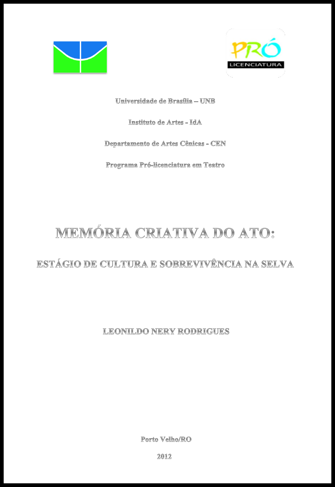 0 1 UNIVERSIDADE DE BRASÍLIA INSTITUTO DE ARTES PROGRAMA PRÓ-LICENCIATURA – LICENCIATURA EM TEATRO MEMÓRIA CRIATIVA DO ATOR: ESTÁGIO DE CULTURA E SOBREVIVÊNCIA NA SELVA Autor: LEONILDO NERY RODRIGUES Porto Velho/RO 2012 2 LEONILDO NERY RODRIGUES MEMÓRIA CRIATIVA DO ATOR: ESTÁGIO DE CULTURA E SOBREVIVÊNCIA NA SELVA Trabalho de Conclusão de Curso apresentado ao Programa Pró-licenciatura de Teatro da Universidade de Brasília, como requisito para obtenção do grau de Licenciado em Teatro, sob a orientação da Professora Mestre Sanântana Paiva Vicencio. Porto Velho/RO 2012 3 FOLHA DE APROVAÇÃO Orientadora: Professora Mestre Sanântana Paiva Vicencio Examinadora: Professora Rita Gusmão Examinadora: Professora Maria Cristina Silva 4 DEDICATÓRIA Dedicação especial a Minha Mãe Dona Erivan Nery Rodrigues, meu pai Luiz Rodrigues (in memória) e toda a milha família. Dedico também às pessoas que trabalharam comigo na prática de teatro, dança e cinema desde 1990 até este ano de 2012, e aos atuais alunos do Grupo Mnemônico de Artes do Batalhão Alferes de Rondônia do Colégio Tiradentes da Polícia Militar de Rondônia. 5 AGRADECIMENTO Agradeço a Deus pela minha vida! Agradeço ao meu melhor amigo Nosso Senhor Jesus Cristo pela Inspiração! Muito obrigado minha querida orientadora Professora Mestre Sanântana Paiva Vicencio! Agradeço a todos os que me ajudaram a concluir esse curso, aos professores, tutores e as duas pessoas que não me deixaram desistir do curso, “os culpados”: Coordenadora Professora Ângela Cavalcante e o Tutor Professor Elcias Villar. Deixo aqui um agradecimento especial à pessoa mais inteligente que conheci na vida, o Professor Doutor em Artes Cênicas Jorge das Graças Velos, pelo carinho e paciência. 6 RESUMO Esse trabalho aborda as formas de memórias que um ator pode ter através da imaginação, observação e ações físicas. Apresenta o Estágio de Cultura e Sobrevivência na Selva, além de propor a montagem de um espetáculo teatral. Visa aprofundar e melhorar o grau de conhecimento dos estudantes, com orientações e atividades práticas na floresta para que o aluno possa descobrir sua própria técnica através da improvisação e assim compor personagens, numa escola de investigação e criação. Palavras-Chave: memória criativa, teatro na floresta, memória dos sentidos, dramatização e ação física. 7 SUMÁRIO INTRODUÇÃO.........................................................................................................................8 CAPITULO 1 - MEMÓRIA CRIATIVA 1.1 Linguagens Corporais.......................................................................................................11 1.2 Incorporação das Imagens..............................................................................................14 CAPITULO 2 – CULTURA E TEATRO NA FLORESTA 2.1 O Estágio...........................................................................................................................16 2.2 Sobre o Espetáculo “A Menina e A Helicônia”.............................................................18 CAPÍTULO 3 – ATIVIDADES NO ESTÁGIO 3.1 Olho da Mente..................................................................................................................20 3.2 Memória dos Sentidos – AVOT......................................................................................22 3.2.1 Audição...............................................................................................................23 3.2.2 Visão....................................................................................................................26 3.2.3 Olfato..................................................................................................................28 3.2.4 Tato.....................................................................................................................29 3.3 Dramatização.....................................................................................................................32 3.4 Avaliação e Sarau.............................................................................................................35 CONCLUSÃO.........................................................................................................................37 REFERÊNCIAS BIBLIOGRÁFICAS..................................................................................39 8 INTRODUÇÃO Este trabalho é proposto com o intuito de explanar sobre as formas de memória que uma pessoa possa ter por meio observação, das ações físicas e os sentidos humano, seja essa pessoa um ator profissional ou um estudante de ensino básico. A escolha do tema Memória Criativa do Ator, foi inspirada no grupo de teatro que criei no dia 4 de novembro de 1990, na Escola Estadual Marechal Castelo Branco da Cidade de Porto Velho - Rondônia, com o nome de Grupo Teatral Mnemônico, que significa “arte e técnica de desenvolver a memória”. Esse grupo trabalha há 21 anos com teatro, dança e cinema. Hoje com o nome de Grupo Mnemônico de Artes vem trabalhando com alunos do Colégio Tiradentes da Polícia Militar de Rondônia. O objetivo do trabalho é propor aos estudantes de teatro atividades para experimentar as formas de memórias que um artista possa descobrir; proporcionar aos alunos do ensino básico a oportunidade de praticarem o teatro na floresta; além de utilizarem as orientações como experimentos nos estudos de outras disciplinas. Os objetivos específicos visam realizar os estudos para que os alunos possam conhecer na prática as formas que eles podem exercitar suas memórias; ajudar o ator utilizando sua criatividade a descobrir uma forma de criar personagens. Ademais, que sirva como orientação para os alunos do ensino básico a trabalharem com textos tanto no teatro como em outras atividades de estudos e trabalhos. Mostrar para a escola, a família e outros segui