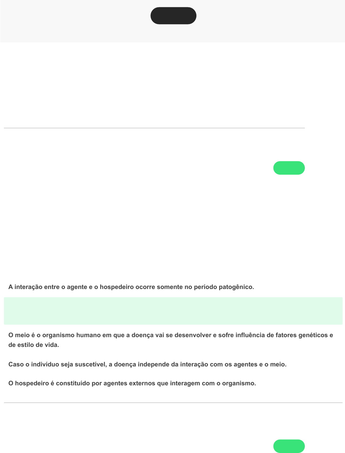 07/02/2023 23:18 Comentários https://sereduc.blackboard.com/ultra/courses/_152576_1/grades/assessment/_7383993_1/overview/attempt/_24071213_1/review/inline-feedback… 1/7 Conteúdo do exercício Ocultar opções de resposta Pergunta 1 1 / 1 O modelo da História Natural da Doença busca explicações a partir da tríade causal (agente, hospedeiro e meio). É um modelo que considera a multicausalidade das doenças a partir de um processo interativo desses três atores. Com base no texto acima e nos conhecimentos sobre modelo de História Natural da Doença, assinale a alternativa correta: A interação entre o agente e o hospedeiro ocorre somente no período patogênico. Resposta correta Idade, sexo, estilo de vida e condição psicossocial são exemplos de fatores que interferem na suscetibilidade do hospedeiro. O meio é o organismo humano em que a doença vai se desenvolver e sofre influência de fatores genéticos e de estilo de vida. Caso o indivíduo seja suscetível, a doença independe da interação com os agentes e o meio. O hospedeiro é constituído por agentes externos que interagem com o organismo. Pergunta 2 1 / 1 10/10 Nota final Enviado em: 07/02/23 23:16 (AMT) 07/02/2023 23:18 Comentários https://sereduc.blackboard.com/ultra/courses/_152576_1/grades/assessment/_7383993_1/overview/attempt/_24071213_1/review/inline-feedback… 2/7 Ocultar opções de resposta Durante muito tempo o conceito de saúde era limitado à ausência de doenças. Esse conceito vem sendo estudado constantemente e tem ganhado novos significados mais amplos e mais complexos. Em 1947, a Organização Mundial de Saúde propôs uma definição para saúde. Considerando essas informações e o conteúdo estudado sobre os conceitos de saúde, analise as afirmativas a seguir e assinale V para a(s) verdadeira(s) e F para a(s) falsa(s). I. ( ) O conceito afirma que “saúde é um estado de completo bem-estar físico, mental e social, e não meramente a ausência de doenças”. II. ( ) O conceito da OMS traz a saúde como algo tangível, que pode ser determinada através de indicadores epidemiológicos. IV. ( ) O conceito é considerado insuficiente para a elaboração de políticas, pois não existe um consenso mundial para definição de um “estado de completo bem-estar”, sendo que este varia conforme o contexto social e opções pessoais. V. ( ) O conceito afirma que “a saúde é o resultado das formas de organização social da produção, as quais podem gerar grandes desigualdades nos níveis de vida”. Agora, assinale a alternativa que apresenta a sequência correta: F, V, F, F, F. V, F, V, F, V. V, F, V, V, F. Resposta corretaV, F, F, V, F. F, V, V, V, F. Pergunta 3 1 / 1 Na busca por explicações sobre o processo de adoecimento, diversas teorias foram elaboradas ao longo da história. Um personagem histórico muito importante nesse processo foi Hipócrates, ele publicou o tratado “os ares e os lugares”, no ano 400 AC. Com base nessa informação e no conteúdo estudado sobre a processo saúde-doença, analise as afirmativas a seguir: I. No tratado “os ares e os lugares” Hipócrates passou a relacionar a moradia, a água para beber e os ventos com a saúde humana. II. A teoria microbiana entendia que a doença era causada pela inalação de gases fétidos resultado da decomposição de matéria orgânica. III. A teoria mista considera que a melhor resposta será obtida a partir do estudo complementar de todas as teorias já criadas. IV. No século XX surgiu nos Estados Unidos uma nova forma de pensar saúde através da ressignificação do “Centro de Saúde”. Está correto apenas o que se afirma em: 07/02/2023 23:18 Comentários https://sereduc.blackboard.com/ultra/courses/_152576_1/grades/assessment/_7383993_1/overview/attempt/_24071213_1/review/inline-feedback… 3/7 Ocultar opções de resposta Ocultar opções de resposta I e III. II e IV. I e II. Resposta corretaI e IV. III e IV. Pergunta 4 1 / 1 Para a Comissão Nacional sobre os Determinantes Sociais da Saúde (CNDSS), os Determinantes Sociais de Saúde são os fatores sociais, econômicos, culturais, étnicos/raciais, psicológicos e comportamentais que influenciam a ocorrência de problemas de saúde e seus fatores de risco na população. Com base nessa informação e no conteúdo estudado sobre os determinantes sociais de saúde, é correto afirmar que: O acesso a renda e moradia influenciam no processo saúde-doença apenas no que tange à saúde mental, uma vez que a saúde biológica é relacionada ao saneamento básico e aos serviços de saúde. As políticas de saúde devem contemplar apenas aspectos relacionados à assistência ao doente, haja vista que os demais fatores dizem respeito a cada ser humano individualmente. Resposta correta O acesso à água limpa, esgoto, habitação adequada, alimentos saudáveis e nutritivos, emprego seguro e realizador, ambientes de trabalho saudáveis são fundamentais no processo saúde/doença. Os determinantes sociais de saúde são facilmente alterados através de políticas e campanhas que estimulem mudança de comportamento da população. As políticas macroeconômica, de mercado de trabalho e de proteção ambiental se constituem em determinantes sociais interferindo na saúde coletiva com pouca interferência na saúde individual. Pergunta 5 1 / 1 07/02/2023 23:18 Comentários https://sereduc.blackboard.com/ultra/courses/_152576_1/grades/assessment/_7383993_1/overview/attempt/_24071213_1/review/inline-feedback… 4/7 Ocultar opções de resposta Ocultar opções de resposta No século XIX uma epidemia de cólera assolava a cidade de Londres. O médico britânico, John Snow, considerado o pai da epidemiologia, a partir de sua investigação, associou que as taxas de mortalidade por cólera eram maiores, conforme a proximidade a um poço de água pública localizado na Broad Street. Apesar de não comprovar a origem da doença, as informações foram suficientes para con