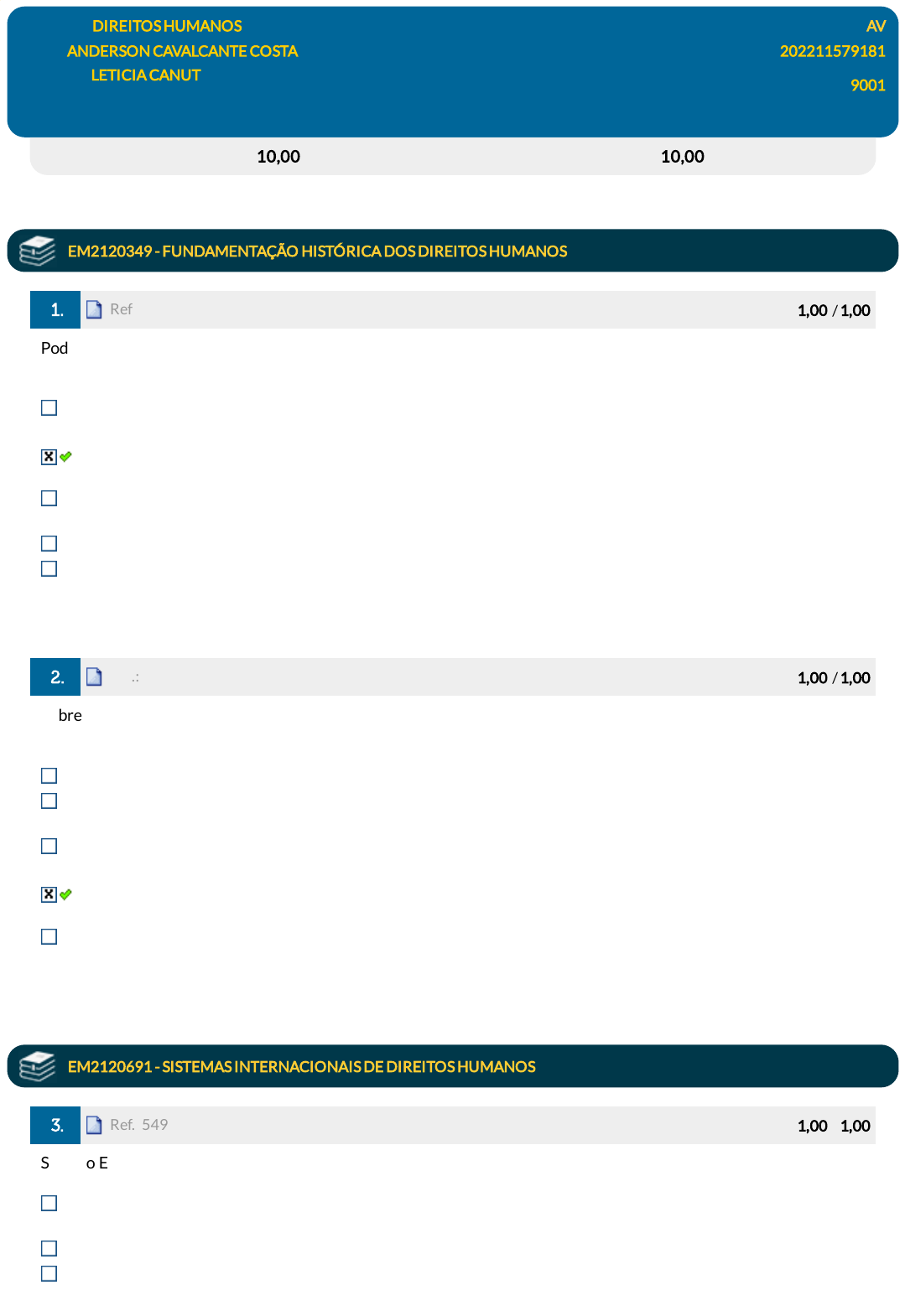 Disciplina: DIREITOS HUMANOS AV Aluno: ANDERSON CAVALCANTE COSTA 202211579181 Professor: LETICIA CANUT Turma: 9001 DGT0043_AV_202211579181 (AG) 21/02/2023 10:52:44 (F) Avaliação: 10,00 pts Nota SIA: 10,00 pts EM2120349 - FUNDAMENTAÇÃO HISTÓRICA DOS DIREITOS HUMANOS 1. Ref.: 5558605 Pontos: 1,00 / 1,00 Podemos caracterizar os Direitos Humanos como universais, interdependentes e indivisíveis. Sobre essas características, assinale a alternativa correta: Os direitos são indivisíveis pois não podem ser aceitos por um só país. Para que ele funcione, é necessário que todos estejam comprometidos legalmente. Dizer que os direitos são interdependentes signi�ca que todos precisam ser garantidos ao mesmo tempo e nenhum é mais importante que o outro; A interdependência dos Direitos Humanos signi�ca que, ao aceitar a Declaração, os países se tornam interdependentes e precisam apoiar economicamente e politicamente; Direitos Humanos devem ser contextuais, nunca sendo entendidos como efetivamente universais. Quando falamos que os Direitos Humanos são universais, signi�ca dizer que eles foram aceitos e são aplicados em todos os países do mundo; 2. Ref.: 5514357 Pontos: 1,00 / 1,00 Sobre a teoria escrita por Hannah Arendt de que os Direitos Humanos teriam sofrido uma ruptura e que precisavam ser reconstruídos, podemos a�rmar que: A autora judia foi pan�etária no exercício de condenação do nazismo na Segunda Guerra Mundial. Os Direitos Humanos se romperam durante a Segunda Guerra Mundial, e a Guerra Fria decretou que a sociedade não seria capaz de reconstruí-los; A ruptura aconteceu unicamente por conta das ações fascistas de alguns países europeus e, uma vez que esses regimes fossem derrubados, os Direitos Humanos estariam reconstruídos; A ruptura dos Direitos Humanos aconteceu com as políticas imperialistas e fascistas da Europa, e a sua reconstrução precisa garantir que todos acessem seus direitos sem nenhuma restrição; As políticas dos Estados europeus que expulsaram milhares de cidadãos dos seus territórios foram as responsáveis pela ruptura dos Direitos Humanos, e isso deve ser revertido com as políticas de imigração. EM2120691 - SISTEMAS INTERNACIONAIS DE DIREITOS HUMANOS 3. Ref.: 5499699 Pontos: 1,00 / 1,00 Sobre o Estatuto de Roma do Tribunal Penal Internacional, assinale a alternativa correta: É um tratado internacional sobre matéria penal que ainda não entrou em vigor devido ao fato de não ter ainda atingido o número necessário de rati�cações pelos Estados. É o tratado internacional responsável pela criação da Corte Internacional de Justiça. É o tratado internacional que foi responsável pela criação do Tribunal de Nuremberg. javascript:alert('C%C3%B3digo da quest%C3%A3o: 5558605.'); javascript:alert('C%C3%B3digo da quest%C3%A3o: 5514357.'); javascript:alert('C%C3%B3digo da quest%C3%A3o: 5499699.'); É um tratado internacional de proteção dos direitos humanos que foi adotado no âmbito do sistema regional europeu de direitos humanos. É um tratado internacional que estabelece normas de Direito Internacional Penal. 4. Ref.: 5573502 Pontos: 1,00 / 1,00 Sobre os sistemas internacionais de proteção dos direitos humanos, assinale a alternativa correta: A proteção internacional dos direitos humanos é feita atualmente por meio dos sistemas internacionais de proteção dos direitos humanos, arquitetados tanto em nível global como regional. Os sistemas regionais de proteção dos direitos humanos não guardam qualquer relação com o sistema onusiano, uma vez que cada sistema atua de maneira independente e não dialogam entre si. O sistema interamericano de proteção dos direitos humanos admite o acesso direito do indivíduo à Corte Interamericana de Direitos Humanos. O sistema regional africano de direitos humanos se encontra em um nível intermediário de desenvolvimento em relação aos sistemas europeu e interamericano. O sistema regional europeu é atualmente o mais desenvolvido, sendo o único sistema regional que admite o acesso direto do indivíduo a uma corte regional de direitos humanos. EM2120722 - TEORIA DOS DIREITOS HUMANOS 5. Ref.: 5316389 Pontos: 1,00 / 1,00 ''A visão Dimensional dos Direitos Humanos é mais inclusiva e permite uma melhor compreensão dos direitos inerentes e essenciais ao ser humano na atualidade do que a visão Geracional, mais antiga''. O texto acima é: Um equívoco, pois tais classi�cações têm apenas mudança na nomenclatura Uma explicação da Universalidade dos Direitos Humanos Uma comparação entre classi�cação Geracional e Dimensional dos Direitos Humanos Um equívoco, pois não se aplicam aos Direitos Humanos ou Fundamentais Uma comparação entre Direitos Humanos e Direitos Fundamentais 6. Ref.: 5316390 Pontos: 1,00 / 1,00 ''O alcance dos Direitos Humanos não exclui qualquer ser humano, por qualquer razão ligada a pessoa humana. Fatores locais e normativos podem fazer a proteção não chegar até um indivíduo, mas sendo possível chegar, toda pessoa humana é agraciada''. O texto acima re�ete qual característica dos Direitos Humanos? Imprescritibilidade Universalidade Relatividade Irretroatividade Irrenunciabilidade ENSINEME: A JUSTIÇA NO BRASIL E OS GRUPOS VULNERÁVEIS javascript:alert('C%C3%B3digo da quest%C3%A3o: 5573502.'); javascript:alert('C%C3%B3digo da quest%C3%A3o: 5316389.'); javascript:alert('C%C3%B3digo da quest%C3%A3o: 5316390.'); 7. Ref.: 7661589 Pontos: 1,00 / 1,00 (FCC/2012) Em abril de 2012, ao decidir sobre o pedido formulado na Arguição de Descumprimento de Preceito Fundamental n o 54, o Supremo Tribunal Federal (STF), por maioria e nos termos do voto do Relator, julgou procedente a ação ¿para declarar a inconstitucionalidade da interpretação segundo a qual a interrupção da gravidez de feto anencéfalo é conduta tipi�cada nos artigos 124, 126, 128, incisos I e II, todos do Código Penal¿ (conforme ata de julgamento respectiva, pub