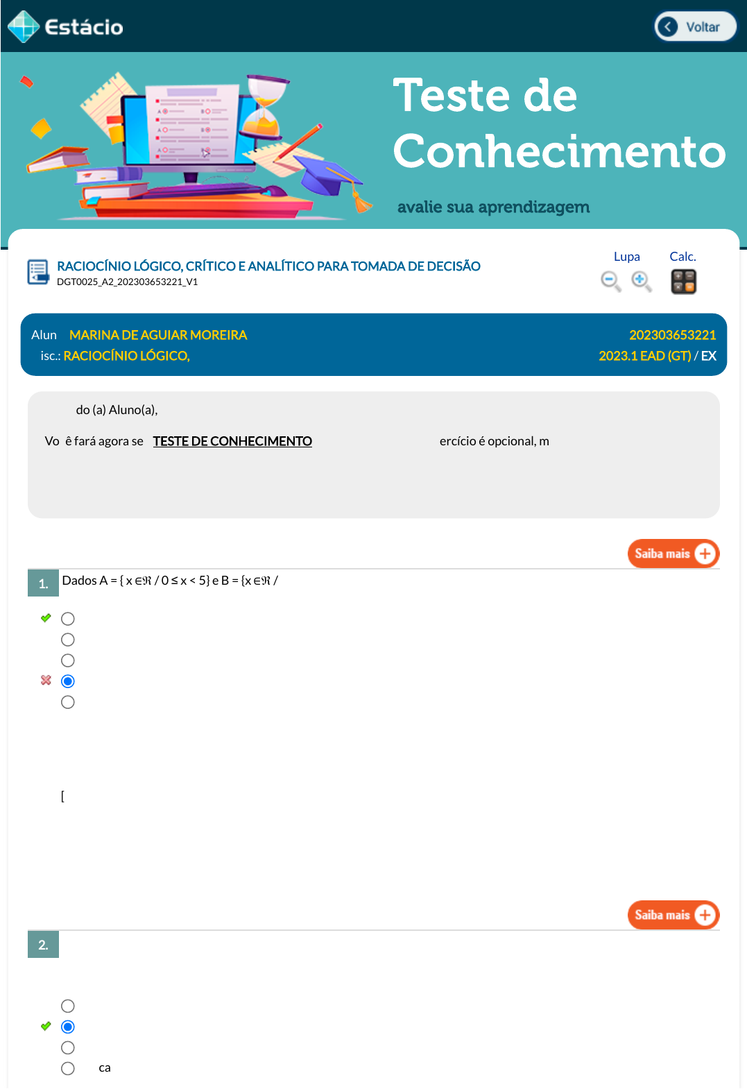 14/03/2023, 10:50 Estácio: Alunos https://simulado.estacio.br/alunos/ 1/4 Teste de Conhecimento avalie sua aprendizagem Dados A = { x ∈ℜ / 0 ≤ x < 5} e B = {x ∈ℜ / 0 ≤ x ≤ 4} , a alternativa que representa A - B é: Em um Processo de Seleção para uma vaga de emprego, observou-se entre todos os candidatos: 5 tinham experiência pro�ssional mas não falava espanhol; 3 falavam espanhol, mas não tinha experiência pro�ssional. Ao todo, 10 candidatos tinham experiência pro�ssional e 7 candidatos não falavam espanhol. O Total de candidatos a essa vaga era de: RACIOCÍNIO LÓGICO, CRÍTICO E ANALÍTICO PARA TOMADA DE DECISÃO Lupa Calc. DGT0025_A2_202303653221_V1 Aluno: MARINA DE AGUIAR MOREIRA Matr.: 202303653221 Disc.: RACIOCÍNIO LÓGICO, 2023.1 EAD (GT) / EX Prezado (a) Aluno(a), Você fará agora seu TESTE DE CONHECIMENTO! Lembre-se que este exercício é opcional, mas não valerá ponto para sua avaliação. O mesmo será composto de questões de múltipla escolha. Após responde cada questão, você terá acesso ao gabarito comentado e/ou à explicação da mesma. Aproveite para se familiarizar com este modelo de questões que será usado na sua AV e AVS. 1. ]4,5[ [-1,4] ]0,4] [-1,5] ]-1,0] Explicação: A = [ 0, 5 [ não inclui o 5 . B = [ 0, 4 ] inclui o 4 . Então a diferença A - intervalo B = ] 4 , 5 [ sem incluir o 4 . 2. 14 candidatos 15 candidatos 11 candidatos 12 candidatos javascript:voltar(); javascript:voltar(); javascript:duvidas('268149','7243','1','8209204','1'); javascript:duvidas('643490','7243','2','8209204','2'); javascript:diminui(); javascript:aumenta(); javascript:calculadora_on(); 14/03/2023, 10:50 Estácio: Alunos https://simulado.estacio.br/alunos/ 2/4 Dentre as sentenças abaixo, assinale a sentença verdadeira: Dados os intervalos reais A = [0, 3] e B = [1, 4], a intersecção do conjunto A com o conjunto B será dada por: Qual diagrama a seguir representa o seguinte conjunto: (A∪B)∩C . 13 candidatos Explicação: Experiência pro�ssioal = P ; falavam espanhol = E ; só Experiência pro�ssioal = só P ; só Espanhol = só E . Observando o diagrama de Venn com a interseção dos círculos desses comjuntos P e E temos : Total P = 10 , só P = 5, só E = 3 .. Então a interseção P e E = P - só P = 10 - 5 = 5 . Pelo Diagrama também se conclui : Total de P ou E = P U E = só P + P e E + só E = 5 = 5 + 3 = 13 . Há ainda 7 candidatos que não falam espanhol . Mas esse conjunto contém o só P = 5 que já foi computado , restando apenas 7 - 5 = 2 candidatos. Então o total de candidatos é = 13 + 2 = 15 3. Z U N = N I U Q = Z Q Ì I R Ì Q Z U N = Z Gabarito Comentado Gabarito Comentado 4. [1, 3] [1, 4] ]0, 4[ ]1, 3[ [0, 4] Gabarito Comentado 5. javascript:duvidas('242700','7243','3','8209204','3'); javascript:duvidas('693239','7243','4','8209204','4'); javascript:duvidas('11700','7243','5','8209204','5'); 14/03/2023, 10:50 Estácio: Alunos https://simulado.estacio.br/alunos/ 3/4 Numa pesquisa com 1100 pessoas sobre quem é fumante de cigarros ou não, obteve-se os seguintes resultado: 350 pessoas fumam, 750 pessoas não fumam, 250 mulheres não fumam e 50 homens fumam cigarros. Pergunta: Quantas mulheres responderam a pesquisa: Se A ⊂ B e B = {10, 23, 12, {1,2}}, então A∪B é: nenhuma das respostas anteriores. Gabarito Comentado 6. 350 mulheres 600 mulheres 250 mulheres 300 mulheres 550 mulheres Gabarito Comentado 7. javascript:duvidas('32348','7243','6','8209204','6'); javascript:duvidas('233783','7243','7','8209204','7'); 14/03/2023, 10:50 Estácio: Alunos https://simulado.estacio.br/alunos/ 4/4 Sendo A={cores da bandeira brasileira}, B={verde, azul, branco, vermelho} , C={vermelho, verde, branco} e D={amarelo, azul}, determine (A∩B∩C)UD: {15, 10}∩{13,10} {1} {10, 23, 12} Ø {10, 23, 12, {1,2}} Gabarito Comentado 8. {verde, vermelho, branco} {azul, vermelho, verde} {azul, verde, amarelo, branco} {azul, amarelo} {branco, vermelho, amarelo} Gabarito Comentado Não Respondida Não Gravada Gravada Exercício inciado em 14/03/2023 10:40:01. javascript:duvidas('101396','7243','8','8209204','8'); javascript:abre_colabore('35105','303798789','6066756405');