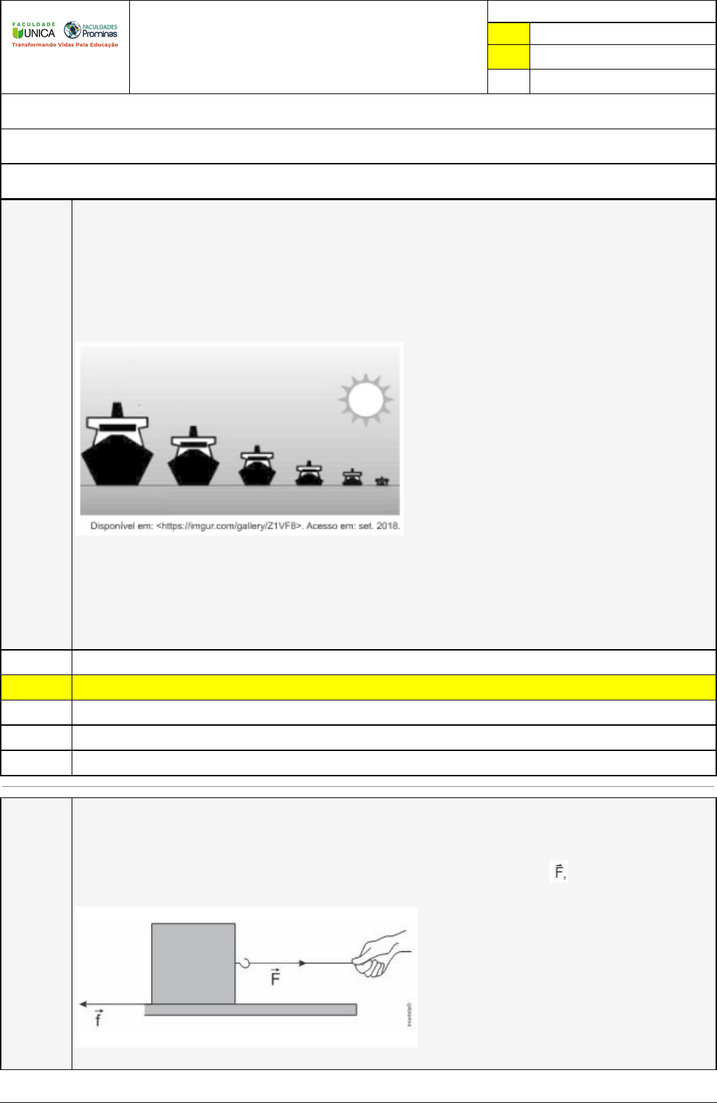 Pincel Atômico - 14/03/2023 13:36:19 1/4 BERENICE BARBOSA DE ALEXANDRE TUSKI Avaliação Online (SALA EAD) Atividade finalizada em 03/10/2022 15:18:44 (506402 / 1) LEGENDA Resposta correta na questão # Resposta correta - Questão Anulada X Resposta selecionada pelo Aluno Disciplina: FUNDAMENTOS DA FÍSICA [230821] - Avaliação com 10 questões, com o peso total de 50,00 pontos [capítulos - 1,2,3,4,5,6] Turma: Segunda Graduação: Ciências Biológicas para Bachareis - Grupo: JULHO/2021 - SEGBACCIB/JUL21 [23187] Aluno(a): 91220842 - BERENICE BARBOSA DE ALEXANDRE TUSKI - Respondeu 10 questões corretas, obtendo um total de 50,00 pontos como nota [353684_372 76] Questão 001 “Pedi que comprassem a passagem para o senhor vir me ver, já que não tenho condições de sair de onde estou. O senhor terá apenas de ir até o porto para pegar o navio”. STIGGER, Veronica. Opisanie Œwiata. São Paulo: SESI-SP, p. 9, 2018. No dia da viagem, Opalka observava de longe, por meio de uma luneta terrestre, a imagem de um navio que se aproximava do porto, conforme representado na figura a seguir. Assim, ele observou que, quando o navio estava muito distante, não era possível ver seu casco, apenas a sua parte superior. À medida em que o navio se aproximava, o casco tornava-se mais visível, até que ele todo se revelava. Essa mudança na característica da imagem observada do navio por Opalka tem como causa a qualidade da luneta terrestre. X esfericidade da Terra. refração da luz. longitude da luz. imagem virtual produzida. [353684_385 25] Questão 002 Em uma atividade experimental de física, foi proposto aos alunos que determinassem o coeficiente de atrito dinâmico ou cinético e que também fizessem uma análise das grandezas envolvidas nessa atividade. Tal atividade consistia em puxar um bloco de madeira sobre uma superfície horizontal e plana com uma força com velocidade constante. Sobre esta situação, é CORRETO afirmar que: Pincel Atômico - 14/03/2023 13:36:19 2/4 o trabalho realizado pela força é nulo. o trabalho realizado pela força de atrito é nulo. o trabalho total realizado sobre o bloco é negativo. X o trabalho realizado pela força de atrito é negativo. o trabalho realizado pela força é igual à variação da energia cinética do bloco. [353684_385 40] Questão 003 Uma pessoa deseja calcular o volume de sua piscina circular. Em suas medidas ele chega que a área da piscina equivale a 132,665 m2 e que a profundidade e exatamente 5,0 m. Considerando a teoria dos algarismos significativos e as regras de arredondamento, qual é o valor adequado para o volume desta piscina? 6,7 .102 m3 6 . 102 m3 663,325 m3 6,64 . 102 m3 X 6,6 . 102 m3 [353684_385 31] Questão 004 Um torcedor de futebol, durante uma partida do campeonato brasileiro de 2015, resolveu utilizar seus conhecimentos de Física para explicar diversas jogadas. Nesta perspectiva, leia com atenção as afirmações a seguir e marque V para as verdadeiras e F para as falsas: ( ) A força que o jogador exerce sobre a bola, ao chutá-la, é maior do que a força que a bola exerce sobre o pé do jogador. ( ) A energia cinética da bola em movimento é diretamente proporcional ao quadrado da sua velocidade. ( ) Se, em uma determinada jogada da partida, a bola cair verticalmente de uma altura, a energia potencial em relação a Terra será diretamente proporcional ao quadrado da altura. ( ) Na cobrança de um pênalti, o jogador altera a quantidade de movimento da bola, que, por sua vez, é novamente alterada quando a bola se choca com a rede. Assinale a opção que contém a sequência CORRETA das respostas, de cima para baixo: V, V, V, F. F, F, V, V. X F, V, F, V. F, V, V, V. V, F, F, V. Pincel Atômico - 14/03/2023 13:36:19 3/4 [353684_372 79] Questão 005 Amanda, apaixonada por História da Ciência, ficou surpresa ao ouvir de um colega de turma o seguinte relato: J. J. Thomson recebeu o prêmio Nobel de Física, em 1906, pela descoberta da partícula elétron. Curiosamente, seu filho, G. P. Thomson, recebeu o prêmio Nobel de Física, em 1937, por seu importante trabalho experimental sobre difração de elétrons por cristais. Ou seja, enquanto um verificou aspectos de partícula para o elétron, o outro percebeu a natureza ondulatória do elétron. Nesse relato, de conteúdo incomum para a maioria das pessoas, Amanda teve a lucidez de perceber que o aspecto ondulatório do elétron era uma comprovação experimental da Teoria das Ondas de Matéria, proposta por Louis de Broglie, em 1924. Ou seja, o relato do colega de Amanda estava apoiado num fato bem estabelecido em Física, que é o seguinte: O princípio da superposição, bastante usado em toda a Física, diz que aspectos de onda e de partícula se complementam um ao outro e podem se superpor num mesmo experimento. X Aspectos de onda e de partícula se complementam um ao outro, mas não podem ser observados simultaneamente num mesmo experimento. Nenhuma das alternativas. A teoria da relatividade de Einstein afirma ser tudo relativo; assim, dependendo da situação, características de onda e de partícula podem ser exibidas simultaneamente. O princípio da incerteza de Heisenberg afirma que uma entidade física exibe ao mesmo tempo suas características de onda e de partícula. [353685_372 81] Questão 006 No modelo de Bohr para o átomo de hidrogênio, a energia do átomo X tem alguns valores possíveis. tem um único valor fixo. pode ter qualquer valor. o valor é nulo. independe da órbita do elétron. [353685_374 43] Questão 007 Zelita estava aprendendo na escola as propriedades de condução de eletricidade dos materiais. Sua professora de Ciências disse que materiais usados em nosso cotidiano, como madeira, borracha e plástico são, normalmente, isolantes elétricos, e outros, como papel alumínio, pregos e metais em geral, são condutores elétricos. A professora solicitou a Zelita que montasse um instrumento para verificar experimentalmente se um ma