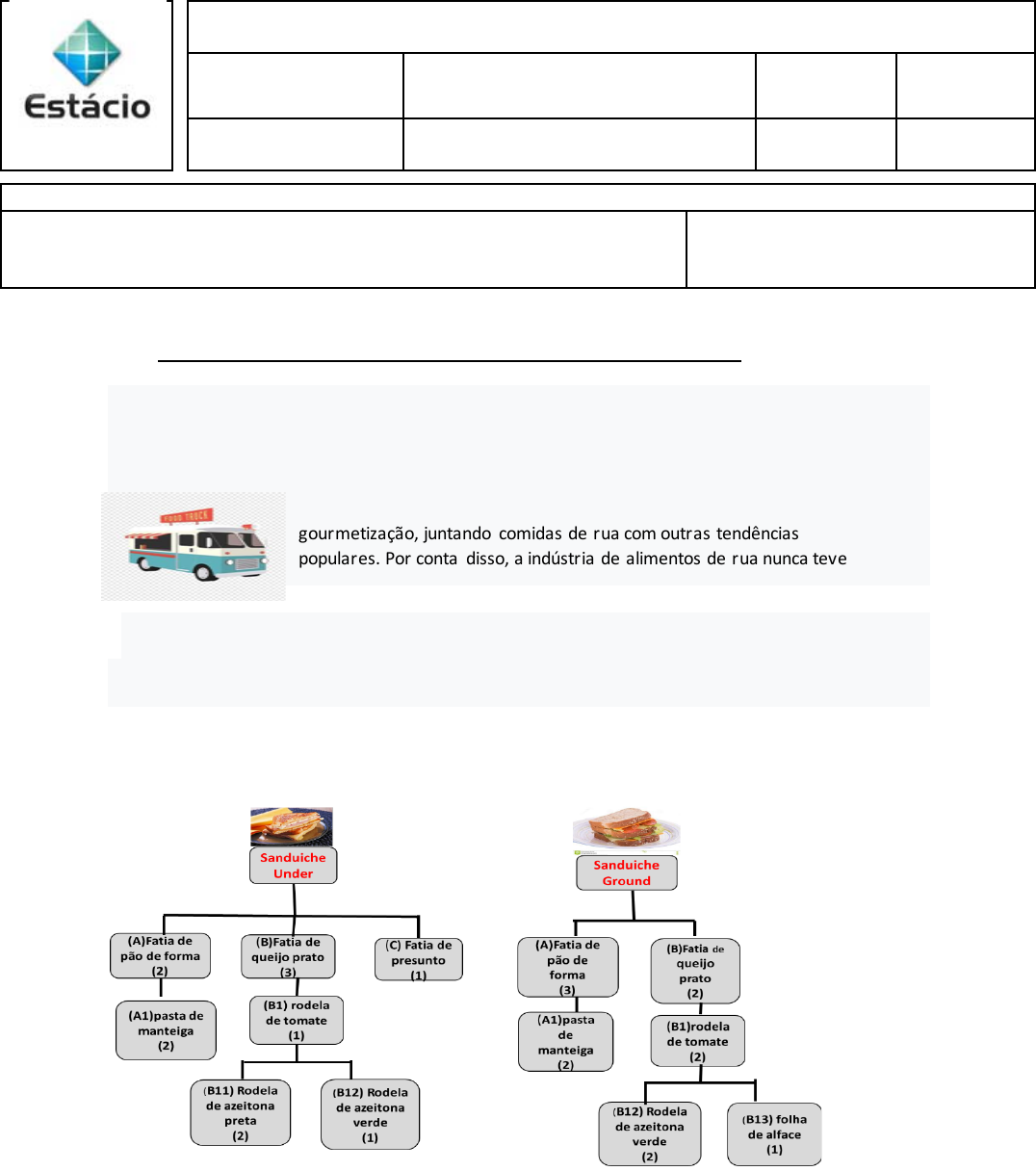Prezado Aluno, 1. Preencha, sobre o documento word, os campos=> nome, matricula; 2. O aluno terá 90 minutos para resolver a AV2 e devolvê-la pelo TEAMS através do campo tarefas. 3. Nas questões numéricas é obrigatório a apresentação do memorial de cálculo no corpo da prova O conceito de Food Truck, exportado dos Estados Unidos para o mundo todo, foi introduzido no Brasil na última década. Com o conceito aprovado pelos consumidores, os empreendedores foodtruckers viram a oportunidade de inovação e a necessidade dos clientes no mercado. Esse conceito caiu então como uma luva em muitas cidades brasileiras. 1ªQuestão (1,00 pto) MRP- Estrutura de produto- A arquitetura do produto descreve como os componentes de um produto são organizados e como eles interagem entre si funcionalmente. De acordo com o conceito arquitetura de produto, considere que o foodtruck Azulão apresenta, no seu portifólio de produtos, dois principais produtos: o sanduíche Under e o sanduíche Ground. As suas respectivas estruturas estão representadas na figura a seguir, sendo os números entre parênteses as quantidades utilizadas em cada item na produção de uma unidade do produto final (sanduíche). Considerando que os itens A (fatia de pão de forma), B (queijo prato), A1 (pasta de manteiga), B1 (rodela de tomate) e B12 (rodela de azeitona verde) são utilizados em ambos os sanduíches, responda: 1.a) (0.25 pto) Quais as quantidades dos itens A, B , C e B1 devem ser compradas respectivamente para a produção de 50 sanduíches Under e de 25 sanduíches Ground, considerando que o estoque desses itens está zerado e deve permanecer zerado? R: A = 175 B= 200 Universidade Estácio de Sá – Campus Cursos: Administração Disciplina: ADMINISTRAÇÃO DA PRODUÇÃO E OPERAÇÕES Código: GST-0242 Turma: Data: 15/6/21 Professor (a): Jose Luiz Portela Gomez AV2 a Semestre 1ºS 2021 A ser preenchido pelo (a) Aluno (a) Nome do Aluno (a) Karine Pereira Rodrigues Nº da matrícula 201903173922 Esses “restaurantes sobre rodas” passaram por um processo de gourmetização, juntando comidas de rua com outras tendências populares. Por conta disso, a indústria de alimentos de rua nunca teve tanta publicidade e notoriedade como tem atualmente. C = 50 B1 = 100 1.b) (0,25 pto) Qual a quantidade do item B13 deve ser comprada para a produção de 50 sanduíches Under e de 25 sanduiches Ground, considerando que o estoque desses itens está zerado e deve permanecer zerado? R= Sanduíche Under = 0 Sanduíche Grond = 25 1.c) (0.5 pto) Qual a quantidade do item B12 deve ser comprada para a produção de 50 sanduíches Under e de 25 sanduiches Ground, considerando que existem estoques de 20 itens B12 na dispensa e que se pretende ampliar o estoque na dispensa deste item de 20 para 70? R= 100+50= 150 2ª questão (0,5pto) APO - É correto afirmar que estão entre as características de um bem de produção: a) Não ser tangível, ser estocável e ser transportável b) Ser tangível, ser estocável e não ser transportável c) Ser tangível, ser estocável e ser transportável d) Não ser tangível, não ser estocável e não ser transportável e) Ser tangível, não ser estocável e ser transportável R= C 3ª questão (1,0 pto) – Produtividade – 3.a) Defina o conceito (expressão) da produtividade e liste três ações possíveis para a melhoria da produtividade . R= E o resultado da capacidade de produzir, de gerar e a eficiência de qualquer negócio . Melhoria – Atomizar processos, fornecer informações seguras e atualizar a tecnologia. 3.b) Dentro do conceito exposto acima, considere que a produção mensal dos sanduíches Ground foi de 6.000 unidades, operando 20 dias no mês e 8 horas por dia . Pede-se qual foi a produtividade diária (unidades/hora). R= 6.000/20 = 300 unidades por dia 300/8= 37,5 unidades por horas 3.c) Considerando que a produção mensal de sanduiches Ground tenha se elevado para 7.200 unidades , operando 20 dias no mês e a 10 horas por dia, pede-se qual foi a variação percentual da produtividade (unidades/hora) em relação a produtividade obtida no item 3.b. Essa variação percentual te agradou? Justifique? 360/10= 36 unidades por horas 1,5/36x100= 4,166 % Desagradou porque houve queda na produção diária. 3.d) Dentro do conceito exposto, considere que a produção mensal dos sanduíches Under foi de 6.000 unidades ao preço unitário de R$ 8,00 e que o foodtruck Azulão operou com três funcionários durante 20 dias no mês e 8 horas por dia cada funcionário. Pede-se qual foi a produtividade (R$/h). R= 6.000x 8 = 48.000 6000/60=100/24= 4,16 48.000/4,16= 11.538,46 R$ P 4ª questão (1.0 pto) capacidade - qualidade - A capacidade de um sistema ou processo produtivo, função dos recursos disponíveis para a operacionalização de suas atividades, representa a quantidade máxima que pode ser produzida por unidade de produção em determinado intervalo de tempo. Ainda sobre o foodtruck Azulão, a máquina de processar os sanduíches Under e Ground processa 20 sanduíches a cada 12 minutos e opera 10 horas por dia e 6 dias na semana. Se a produção semanal dos dois sanduíches foi de 4.000 sanduiches, responda: 4.a) Qual a capacidade semanal da máquina de processar os sanduíches ? R= A máquina pode processar semanalmente a quantidade de 14.400 sanduíches 20x12x6= 14.400 4.b ) Qual a taxa de utilização dessa máquina para a produção semanal informada? R= A taxa de utilização e de 28% 4000/14400=28% 5ª questão (1,5 pto) Qualidade -melhoria contínua - Para que as produções ocorram de forma eficiente, faz-se necessário que os processos sejam sempre monitorados e as alterações implementadas, após ajuste. Então, a taxa de falhas diz respeito ao índice de falhas num determinado intervalo de tempo. 5.a) Considere que na questão anterior a produção mensal dos sanduíches Ground foi de 4.000 unidades e que desse total a taxa de falha foi de 0,3% na produção total m