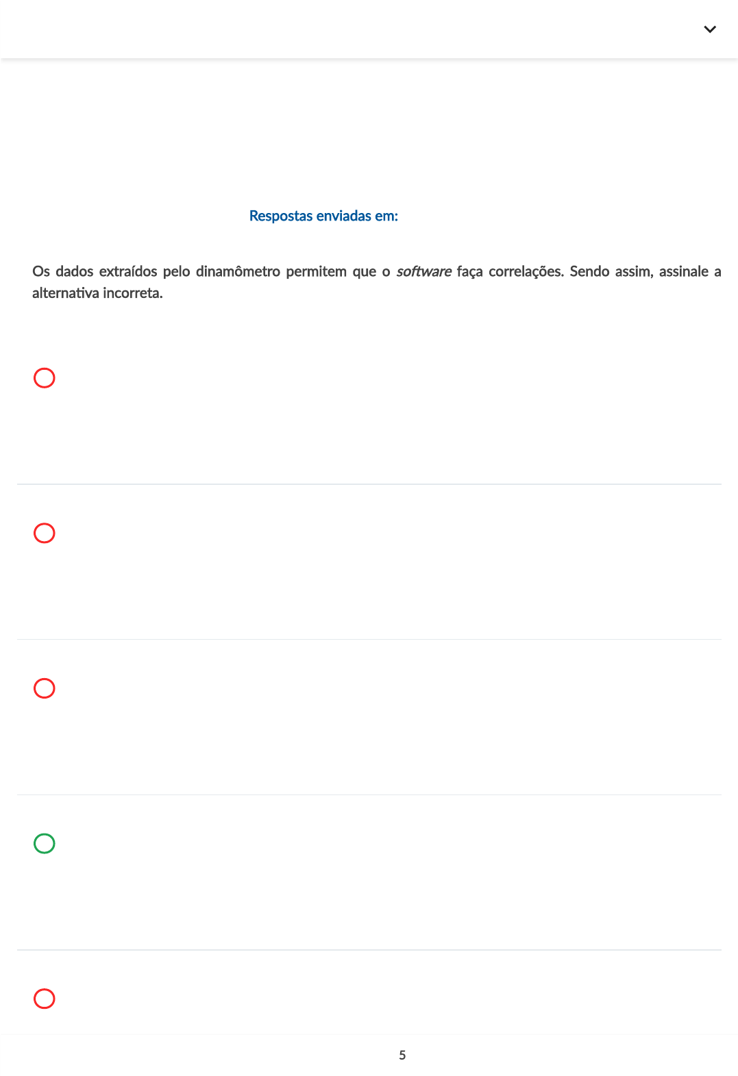 14/03/2023, 15:42 Exercícios Isocinéticos :: Plataforma A https://i9b2b.grupoa.education/sagah/object/default/42538273 1/2 Exercícios Respostas enviadas em: 04/03/2023 22:44 5. Os dados extraídos pelo dinamômetro permitem que o so�ware faça correlações. Sendo assim, assinale a alterna�va incorreta. Resposta incorreta. A. O pico de torque pode ser relacionado com a força pura. O torque é a medida principal fornecida pelos dinamômetros isociné�cos. Resposta incorreta. B. O trabalho pode ser relacionado com a força sustentada. Quanto maior a força e a amplitude de movimento, maior será o trabalho, pois trabalho = força x distância. Resposta incorreta. C. A potência pode ser relacionada com a força explosiva. Potência = trabalho x tempo. Por isso, quanto mais rápido for realizado o gesto, maior será a potência. Resposta correta. D. O pico de torque ocorre em vários ângulos. O pico de torque ocorre em determinado ângulo. Você não acertou! E. Normalmente, na dinamometria, é realizada a aferição do momento ar�cular máximo gerado por um grupo muscular. 5 de 5 perguntas Anterior Próximo JS 14/03/2023, 15:42 Exercícios Isocinéticos :: Plataforma A https://i9b2b.grupoa.education/sagah/object/default/42538273 2/2 Devido ao posicionamento do atleta no equipamento de dinamometria isociné�ca, normalmente é conseguida a estabilização do segmento e o isolamento do grupo muscular obje�vado. Voltar 5 de 5 perguntas Anterior Próximo JS