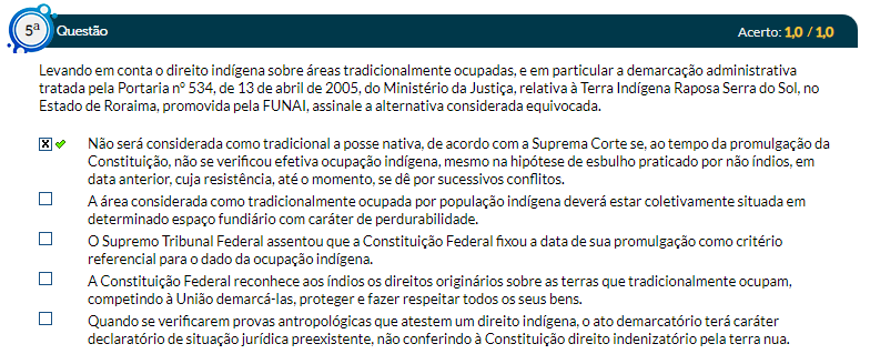 Levando em conta direito indígena sobre tradicionalmente ocupadas, e em particular a demarcação administrativa tratada pela Portaria 534, de 13 de abril de do Ministério da Justiça, relativa à Terra Indígena Raposa Serra do Sol. Assinale a alternativa considerada equivocada. Não será considerada como tradicional a posse nativa, de acordo com a Suprema Corte se, ao tempo da promulgação da Constituição Federal, não se verificou efetiva ocupação mesmo na hipótese de esbulho praticado por não indígenas em data anterior, cuja resistência, até o momento, se dê por sucessivos conflitos. A terra considerada como tradicionalmente ocupada por população indígena deverá estar coletivamente situada em determinado espaço fundiário com caráter de perdurabilidade. O Supremo Tribunal Federal assentou que a Constituição Federal fixou a data de sua promulgação como critério referencial para o dado da ocupação indígena. A Constituição Federal reconhece aos índios os direitos originários sobre as terras que tradicionalmente ocupam, competindo à União demarcá-las, proteger e fazer respeitar todos os seus bens. Quando se verificarem provas antropológicas que atestem um direito, o ato demarcatório terá caráter declaratório de situação jurídica preexistente, não conferindo à Constituição direito indenizatório pela terra nua.