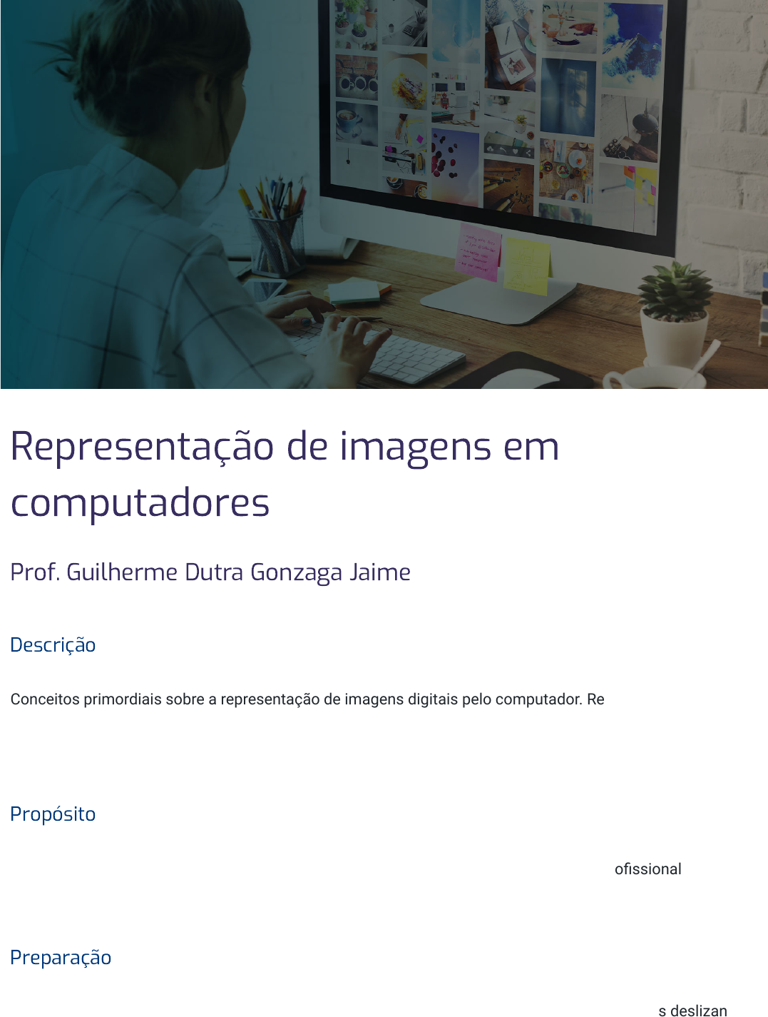15/03/2023, 00:39 Representação de imagens em computadores https://stecine.azureedge.net/repositorio/00212ti/00368/index.html# 1/25 Representação de imagens em computadores Prof. Guilherme Dutra Gonzaga Jaime Descrição Conceitos primordiais sobre a representação de imagens digitais pelo computador. Reconhecimento da importância de esquemas padronizados para esse processo. Possibilidade de representação digitalizada de imagens reais. Propósito Compreender a representação de imagens digitais para a construção do saber de um profissional da sociedade digital. Preparação Para realizar este tema, será necessário usar o explorador RGB a fim de manipular os controles deslizantes desse código HTML. 15/03/2023, 00:39 Representação de imagens em computadores https://stecine.azureedge.net/repositorio/00212ti/00368/index.html# 2/25 Objetivos Módulo 1 Fundamentos de pixels Identificar os fundamentos sobre pixels. Módulo 2 Esquema Red Green Blue (RGB) Reconhecer o esquema Red Green Blue (RGB) de representação de cores em computadores. Introdução Seria possível abrir mão do computador no mundo atual? O que pode ser elemento de afinidade também pode resultar em aspecto de segregação. As duas últimas gerações, que foram as primeiras a ter computação na escola, aprendiam que essa era uma nova disciplina. Com o tempo, passou-se a contestar cada vez mais a utilidade das “aulas” de informática. Seria necessário que a computação estivesse, como no resto do mundo, inserida no contexto das práticas diversas. Assim, o computador passou a ser parte integrante das relações de ensino e aprendizagem. Dessa forma, algumas questões surgem: como formamos este mundo? Como podemos lidar com uma tecnologia que será constantemente superada, reinaugurada? Como fazemos para nos livrar da terrível 15/03/2023, 00:39 Representação de imagens em computadores https://stecine.azureedge.net/repositorio/00212ti/00368/index.html# 3/25 sensação de estarmos obsoletos? Só há um jeito: inteirarmo-nos deste mundo, compreender como ele funciona, desmitificar o entendimento de que isso é tarefa dos iniciados. Aqui, você será convidado a se atrever, a tentar, a compreender em um nível mais avançado, para que possa ser um usuário mais competente e entender a dinâmica de abstração na construção dos programas. Para isso, escolhemos, como os seres humanos, há milênios, a primeira forma de tentar entender o mundo: construir e representar suas imagens. Se já o fizemos nas cavernas, com muito menos recursos, não serão algumas máquinas que vão nos intimidar. Para começar, vamos assistir ao vídeo que aborda a evolução histórica da representação de imagens. Boa reflexão! Abstração Capacidade de desconsiderar características naturais ou orgânicas do mundo real – temporais, espaciais e físicas – e concentrar a atenção nos atributos de maior importância, para que a solução alcançada seja tratável por computadores. 15/03/2023, 00:39 Representação de imagens em computadores https://stecine.azureedge.net/repositorio/00212ti/00368/index.html# 4/25 1 - Fundamentos de pixels Ao �nal deste módulo, você será capaz de identi�car os fundamentos sobre pixels. Vamos começar! Fundamentos sobre imagem digital Fundamentos sobre pixels Agora, vamos aprender como imagens são representadas em computadores, ou seja, estudaremos as imagens digitais. Observe o exemplo a seguir, de um lindo pássaro, em que vemos as cores amarelo, roxo, azul, verde, preto e um fundo branco: 15/03/2023, 00:39 Representação de imagens em computadores https://stecine.azureedge.net/repositorio/00212ti/00368/index.html# 5/25 Exemplo de imagem digital Você certamente observou como essa imagem é natural e arredondada. Temos a nítida impressão de que estamos olhando para um pássaro de verdade. Na parte interna do computador, entretanto, essa imagem, e qualquer outra, resume-se a uma grande quantidade de números pequenos. Lembre-se: computadores são capazes de lidar somente com números. Então, como é que isso funciona? O primeiro passo para compreendermos as imagens digitais, ou seja, como o computador representa uma imagem por meio de um conjunto de números pequenos, é darmos um bom “zoom” na imagem para observarmos mais detalhes. Veja: Zoom no início do colar azul do pássaro Você pode observar que há uma área azul no meio, uma parte maior em preto à esquerda e uma parte branca à direita. Você também pode constatar que a imagem é formada por pequenos quadrados, cada um de uma cor diferente. Eles são o que chamamos de pixels. Cada pixel é um quadrado. 15/03/2023, 00:39 Representação de imagens em computadores https://stecine.azureedge.net/repositorio/00212ti/00368/index.html# 6/25 Quando olhamos para uma imagem digital como um todo, sequer percebemos que ela é formada por esses pequenos quadrados. Isso ocorre porque os pixels são tão pequenos que geram uma ilusão de ótica, assemelhando-se a uma imagem natural e arredondada. Realmente, só conseguimos notar que imagens são formadas por pixels quando usamos o recurso de zoom. Antes de prosseguirmos, faremos a seguinte e breve provocação: A ideia básica por trás de imagens digitais é praticamente a mesma usada pelas nossas avós quando costuravam lindos bordados ponto de cruz. Nesses bordados, as imagens também são formadas por um conjunto de pequenos “x” (pontos de cruz), cada um de uma cor. Os pontos de cruz são os pixels dos lindos bordados das nossas avós. Bordado ponto de cruz Por exemplo, se a imagem anterior do pássaro for representada por apenas 1.600 pixels, ficará conforme mostra a seguir: Você conhece algum outro exemplo, fora do mundo dos computadores, em que pontos (pixels) também sejam usados para representar imagens? 15/03/2023, 00:39 Representação de imagens em computadores https://stecine.azureedge.net/repositorio/00212ti/00368/index.html# 7/25 O mesmo pássaro com númer