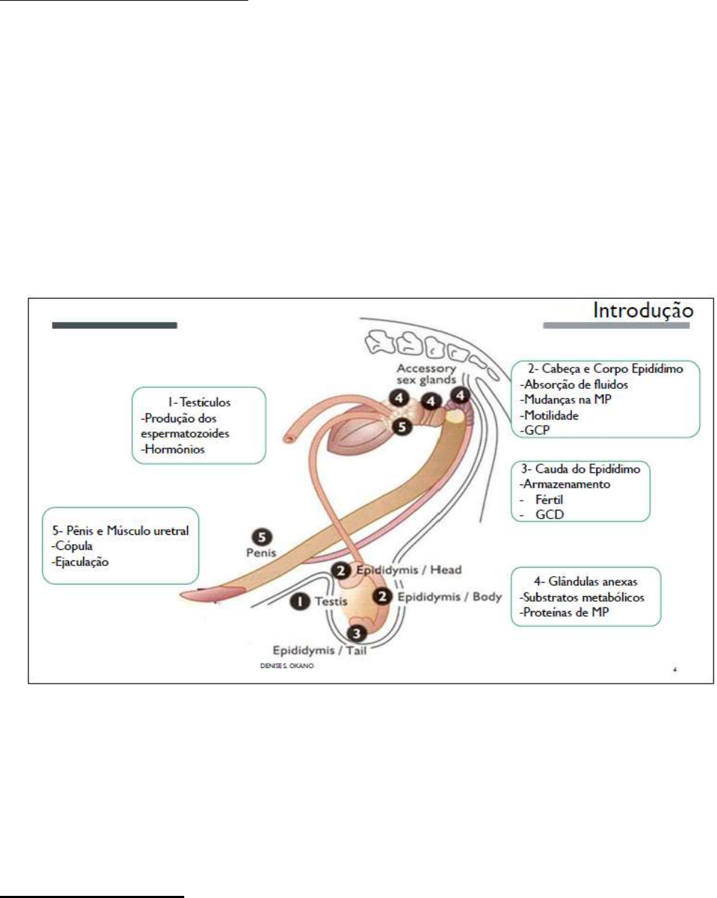 BIOTECNOLOGIA E REPRODUÇÃO DO MACHO- EXAME ANDROLÓGICO EXAME ANDROLÓGICO É um exame andrológico específico do trato genital masculino. Função do trato genital masculino: produção e maturação e condução dos gametas, hormônios, liquido seminal, cópula. No exame andrológico é avaliado se todas essas funções são exercidas. - O exame andrológico é requerido em várias situações especificas, sejam de origem obrigatória, ou por solicitação do produtor mesmo.  Origem obrigatória: seleção de reprodutores, touros em centrais de IA, criopreservação de espermatozoides, venda de reprodutores. *os touros para entrar em centrais é necessário um laudo andrológico afirmando que ele é fértil. *garanhões que vão criopreservar o sêmen também tem a necessidade de fazer o exame andrológico, para saber se é apto para reprodução (fértil) e se a qualidade do sêmen é suficiente para o processo de criopreservação. *além disso, toda venda de reprodutores é necessário que proprietário que está vendendo permita que ele tenha o laudo do exame andrológico para comprovar que o animal de fato está apto para reprodução e tem as características mínimas que o Conselho de Reprodução Animal exija para que seja um reprodutor. É UM MÉDICO VETERINÁRIO QUE FAZ E ASSINA O LAUDO DO EXAME ANDROLÓGICO. GCP – Gota Citoplasmática Proximal; GCD – Gota Citoplasmática Distal. *na cabeça do epidídimo começa a sofrer a maturação espermática; Da cauda do epidídimo – quando o animal realiza a monta/cópula e acontece a ejaculação – esses espermatozoides eles vão seguir pelo ducto deferente até a pelve do animal, chegando na uretra pélvica o espermatozoide é diluído pelo liquido seminal (que é produzido pelas glândulas sexuais acessórias – que tem substratos metabólicos importante para o metabolismo e sobrevivência do espermatozoide e também contém proteínas que vão aderir a membrana plasmática do espermatozoide para evitar a capacitação precoce). O sêmen segue pela uretra peniana e durante a ereção o macho realiza a cópula e ejacula no trato reprodutivo da fêmea. EXAME ANDROLÓGICO: - Identificação do animal; - Exame físico geral; - Exame físico específico; - Espermiograma; - Diagnóstico/conclusão. Identificação do animal: dados do proprietário, nome/registro, idade, espécie, raça. Exame físico específico: inspeção e palpação. Genitália externa: - Escroto  mobilidade, sensibilidade, ectoparasitas, dermatites, lesões/cicatrizes. *as dermatites devem ser contidas, pois a inflamação causa calor e aquece o escroto e consequentemente o testículo, causando degeneração testicular que afeta a qualidade seminal/fertilidade do reprodutor. *as lesões e cicatrizes antigas devem ser anotadas pois fisicamente pode estar normal e na avaliação seminal encontrar alguma anormalidade e pode ser justificada por lesões ou cicatrizes antigas. - Testículos, epidídimos  presentes no escroto – criptorquidia, simetria – biometria, consistência – tenso- elástica, mobilidade, temperatura, dor. *animal criptorquida deve ser descartado do programa de reprodução pois é característica hereditária. *a simetria testicular é muito importante mensurar, pois é comum a hipoplasia testicular que é uma característica hereditária e, portanto, não é bem vinda ao programa de reprodução. - Prepúcio, pênis; Genitália interna: palpação. - Gl. Bulbouretrais, - Próstata, - Gl. Vesiculares. 1-dermatite testicular; 2, 3 e 6-assimetria testicular – pode ser que um deles apresente alteração na consistência; 5-prepucio e escroto edemaciado; 4-ausência de um testículo e está pendiculoso o que não é muito normal para a espécie equina.  Biometria testicular: - Perímetro escrotal (PE): herdabilidade, repetibilidade, correlações.  seleção de touros jovens; produção espermática e concentração espermática; morfologia espermática; precocidade sexual (macho e fêmeas); peso ao nascimento, desmame; longevidade de fêmeas (stayabilite). *mede a circunferência do testículo – na maior circunferência do testículo. - Comprimento e largura | Altura em equinos e cães: é feito com o paquímetro. Serve para ver se realmente os testículos são simétricos ou assimétricos. Causas de assimetria testicular: hipoplasia testicular (hereditária); degeneração testicular; orquite; neoplasias; hérnia. *no comprimento, é excluído a calda do epidídimo. - Altura em equinos e cães: nesses animais é mensurado o comprimento, largura e altura e não se mensura PE. *é importante lembrar que no equino, o testículo assume sua posição horizontal e o epidídimo se encontra dorsalmente. Em animais que visualmente tem testículos assimétricos ele são descartados da reprodução independente do motivo que levou a essa assimetria e não pode ser vendido como reprodutor. Nos bovinos, tem se uma margem em que os animais são considerados normais de acordo com a mensuração do PE, para serem aptos para reprodução. - essa mensuração varia de autor para autor, de raça para raça. Os animais são avaliados normalmente aos 18 meses de idade: PE > 28cm : ideal. 26 > PE <28cm: reavaliação aos 24 meses. PE <26cm: descarte.  Epidídimos: faz a inspeção e palpação da cabeça, corpo e cauda do epidídimo. Avalia o tamanho, simetria, consistência e dor. *se o animal está em serviço a cauda do epidídimo vai estar maior, porem a consistência deve estar normal.  Prepúcio: é avaliado o tamanho, angulação (45°) e patologias como parasitas, abcesso, edemas, aderências, inflamação-postite, papilomas. *o tamanho depende da raça: os zebuínos tem o prepúcio mais alongado, enquanto os taurinos têm o prepúcio mais curto. E durante o exame deve ser anotado se o prepúcio do animal é longo, médio ou curto. (abaixo da linha do jarrete – longo; colado ao ventre – curto). Sendo que os animais de prepúcios longos são 