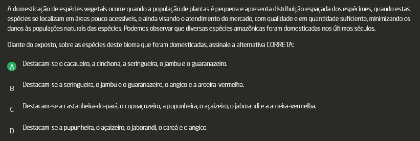 A domesticação de espécies vegetais ocorre quando a população de plantas é pequena e apresenta distribuição espaçada dos espécimes, quando estas espécies se localizam em áreas pouco acessíveis, e ainda visando atendimento do mercado, com qualidade e em quantidade suficiente, minimizando os danos às populações naturais das espécies. Podemos observar que diversas espécies amazônicas foram domesticadas nos últimos séculos. Diante do exposto, sobre as espécies deste bioma que foram assinale a alternativa CORRETA: A Destacam-se cacaueiro, a cinchona, a seringueira, jambu e guaranazeiro. B Destacam-se a seringueira, jambu e guaranazeiro, angico e a aroeira-vermelha. C Destacam-se a pupunheira, açaizeiro, jaborandi e a. D Destacam-se a pupunheira, açaizeiro, jaborandi, caroá e angico.