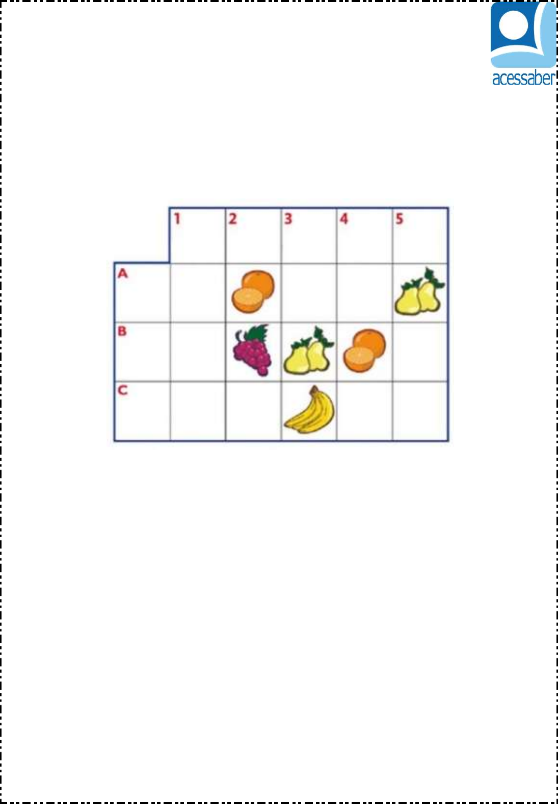 www.acessaber.com.br ESCOLA _________________________________DATA:_____/_____/_____ PROF:_______________________________________TURMA:___________ NOME:________________________________________________________ Avaliação de matemática 1) Observe o quadro abaixo e responda: a) Que fruta está na posição (A,2)? R: b) Qual a posição da banana no quadro? R: c) Qual a fruta que está na posição (B,2)? R: d) Em quais posições estão as peras? R: www.acessaber.com.br 2) Uma livraria recebeu uma entrega com 154 livros, sendo que 48 são de livros didáticos e o restante de livro infantil. Quantos livros infantis a livraria recebeu neste pedido? R: 3) Qual é o número referente a seguinte decomposição: cinco centenas de milhar, sete dezenas de milhar, uma unidade de milhar, oito centenas, duas dezenas e três unidades. R: 4) Qual a forma geométrica tridimensional que possui quatro faces laterais triangulares? R: 5) No carnaval, um baile de carnaval começou as 20:00h com 195 pessoas, as 23:00 saíram 62 pessoas e as 02:00h entraram mais 28 pessoas. Quantas pessoas estavam no inicio do baile? R: www.acessaber.com.br 6) Fabricio foi ao mercado e comprou 2 gelatinas por R$ 1,15 cada, dois salgadinhos por R$ 2,80 cada e dois chocolates por R$ 3,50 cada. Ele levou uma nota de R$ 20,00, quanto ele receberá de troco? R: 7) Um mercado está fazendo uma promoção em que 5 chocolates saem por R$ 15,00. Maria precisa comprar 15 barras de chocolate, quanto ela irá gastar, se comprar nesta promoção? R: