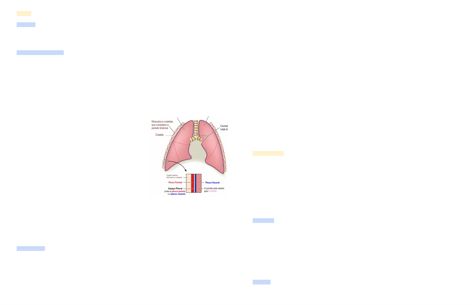 Júlia Demuner - MED UVV XXIX Pleuras - Kierszenbaum cap.13, Guyton cap.39, Cecil cap.99. Histologia À medida que os pulmões se desenvolvem, adquirem uma camada de pleura visceral derivada da mesoderme esplâncnica, já a parede corporal torácica, se torna revestida por uma camada de pleura parietal derivada da mesoderme somática. Anatomia Morfofuncional Um filme líquido muito fino entre as camadas visceral e parietal permite o deslizamento suave de uma camada contra a outra. O líquido pleural é um ultrafiltrado do sangue que extravasa dos vasos que irrigam as pleuras, principalmente dos vasos que irrigam a parietal, pelo fato de serem sistêmicos e apresentarem maior pressão. Os vasos sanguíneos destinados à pleura visceral se originam dos vasos sanguíneos pulmonares e brônquicos , já o suprimento vascular para a pleura parietal é derivado dos vasos sanguíneos sistêmicos . Ramos de nervos frênicos e intercostais são encontrados na pleura parietal , ao passo que a pleura visceral recebe ramos dos nervos vagos e simpáticos que suprem os brônquios. Visceral A camada visceral é revestida por um epitélio simples pavimentoso, denominado mesotélio, e está fortemente aderida ao pulmão , sendo responsável por selar a sua superfície e evitar o vazamento de ar para o interior da cavidade torácica. Parietal A camada parietal também é revestida por mesotélio, porém, é mais espessa e reveste a superfície interna da cavidade torácica . A pleura parietal divide-se em três compartimentos (ou telas): mesotelial , constituído por células mesoteliais e membrana basal, a submesotelial , formado por tecido conjuntivo submesotelial, lâmina elástica externa, vasos sanguíneos e linfáticos e a lâmina elástica interna e submesotelial do tecido adiposo, representado por tecido adiposo e músculo esquelético. Cavidade Pleural Como o pressão alveolar tem uma valor em torno de 0 mmHg (com relação a atmosfera), o valor negativo de pressão intrapleural facilita o fluxo de saída de ar dos alvéolos e, consequentemente, a expansão dos pulmões durante a inspiração (ar se desloca da maior para a menor pressão). No entanto, caso haja um acúmulo de ar nesta cavidade, a pressão intrapleural passa a ser positiva e o gradiente de pressão deixa de existir, assim, o ar tende sair da cavidade e colapsar os pulmões (empurrar), ! A negativação excessiva da pressão intrapleural favorece a formação de derrame. Líquido Pleural Quando os pulmões se expandem e se contraem, durante a respiração normal, eles deslizam para frente e para trás, dentro da cavidade pleural e, para facilitar esse deslizamento , existe uma fina camada de líquido mucóide entre as pleuras parietal e visceral. Este líquido é claro incolor, com baixa concentração de proteínas (<1,5 g/dL) e cerca de 1.500 células/uL, com predomínio de monócitos, pequeno número de linfócitos, macrófagos e células mesoteliais, mas sem hemácias. A pleura, assim como o revestimento de outras cavidades serosas (peritônio e pericárdio), é uma estrutura Júlia Demuner - MED UVV XXIX de grande permeabilidade, desse modo, o líquido presente na cavidade pleural deriva do plasma sanguíneo por transudação através da parede dos capilares. A membrana pleural é membrana serosa, porosa e mesenquimal, da qual transudam, continuamente, pequenas quantidades de líquido intersticial para o espaço pleural . Esses líquidos carreiam proteínas teciduais , dando ao líquido pleural sua aparência mucóide, que é o fator que permite o fácil deslizamento dos pulmões em movimento. A quantidade total de líquido em cada cavidade pleural normalmente é pequena, de somente alguns mililitros (0,26 ml/kg). Sempre que essa quantidade de líquido aumenta e começa a fluir para a cavidade pleural, o excesso de líquido é bombeado para fora pelos vasos linfáticos , que se abrem diretamente da cavidade pleural para o mediastino, a superfície superior do diafragma e as superfícies laterais da pleura parietal. Portanto, o espaço pleural é considerado espaço potencial, porque normalmente é tão estreito que de modo óbvio não é um espaço físico. Acúmulo de Líquido O excesso de fluidos pode acumular-se no espaço pleural em resultado da diminuição de sua remoção, devido à obstrução dos linfáticos pleurais , ou de sua produção aumentada, devido ao aumento da pressão hidrostática, diminuição da pressão oncótica, diminuição da pressão no espaço pleural ou diminuição da permeabilidade da membrana pleural. Uma força negativa é necessária para manter os pulmões expandidos e secos (sem água). Como a tendência normal de colapso dos pulmões é de aproximadamente −4 mmHg, a pressão do líquido pleural deve ser, no mínimo, de −4 mmHg, para manter os pulmões expandidos. Assim, a negatividade da pressão do líquido pleural mantém os pulmões tracionados contra a pleura parietal da cavidade torácica, exceto por camada extremamente fina de líquido mucóide que atua como lubrificante. Derrame Pleural A pleura é frequentemente acometida por doenças primárias ou secundárias, benignas ou malignas e, quase sempre, comprometimento pleural acompanha-se de aumento de líquido pleural, o que constitui um derrame pleural. O derrame é análogo ao líquido do edema nos tecidos, e pode ser chamado “edema da cavidade pleural”. As causas do derrame são as mesmas causas do edema em outros tecidos, incluindo (1) bloqueio da drenagem linfática da cavidade pleura l, (2) insuficiência cardíaca , que causa pressões capilares periférica e pulmonar muito altas, levando à excessiva transudação de líquidos para a cavidade pulmonar, (3) diminuição acentuada da pressão coloidosmótica do plasma , permitindo a transudação excessiva de líquidos e (4) infecção ou qualquer outra causa de inflamação nas superfícies da cavidade pleural , que aumenta a permeabilidade das membranas capilares e p