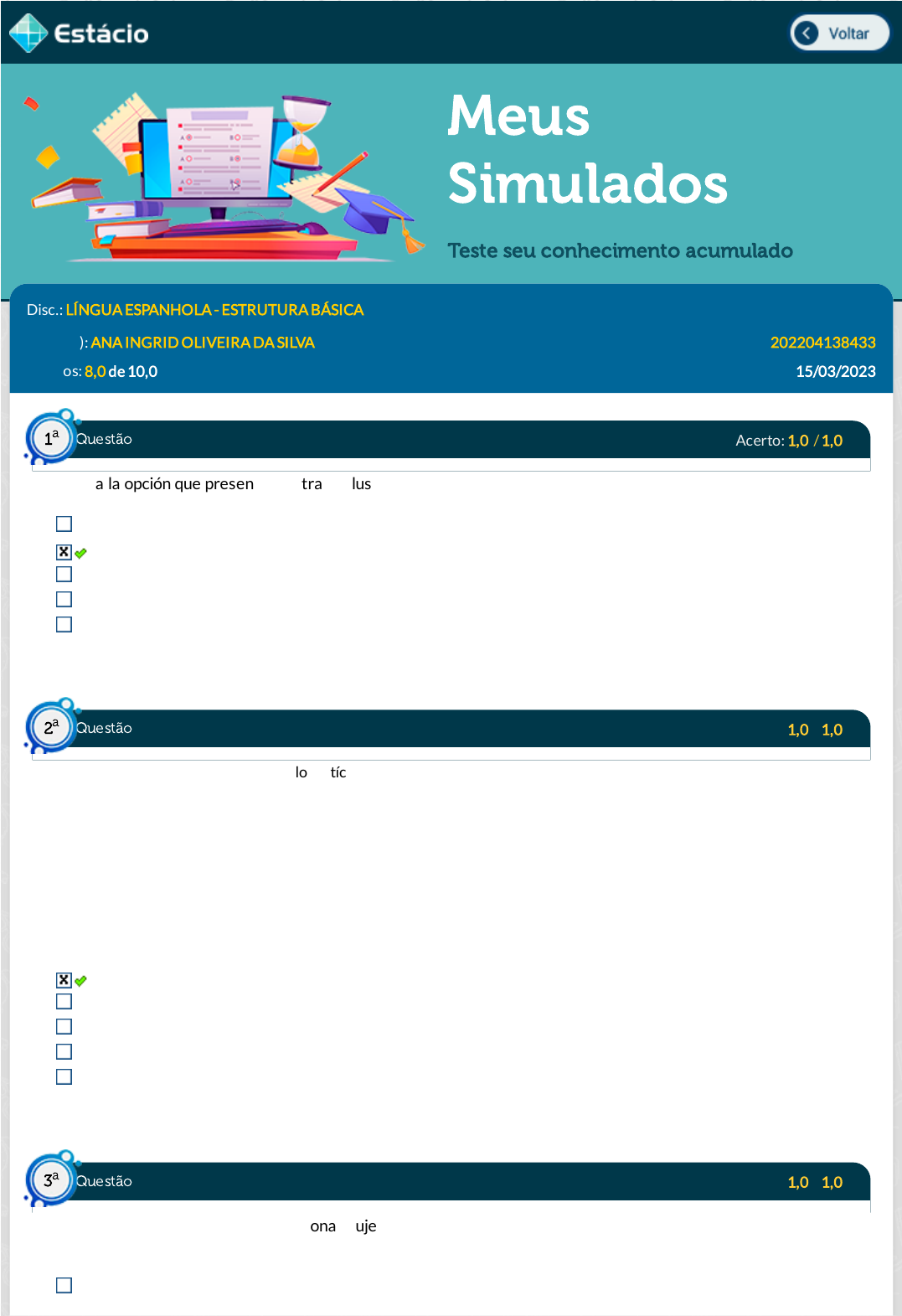 15/03/2023, 22:07 Estácio: Alunos https://simulado.estacio.br/alunos/ 1/4 Meus Simulados Teste seu conhecimento acumulado Disc.: LÍNGUA ESPANHOLA - ESTRUTURA BÁSICA Aluno(a): ANA INGRID OLIVEIRA DA SILVA 202204138433 Acertos: 8,0 de 10,0 15/03/2023 Acerto: 1,0 / 1,0 Señala la opción que presenta la letra exclusiva del alfabeto español: SS Ñ W Y CH Respondido em 15/03/2023 21:49:29 Acerto: 1,0 / 1,0 Completa el fragmento del texto con los artículos, contracciones o combinaciones adecuadas: Doctor Carles Muntaner, investigador _____ Centro para la Adicción y la Salud Mental (CAMH), afirma que ______ condiciones laborales ejercen un profundo impacto sobre la salud _____ trabajadores de todo _____ mundo. _____ investigador cree que _____ baja salud mental y física está asociada a ganarse la vida con un trabajo precario, es decir, con contratos temporales o a tiempo parcial, bajos salarios y escasos beneficios. del, las, de los, el, El, la. de lo, los, de las, el, Lo, el. de lo, los, del, la, El, lo. del, las, de les, lo, Lo, la. de el, las, de los, el, El, la. Respondido em 15/03/2023 21:50:38 Acerto: 1,0 / 1,0 Identi�ca cuál es el pronombre personal, sujeto de la oración y marca el ítem que lo corresponda: "Vamos en coche a Madrid." vosotros. Questão1 a Questão2 a Questão3 a https://simulado.estacio.br/alunos/inicio.asp javascript:voltar(); 15/03/2023, 22:07 Estácio: Alunos https://simulado.estacio.br/alunos/ 2/4 yo. nosotros. ellos. ello. Respondido em 15/03/2023 21:51:14 Acerto: 1,0 / 1,0 Los pronombres inde�nidos son palabras que indican falta de precisión, indeterminación. Algunos de estos pronombres son INVARIABLES. Marca la opción en cuya frase hay un pronombre VARIABLE. Cada dos años visito a mis abuelos en México. No tengo ninguna idea de dónde está el libro. Nadie vino a mi cumpleaños. Algo me dice que va a llover hoy. Hay alguien en mi habitación. Respondido em 15/03/2023 21:54:43 Gabarito Comentado Acerto: 0,0 / 1,0 El tiempo verbal que presenta hechos pasados anteriores a otros hechos también pasados lo nombramos en español como: Pretérito perfecto Pretérito pluscuamperfecto Pretérito anterior Pretérito imperfecto Pretérito inde�nido Respondido em 15/03/2023 21:55:17 Acerto: 1,0 / 1,0 Marca el PRONOMBRE COMPLEMENTO DIRECTO que completa la frase: Perdí el estuche. _________ tengo que encontrar pronto. ME LE LA LO LOS Respondido em 15/03/2023 21:52:10 Acerto: 0,0 / 1,0 Completa con el Futuro de Indicativo: I - Este �n de semana (yo) ___________ que hacer un viaje a Cuba. (TENER). Questão4 a Questão5 a Questão6 a Questão7 a 15/03/2023, 22:07 Estácio: Alunos https://simulado.estacio.br/alunos/ 3/4 II - Nosotros les ____________ a tus tíos que vayáis a visitarles el jueves. (DECIR). III- Seguro que (ellos)__________ venir a nuestra �esta. (QUERER). (I) tendremos; (II) diremos; (III)quieren. (I) tendrás; (II) decimos; (III) querrán. (I) tendré; (II) diremos; (III) querrán. (I) tendré; (II) decimos; (III) quieran. (I) tengo; (II) diremos; (III) quieran. Respondido em 15/03/2023 21:53:14 Gabarito Comentado Acerto: 1,0 / 1,0 Las conjunciones coordinantes copulativas unen elementos de igual categoría sintáctica. Marca el ítem donde se veri�ca el uso de las copulativas. No leyó ni escribió nada hoy. Está triste o cansado. Tengo un libro nuevo con imágenes y textos de Cervantes. Es bonito e instructivo. Has olvidado las fechas, o sea, no has venido a mi cumpleaños. Vendo libros y cuadernos, pero no le hablé a Carlos. Vi a Fernando, pero no le hablé. Respondido em 15/03/2023 22:06:07 Acerto: 1,0 / 1,0 "A lo largo de La vida" expresa Idea de: Lugar Causa Consecuencia Finalidad Tiempo Respondido em 15/03/2023 22:04:10 Acerto: 1,0 / 1,0 Señala la opción que presenta el signi�cado correcto en portugués del heterosemántico español: Apellido = apelo Lienzo = pano Rojo = vinho Contestar = responder Grasa = agradecido Respondido em 15/03/2023 22:05:26 Questão8 a Questão9 a Questão10 a 15/03/2023, 22:07 Estácio: Alunos https://simulado.estacio.br/alunos/ 4/4