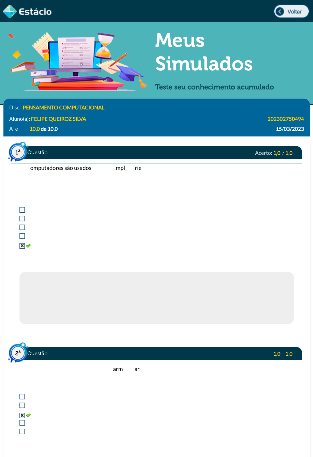 15/03/2023, 23:48 Estácio: Alunos https://simulado.estacio.br/alunos/ 1/5 Meus Simulados Teste seu conhecimento acumulado Disc.: PENSAMENTO COMPUTACIONAL Aluno(a): FELIPE QUEIROZ SILVA 202302750494 Acertos: 10,0 de 10,0 15/03/2023 Acerto: 1,0 / 1,0 Os computadores são usados em uma ampla variedade de aplicações, incluindo processamento de texto, navegação na web, jogos, edição de vídeo, design grá�co e cálculo cientí�co. Eles também são usados em muitas áreas da vida cotidiana, como compras online, bancos e serviços de saúde. Além disso, os computadores são fundamentais para a pesquisa e desenvolvimento de novas tecnologias. Essencialmente, o que é um algoritmo em um computador? Um algoritmo é uma ferramenta de gerenciamento de banco de dados. Um algoritmo é um modelo de aprendizado de máquina usado para prever resultados. Um algoritmo é uma técnica de codi�cação para desenvolver softwares. Um algoritmo é uma equação matemática usada para solucionar problemas. Um algoritmo é uma série de instruções ou passos para solucionar um problema ou realizar uma tarefa. Respondido em 15/03/2023 23:44:35 Explicação: Algoritmo é a representação formal de um conjunto de instruções ou regras para realizar uma tarefa especí�ca, geralmente na forma de um programa computacional. É importante para a resolução de problemas e para a automação de processos, como na realização de cálculos, processamento de dados, análise de informações, entre outros. Algoritmos são a base para a funcionalidade dos computadores, pois eles fornecem uma estrutura e uma sequência de ações para que os computadores possam realizar tarefas de forma e�ciente e precisa. Acerto: 1,0 / 1,0 A memória do computador é capaz de armazenar diferentes tipos de dados. A forma como lidamos com esses dados depende da necessidade do programador e da linguagem por ele utilizada. Em computação, o que é uma string? É um tipo de dado que admite valores numéricos, como inteiros e decimais. É o nome dado a uma sequência de instruções. É o nome de um tipo de dado constituído por uma sequência de caracteres, ou seja, um texto. É o nome dado às instruções simples e interpretáveis por computadores que formam um código. É o nome de um tipo de dado estritamente numérico. Respondido em 15/03/2023 23:44:57 Questão1 a Questão2 a https://simulado.estacio.br/alunos/inicio.asp javascript:voltar(); 15/03/2023, 23:48 Estácio: Alunos https://simulado.estacio.br/alunos/ 2/5 Explicação: É o nome de um tipo de dado constituído por uma sequência de caracteres, ou seja, um texto. Nesse sentido, podemos utilizar uma string para representar o nome de pessoas, endereços residenciais ou páginas web. Não podemos esquecer que algumas linguagens exigem que as strings estejam delimitadas por aspas duplas. Acerto: 1,0 / 1,0 O JavaScript é uma linguagem de programação criada em meados da década de 90 e de fácil assimilação por apresentar uma sintaxe simples e intuitiva. Acerca dessa linguagem, marque a opção que representa o código Javascript que produz o resultado abaixo. alho treze dois put( "alho", "treze", "dois" ; print( "alho", "treze", "dois" ); screen( "alho", 13, "dois" ); show( "alho", "treze" "dois" ); print( "alho", 13, 2); Respondido em 15/03/2023 23:45:13 Explicação: A resposta correta é: print( "alho", "treze", "dois" ); Os comandos show, put e screen não se aplicam. Como se trata de strings, elas devem estar entre aspas duplas. Acerto: 1,0 / 1,0 Computadores são máquinas eletrônicas projetadas para executar tarefas computacionais de forma automatizada. Eles podem processar, armazenar e transmitir informações através de seus componentes, como processadores, memórias, discos rígidos e dispositivos de entrada e saída. O que é um código em um computador? Uma série de instruções que são difíceis para o computador executar. Uma série de instruções que só podem ser criadas por Inteligência Arti�cial. Uma série de instruções que o computador não consegue entender. Uma série de instruções que o computador executa de forma rápida. Uma série de instruções que são difíceis para o usuário compreender. Respondido em 15/03/2023 23:45:29 Explicação: Um código em um computador é uma série de instruções escritas em uma linguagem de programação, como o Python ou o Java, que são criadas por programadores para que o computador possa realizar tarefas especí�cas de forma rápida e funcional. Acerto: 1,0 / 1,0 Questão3 a Questão4 a Questão5 a 15/03/2023, 23:48 Estácio: Alunos https://simulado.estacio.br/alunos/ 3/5 O bit(simpli�cação para dígito binário, em inglês, binary digit) é a menor parcela de informação que um computador processa. Quantos bits existem em um byte, e quantos valores distintos é possível representar com um byte, respectivamente? 8 e 256 4 e 32 7 e 128 4 e 16 8 e 512 Respondido em 15/03/2023 23:45:46 Explicação: A resposta correta é: 8 e 256. Por convenção, um byte representa exatamente 8 bits e de posse de um byte temos 28 = 256 valores representáveis. Acerto: 1,0 / 1,0 O Bit é a menor unidade utilizada na computação, podendo assumir apenas dois valores: 0 ou 1. Nesse sentido, quantos valores distintos podem ser representados por 5 bits? 8 128 32 16 64 Respondido em 15/03/2023 23:46:09 Explicação: A resposta correta é: com 5 bits (25) podemos representar até 32 números. Acerto: 1,0 / 1,0 Quantos pixels possui uma imagem com resolução de 800x600? 120.000 2.800 1.400 240.000 480.000 Respondido em 15/03/2023 23:46:31 Explicação: A resposta correta é: 480.000 Questão6 a Questão7 a 15/03/2023, 23:48 Estácio: Alunos https://simulado.estacio.br/alunos/ 4/5 Acerto: 1,0 / 1,0 Considere a grade de pixels a seguir: Qual é a coordenada do pixel em preto? (1,1) (3,2) (1,2) (2,1) (2,3) Respondido em 15/03/2023 23:46:47 Explicação: A resposta correta é: (2,1) Acerto: 1,0 / 1,0 Supon