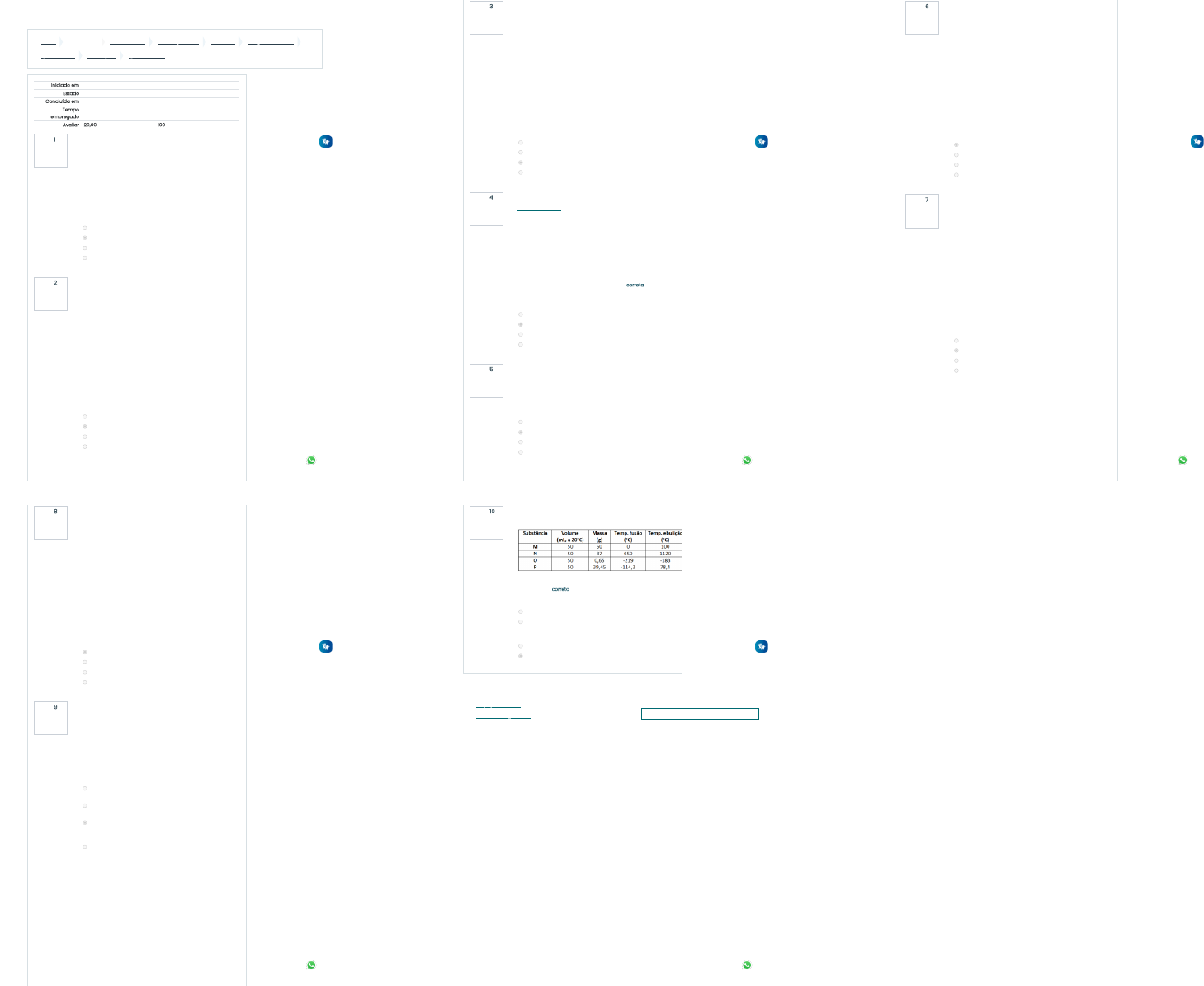 16/03/2023 17:46 QUESTIONÁRIO 1 https://ava.funec.br/mod/quiz/review.php?attempt=288944&cmid=2363 1/5 Painel Meus cursos CURSOS FUNEC Graduação - EAD Aluno EAD JUNÇÕES DE TURMA Química Geral AVALIAÇÕES QUESTIONÁRIO 1 Questão 1 Completo Atingiu 2,00 de 2,00 Questão 2 Completo Atingiu 2,00 de 2,00 Iniciado em Wednesday, 22 Jun 2022, 10:35 Estado Finalizada Concluída em Wednesday, 22 Jun 2022, 10:38 Tempo empregado 3 minutos 2 segundos Avaliar 20,00 de um máximo de 20,00(100%) Observe os seguintes fatos: I - Bolinhas de naftalina, à temperatura ambiente, têm suas massas diminuídas, terminando por desaparecer sem deixar resíduos. II - Derretimento de um pedaço de chumbo quando aquecido. III - Uma porção de água líquida no congelador da geladeira. IV - Uma vasilha com água líquida deixada ao fogo. Nesses fatos, estão relacionados corretamente os seguintes fenômenos: Escolha uma opção: a. I. Sublimação; II. Solidificação; III. Fusão; IV. Vaporização b. I. Sublimação; II. Fusão; III. Solidificação; IV. Vaporização c. I. Vaporização; II. Sublimação; III. Fusão; IV. Solidificação d. I. Fusão; II. Sublimação; III. Vaporização; IV. Solidificação Com base nas mudanças de fase, analise as afirmações abaixo. I. Sublimação é o nome dado à mudança em que a substância passa do estado líquido para o estado sólido. II. Fusão é a mudança do estado sólido para o estado líquido; portanto, trata-se de um processo que absorve calor. III. Liquefação é a mudança do estado gasoso para o estado líquido; portanto, trata-se de um processo que libera calor. IV. Evaporação, calefação e ebulição são tipos de vaporização que um líquido pode sofrer quando passa para o estado gasoso. V. A sublimação é o nome dado à mudança de estado em que a substância passa do estado líquido para o estado gasoso. Assinale a alternativa correta. Escolha uma opção: a. Apenas as afirmações I, II e III são verdadeiras b. Apenas as afirmações II, III e IV são verdadeiras c. Apenas as afirmações I e IV são verdadeiras d. Apenas as afirmações I e V são verdadeiras 16/03/2023 17:46 QUESTIONÁRIO 1 https://ava.funec.br/mod/quiz/review.php?attempt=288944&cmid=2363 2/5 Questão 3 Completo Atingiu 2,00 de 2,00 Questão 4 Completo Atingiu 2,00 de 2,00 Questão 5 Completo Atingiu 2,00 de 2,00 Em relação a substâncias puras e misturas analise as afirmativas a seguir. Leia atentamente as afirmativas a seguir sobre as diferenças entre misturas e compostos químicos. I. Na mistura, os componentes podem ser separados por técnicas físicas, enquanto os componentes de um composto não podem. II. Uma mistura tem as propriedades de seus constituintes e um composto tem propriedades que diferem das de seus componentes. III. As misturas podem ter qualquer composição desejada, enquanto um composto tem composição fixa. IV. As misturas podem ser classificadas como homogêneas ou heterogêneas e os compostos, em orgânicos ou inorgânicos. Assinale a alternativa correta. Escolha uma opção: a. Apenas I e II estão corretas b. Apenas I, II e III estão corretas c. Todas estão corretas d. Apenas I e III estão corretas Julgue as afirmações a seguir em relação aos estudos sobre modelos atômicos realizados por Niels Bohr, John Dalton e Ernest Rutherford. I. Partículas alfa foram desviadas de seu trajeto, devido à repulsão que o núcleo denso e a carga positiva do metal exerceram. II. Átomos (esferas indivisíveis e permanentes) de um elemento são idênticos em todas as suas propriedades. Átomos de elementos diferentes têm propriedades diferentes. III. Os elétrons movem-se em órbitas, em torno do núcleo, sem perder ou ganhar energia. Assinale a alternativa que indica a sequência correta do relacionamento desses estudos com seus autores. Escolha uma opção: a. Rutherford; Bohr; Dalton b. Rutherford; Dalton; Bohr c. Dalton; Bohr; Rutherford d. Dalton; Rutherford; Bohr Thomson, a parir de seus experimentos com os tubos de raios catódicos, determinou pela primeira vez, a relação entre a massa e a carga do elétron, o que pode ser considerado como a descoberta do elétron. É reconhecida como uma contribuição de Thomson ao modelo atômico Escolha uma opção: a. o átomo ser indivisível b. a existência de partículas subatômicas c. os elétrons ocuparem níveis discretos de energia d. os elétrons girarem em órbitas circulares ao redor do núcleo 16/03/2023 17:46 QUESTIONÁRIO 1 https://ava.funec.br/mod/quiz/review.php?attempt=288944&cmid=2363 3/5 Questão 6 Completo Atingiu 2,00 de 2,00 Questão 7 Completo Atingiu 2,00 de 2,00 Analise as afirmações abaixo em relação à classificação das substâncias. I. Um sistema composto por água e gelo pode ser classificado como heterogêneo e bifásico, e contém uma substância composta. II. Em um balão existe um líquido transparente, inodoro e incolor, este líquido se trata de uma substância pura. III. Uma mistura eutética apresenta variação na temperatura de fusão e uma temperatura de ebulição constante, enquanto que uma mistura azeotrópica apresenta variação na temperatura de ebulição e uma temperatura de fusão constante. IV. Água e óleo se misturam formando um sistema heterogéneo, porém não se dissolvem. São corretas apenas as afirmações: Escolha uma opção: a. I e IV b. I e II c. II e IV d. II e III Quando se esquece no freezer uma garrafa fechada cheia de refrigerante, durante o processo de solidificação do líquido, essa garrafa pode explodir, provocando o extravasamento de seu conteúdo. Considere as afirmações abaixo, sobre esse fenômeno. I - O gás carbônico contido no refrigerante transforma-se em gelo seco que então sublima, rompendo o recipiente. II - Os sais contidos no refrigerante, quando em temperaturas muito baixas, formam sistemas altamente higroscópicos, o que provoca um significativo aumento de volume. III - O processo de solidificaçã