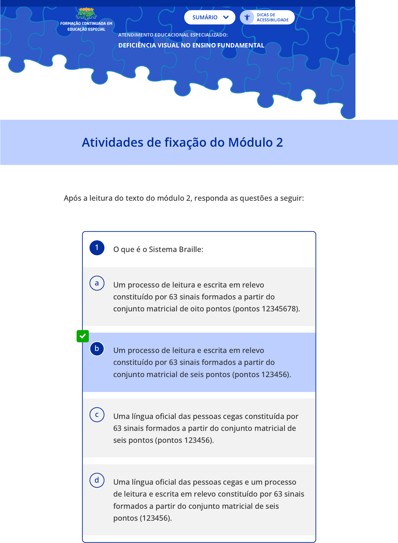 SUMÁRIO ATENDIMENTO EDUCACIONAL ESPECIALIZADO: DEFICIÊNCIA VISUAL NO ENSINO FUNDAMENTAL DICAS DE ACESSIBILIDADE Atividades de �xação do Módulo 2 Após a leitura do texto do módulo 2, responda as questões a seguir: O que é o Sistema Braille:1 Um processo de leitura e escrita em relevo constituído por 63 sinais formados a partir do conjunto matricial de oito pontos (pontos 12345678). a Um processo de leitura e escrita em relevo constituído por 63 sinais formados a partir do conjunto matricial de seis pontos (pontos 123456). b Uma língua o�cial das pessoas cegas constituída por 63 sinais formados a partir do conjunto matricial de seis pontos (pontos 123456). c Uma língua o�cial das pessoas cegas e um processo de leitura e escrita em relevo constituído por 63 sinais formados a partir do conjunto matricial de seis pontos (123456). d Relacione corretamente a segunda coluna de acordo com a primeira contendo os termos utilizados na 3ª edição da Gra�a Braille para a Língua Portuguesa: 2 BRAILLE EM NEGRO1 CELA OU CÉLULA BRAILLE2 ORDEM BRAILLE3 SINAL FUNDAMENTAL4 Espaço retangular onde se produz um sinal braille. 2 Representação de sinais em braille com pontos em tinta. Pode ser produzido à mão ou em computadores, utilizando-se fontes “em braille”. 1 Formado pelo conjunto dos seis pontos numa cela (cela cheia). 4 Sequência ordenada conforme a disposição das sete séries do Sistema Braille. 3 Marque a alternativa que representa um sinal simples do Sistema Braille: 3 A a .ab '''c .Bd Marque a alternativa que representa um sinal4 superior do Sistema Braille: 3a c b 1c Ld Sobre os materiais didático-pedagógicos dedicados ao público-alvo da Educação Especial, está correto apenas o que se a�rma em: 5 São unicamente distribuídos pelas redes de ensino.a Sua aquisição é de responsabilidade exclusiva das famílias dos estudantes com de�ciência, transtornos globais do desenvolvimento e altas habilidades ou superdotação. b São aqueles distribuídos ou elaborados visando a bene�cência dos educandos da Educação Especial para sua socialização nos ambientes escolares. c São aqueles distribuídos ou elaborados visando maximizar a possibilidade de participação plena dos educandos do público-alvo da educação especial nas atividades escolares, sendo acessíveis e adequados aos estágios de desenvolvimento dos educandos e aos diversos níveis de educação. d Marque a opção na qual todas as alternativas são sinais da 1ª série da ordem braille: 6 a b c d e f g h i j a k l m n o p q r s tb * < % ? : $ ] | [ wc / > + # ' –d Sobre o Soroban, assinale V para as alternativas verdadeiras e F para as falsas. 7 Na régua de numeração são encontrados traços, indicando a separação de classes. a F V Na régua de numeração são encontrados pontos, indicando a separação de classes. b F V As contas en�adas nos eixos representam números, quando encostadas à régua longitudinal ou de numeração. c F V O modelo de 21 eixos é dividido em quatro partes: esquerda, direita, norte e sul do Soroban. d F V Leia o texto abaixo e assinale a alternativa que contém as palavras que melhor se encaixam nas lacunas: O Soroban é um contador ____________, ___________, de forma retangular, que possui uma régua em posição horizontal (régua de ___________), dividindo-o, internamente, em dois outros retângulos: inferior (mais largo), contendo __________ contas em cada eixo, e superior (estreito), contendo 01 (uma) conta em cada eixo A sequência totalmente correta é: 8 Automático, digital, organização, 4 (quatro).a Automático, manual, numeração, 5 (cinco).b Mecânico, manual, numeração, 4 (quatro). c Mecânico, manual, organização, 5 (cinco).d Em relação à orientação e mobilidade para pessoas com de�ciência visual, analise os itens a seguir: I - A orientação se constitui na capacidade de perceber o ambiente e de saber onde estamos. II - A mobilidade diz respeito à dependência que uma pessoa com de�ciência visual possui para se movimentar. III - A orientação e a mobilidade para pessoas com de�ciência visual envolve a utilização dos sentidos para obter as informações necessárias do ambiente. IV – No âmbito do Atendimento Educacional Especializado, o docente proporcionará variadas e 9 Refazer Atividade Respondidas 10 de 10 questões contínuas oportunidades ao aluno para compreender o espaço escolar. É correto o que se a�rma apenas em: I, II, III, IV.a I, III.b II, IV.c I, III, IV. d Marque a opção que apresenta técnicas utilizadas por pessoas com de�ciência visual para se movimentar com segurança e autonomia: 10 Sistema braille, superproteção e bengala longa.a Guia normovisual (vidente), autoproteção e bengala longa. b Guia vidente, superproteção e Soroban.c Sistema braille, autoproteção e bengala longa.d