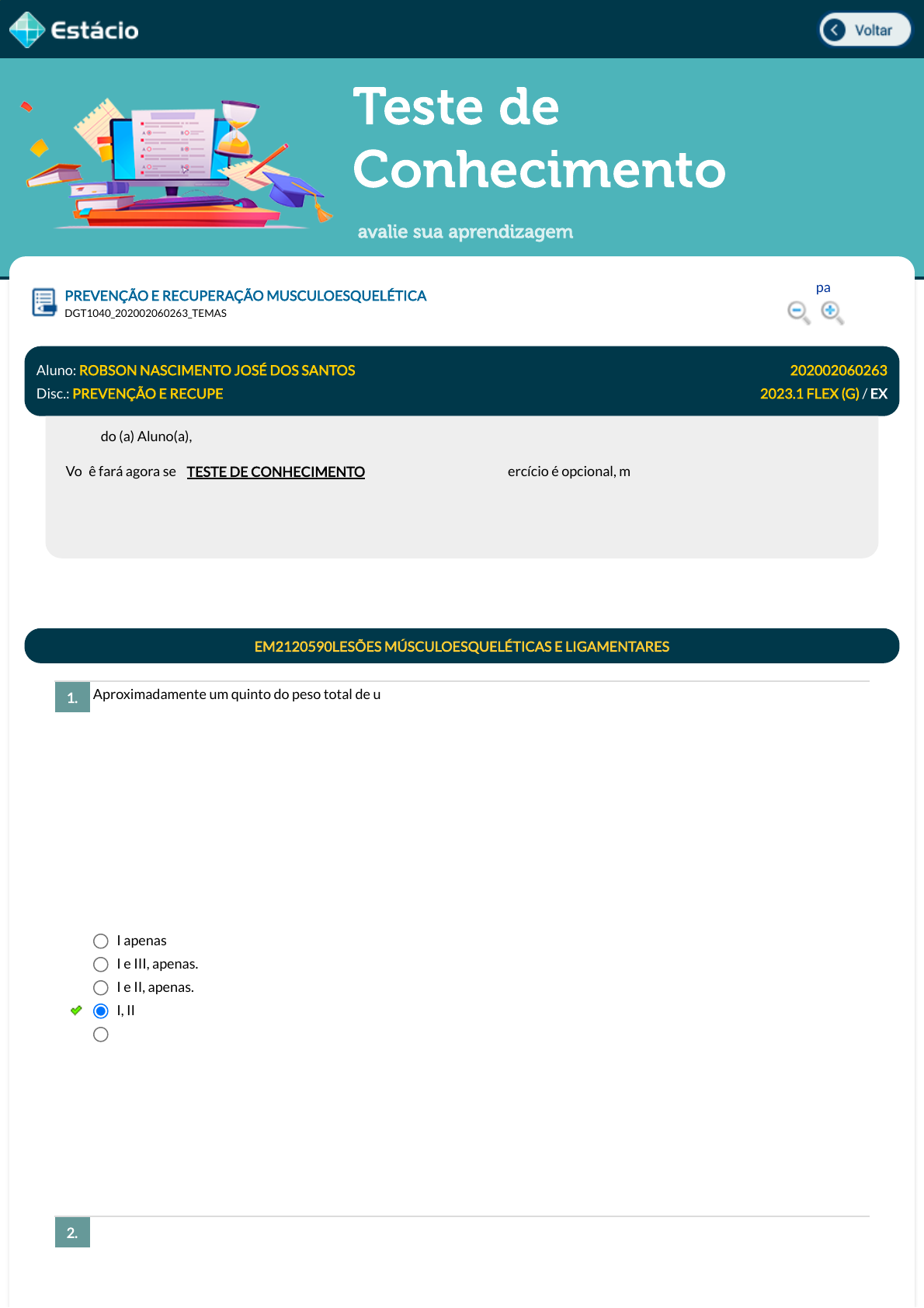 Teste de Conhecimento avalie sua aprendizagem Aproximadamente um quinto do peso total de um indivíduo saudável é composto por seus ossos. O esqueleto é um conjunto de ossos e cartilagens ligados entre si para formar o arcabouço do corpo e desempenhar várias funções. Leia com atenção as a�rmativas a seguir: Analise as a�rmativas a seguir, relativas às funções do esqueleto humano. I. Sustentação e conformidade: fornece uma base estrutural para o corpo, sustenta os tecidos moles e forma pontos �xos para tendões de diversos músculos esqueléticos. II. Participação na alavancagem (movimentação): juntamente com os músculos esqueléticos desloca o corpo ou parte dele. III. Proteção: protege órgãos nobres (encéfalo, coração e pulmões) contra traumatismos externos. Com relação às funções do esqueleto humano apresentam de�nições corretas as a�rmativas Leia com atenção o caso a seguir. Durante as aulas de Educação Física do ensino médio, Adriana vivencia principalmente as modalidades de basquetebol, voleibol e handebol. Ao iniciar as aulas de Anatomia no Ensino Superior e lembrar-se das práticas esportivas do Ensino Médio, Adriana PREVENÇÃO E RECUPERAÇÃO MUSCULOESQUELÉTICA Lupa DGT1040_202002060263_TEMAS Aluno: ROBSON NASCIMENTO JOSÉ DOS SANTOS Matr.: 202002060263 Disc.: PREVENÇÃO E RECUPE 2023.1 FLEX (G) / EX Prezado (a) Aluno(a), Você fará agora seu TESTE DE CONHECIMENTO! Lembre-se que este exercício é opcional, mas não valerá ponto para sua avaliação. O mesmo será composto de questões de múltipla escolha. Após responde cada questão, você terá acesso ao gabarito comentado e/ou à explicação da mesma. Aproveite para se familiarizar com este modelo de questões que será usado na sua AV e AVS. EM2120590LESÕES MÚSCULOESQUELÉTICAS E LIGAMENTARES 1. I apenas I e III, apenas. I e II, apenas. I, II e III. II e III, apenas. Data Resp.: 17/03/2023 17:54:29 Explicação: A resposta correta é: I, II e III. 2. javascript:voltar(); javascript:voltar(); javascript:diminui(); javascript:aumenta(); percebe que uma das articulações muito utilizadas era a articulação do ombro. Escolha a alternativa que indica corretamente a classi�cação estrutural da articulação do ombro e o subtipo desta articulação. Em relação às anormalidades posturais, assinale a alternativa correta. Uma paciente adolescente foi conduzida ao �sioterapeuta, pois sua mãe notou alterações em sua coluna vertebral. Durante a avaliação, o �sioterapeuta solicitou que a paciente, que estava posicionada em pé, com os braços ao longo do corpo e os pés em posição natural, realizasse uma �exão de tronco. Esse teste conhecido como Adams, tem como objetivo principal identi�car: Uma das principais condições clínicas ocupacionais, vista com grande frequência em trabalhadores de telemarketing, é a síndrome do túnel do carpo. Essa condição clínica caracteriza-se por um estreitamento do des�ladeiro distal do túnel do carpo e Articulação sinovial, elipsoide Articulação sinovial, esferoide Articulação cartilaginosa, trocoidea Articulação �brosa, gínglimo Articulação �brosa, selar Data Resp.: 17/03/2023 17:57:23 Explicação: A resposta correta é: Articulação sinovial, esferoide EM2120591LESÕES DE COLUNA 3. A reti�cação cervical é causada pelo estiramento dos músculos pré-vertebrais. A gibosidade corresponde a uma rotação vertebral. O corpo desloca-se para um dos lados, o lado da rotação e a apó�se transversa posterioriza-se. A hiperlordose cervical é causada por estiramento dos músculos paravertebrais, especialmente o semi espinhal da cabeça. A escoliose estrutural é caracterizada pela presença de uma proeminência rotacional no lado côncavo da curva. Nela, as vértebras são rodadas no sentido da concavidade produzindo uma gibosidade. A escoliose é uma lateroextensão lombar com rotação para o lado oposto. Data Resp.: 17/03/2023 17:58:44 Explicação: A resposta correta é: A gibosidade corresponde a uma rotação vertebral. O corpo desloca-se para um dos lados, o lado da rotação e a apó�se transversa posterioriza-se. 4. A presença de uma possível compressão radicular por hérnia discal, geralmente afetando as raízes de C5-C6- C7. Os contornos ósseos e de tecidos moles, veri�cando se há tumorações ou derrames articulares. A presença de alterações cutâneas que podem estar relacionadas com malformações ou doenças da coluna vertebral. A dor irradiada para o membro inferior devido à irritação do nervo ciático causada pelo músculo piriforme. A ocorrência de gibosidades, indicando uma possível escoliose. Data Resp.: 17/03/2023 17:59:48 Explicação: A resposta correta é: A ocorrência de gibosidades, indicando uma possível escoliose. EM2120593LESÕES DE COTOVELO E PUNHO 5. geralmente é causa secundária à tendinite. Baseado nisto, indique qual o teste funcional para veri�car presença de quadro in�amatório/doloroso no túnel do carpo. Prioritariamente, é recomendada a utilização de exercícios resistidos ao longo do processo de reabilitação musculoesquelética. Majoritariamente, é recomendada a utilização de exercícios: (FUNDATEC - 2021 - Prefeitura de Porto Alegre - RS - Fisioterapeuta) As lesões de ligamento colateral lateral do tornozelo ocorrem em atividades que exigem mudanças de direção rápidas, sobretudo quando realizadas em superfícies irregulares. O mecanismo usual de lesão do ligamento colateral lateral do tornozelo é: Teste de Finkelstein. Percussão de Tinel braquial. Teste de Phalen. Percussão de Tinel radial. Teste de De Quervain. Data Resp.: 17/03/2023 17:55:41 Explicação: A resposta correta é: Teste de Phalen. 6. multiarticulares. uniarticulares. isométricos. unilaterais. bilaterais. Data Resp.: 17/03/2023 18:01:34 Explicação: A resposta correta é: multiarticulares. EM2120594LESÕES QUADRIL E TORNOZELO 7. Inversão combin