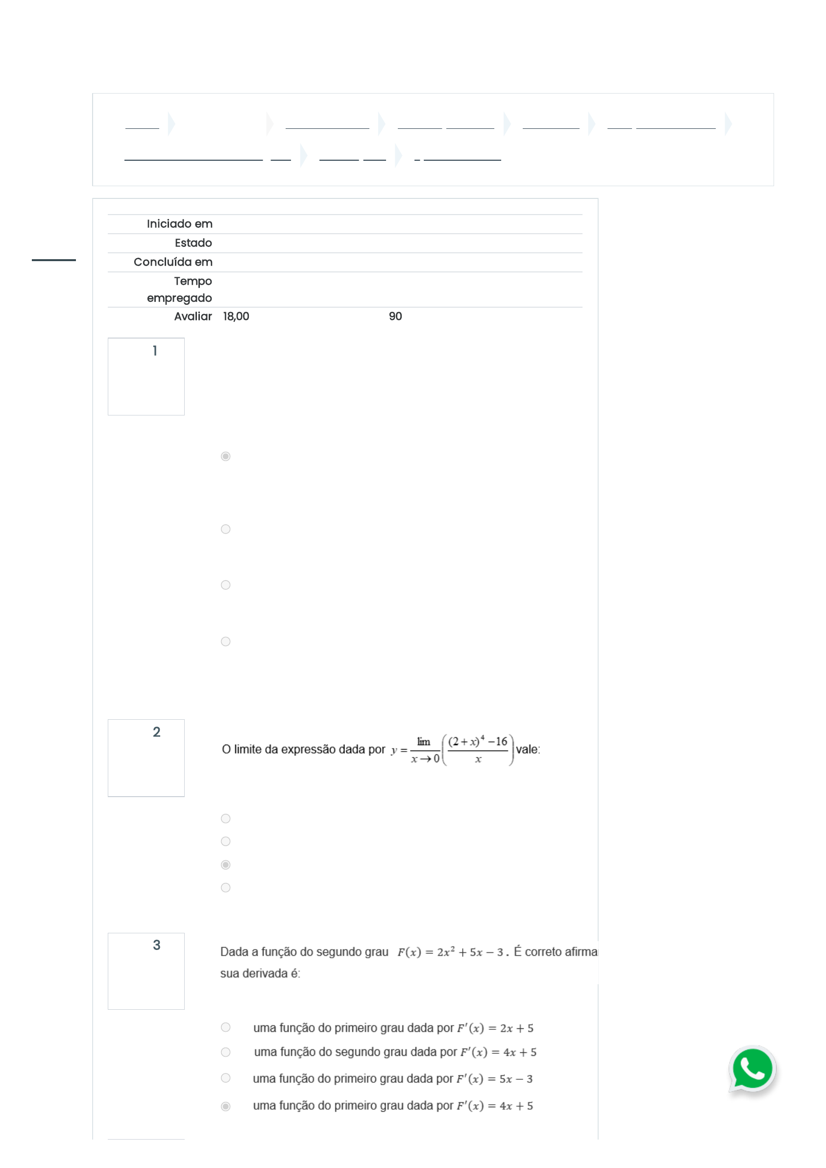 15/04/2022 15:36 QUESTIONÁRIO 1 https://ava.funec.br/mod/quiz/review.php?attempt=119918&cmid=3761 1/4 Painel Meus cursos CURSOS FUNEC Graduação - EAD Aluno EAD JUNÇÕES DE TURMA Cálculo Diferencial e Integral I AVALIAÇÕES QUESTIONÁRIO 1 Questão 1 Completo Atingiu 2,00 de 2,00 Questão 2 Completo Atingiu 2,00 de 2,00 Questão 3 Completo Atingiu 2,00 de 2,00 Iniciado em Wednesday, 21 Apr 2021, 18:28 Estado Finalizada Concluída em Wednesday, 21 Apr 2021, 18:32 Tempo empregado 3 minutos 38 segundos Avaliar 18,00 de um máximo de 20,00(90%) O discriminante de uma função do segundo grau, corresponde aos termos que se encontram dentro do radical da formula de Bháskara. A respeito do estudo dos sinais de uma função do segundo grau, é possível afirmar, com certeza, que: Escolha uma opção: a. Se o valor do discriminante for igual a zero e o coeficiente a for positivo, então todos os pontos dessa função estarão acima do eixo x, exceto pelo vértice que estará sobre esse eixo. b. O valor do discriminante não pode ser usado para determinar a quantidade de raízes reais que uma função do segundo grau possui. c. Se o valor do discriminante for menor que zero, a função possui duas raízes reais e distintas e outras duas raízes complexas. d. Se o valor do discriminante for igual a zero e o coeficiente a for positivo, então todos os pontos dessa função do segundo grau estarão sob o eixo x. Escolha uma opção: a. -32 b. 0 c. 32 d. 23 Escolha uma opção: a. b. c. d. https://ava.funec.br/my/ https://ava.funec.br/course/index.php?categoryid=10 https://ava.funec.br/course/index.php?categoryid=17 https://ava.funec.br/course/index.php?categoryid=19 https://ava.funec.br/course/index.php?categoryid=77 https://ava.funec.br/course/view.php?id=342 https://ava.funec.br/course/view.php?id=342#section-4 https://ava.funec.br/mod/quiz/view.php?id=3761 javascript:void(0); https://ava.funec.br/user/index.php?id=342 https://ava.funec.br/badges/view.php?type=2&id=342 https://ava.funec.br/admin/tool/lp/coursecompetencies.php?courseid=342 https://ava.funec.br/grade/report/index.php?id=342 https://ava.funec.br/my/ https://ava.funec.br/?redirect=0 https://ava.funec.br/calendar/view.php?view=month&course=342 javascript:void(0); https://ava.funec.br/user/files.php https://ava.funec.br/course/view.php?id=324 https://ava.funec.br/course/view.php?id=757 https://ava.funec.br/course/view.php?id=342 https://ava.funec.br/course/view.php?id=624 https://ava.funec.br/course/view.php?id=819 https://ava.funec.br/course/view.php?id=896 https://ava.funec.br/course/view.php?id=488 https://ava.funec.br/course/view.php?id=698 https://ava.funec.br/course/view.php?id=492 https://ava.funec.br/course/view.php?id=485 https://ava.funec.br/my/ 15/04/2022 15:36 QUESTIONÁRIO 1 https://ava.funec.br/mod/quiz/review.php?attempt=119918&cmid=3761 2/4 Questão 4 Completo Atingiu 2,00 de 2,00 Questão 5 Completo Atingiu 2,00 de 2,00 Questão 6 Completo Atingiu 2,00 de 2,00 Questão 7 Completo Atingiu 2,00 de 2,00 Escolha uma opção: a. b. c. d. Escolha uma opção: a. tende a 5 b. y tende a menos infinito c. Tende a zero d. y tende a mais infinito Escolha uma opção: a. – 2,5 b. 3,0 c. 2,5 d. – 3,0 Escolha uma opção: a. f(x) é crescente e g(x) é decrescente. b. Os gráficos de f(x) e g(x) não se interceptam. c. g(– 2) . f(– 1) = f(1) d. f [g(0)] = f(0) javascript:void(0); https://ava.funec.br/user/index.php?id=342 https://ava.funec.br/badges/view.php?type=2&id=342 https://ava.funec.br/admin/tool/lp/coursecompetencies.php?courseid=342 https://ava.funec.br/grade/report/index.php?id=342 https://ava.funec.br/my/ https://ava.funec.br/?redirect=0 https://ava.funec.br/calendar/view.php?view=month&course=342 javascript:void(0); https://ava.funec.br/user/files.php https://ava.funec.br/course/view.php?id=324 https://ava.funec.br/course/view.php?id=757 https://ava.funec.br/course/view.php?id=342 https://ava.funec.br/course/view.php?id=624 https://ava.funec.br/course/view.php?id=819 https://ava.funec.br/course/view.php?id=896 https://ava.funec.br/course/view.php?id=488 https://ava.funec.br/course/view.php?id=698 https://ava.funec.br/course/view.php?id=492 https://ava.funec.br/course/view.php?id=485 https://ava.funec.br/my/ 15/04/2022 15:36 QUESTIONÁRIO 1 https://ava.funec.br/mod/quiz/review.php?attempt=119918&cmid=3761 3/4 Questão 8 Completo Atingiu 0,00 de 2,00 Questão 9 Completo Atingiu 2,00 de 2,00 Questão 10 Completo Atingiu 2,00 de 2,00 Escolha uma opção: a. b. c. d. A função do primeiro grau definida por f (x) = (3 – 2a).x + 2, será crescente quando o valor do termo definido por a na equação for: Escolha uma opção: a. a > 0 b. a > 3/2 c. a < 3/2 d. a = 3/2 Escolha uma opção: a. b. c. d. Manter contato Obter o aplicativo para dispositivos móveis https://www.facebook.com/caratingaunec https://twitter.com/caratingaunec https://download.moodle.org/mobile?version=2019052001.02&lang=pt_br&iosappid=633359593&androidappid=com.moodle.moodlemobile javascript:void(0); https://ava.funec.br/user/index.php?id=342 https://ava.funec.br/badges/view.php?type=2&id=342 https://ava.funec.br/admin/tool/lp/coursecompetencies.php?courseid=342 https://ava.funec.br/grade/report/index.php?id=342 https://ava.funec.br/my/ https://ava.funec.br/?redirect=0 https://ava.funec.br/calendar/view.php?view=month&course=342 javascript:void(0); https://ava.funec.br/user/files.php https://ava.funec.br/course/view.php?id=324 https://ava.funec.br/course/view.php?id=757 https://ava.funec.br/course/view.php?id=342 https://ava.funec.br/course/view.php?id=624 https://ava.funec.br/course/view.php?id=819 https://ava.funec.br/course/view.php?id=896 https://ava.funec.br/course/view.php?id=488 https://ava.funec.br/course/view.php?id=698 https://ava.funec.br/course/view.php?id=492 https://ava.funec.br/course/view.php?id=485 https://ava.funec.br/my/ 15/04/2022 15:36 QUESTIONÁRIO 1 https://ava.funec.br/mod/quiz/review.php?attempt=119918&cmid=3761 4/4 RA 