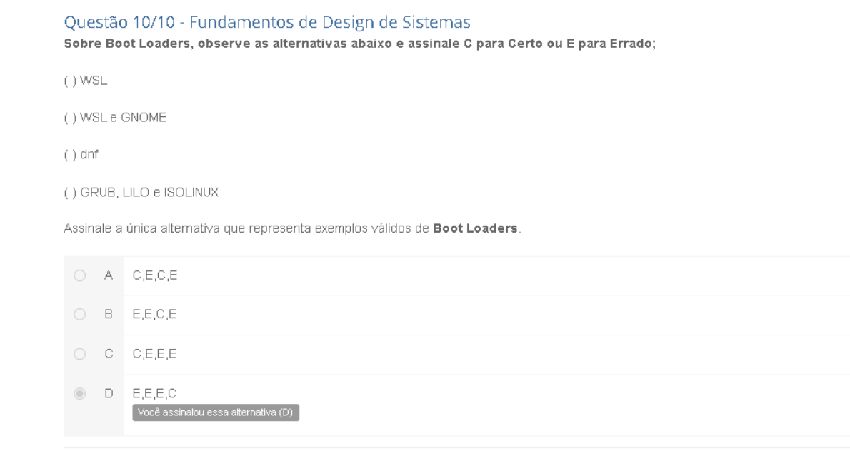 Questão 5/5 - Fundamentos de Design de Sistemas Sobre o processo de boot no Linux: 1) O BIOS é uma parte do sistema operacional. II) GRUB é um boot...