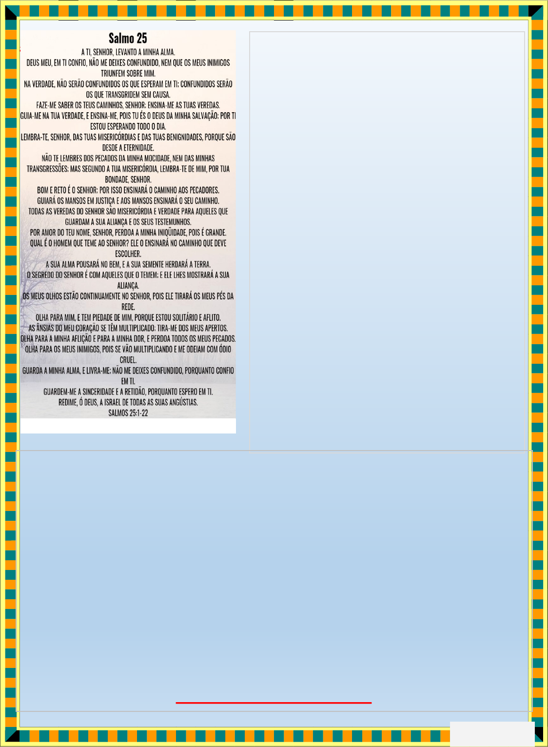 25DEZ2022-BOM DIA: MaurícioSaramago O tom geral desse salmoe é o de súplica da libertação dos inimigos. Temas proeminen- tes são: a aflição, embora es- timule uma sensação de peca- do, a humildade confissão, o perdão pedido, a preservação do pecado, e a direção divina. Confiança na oração; Oração pela remissão dos pecados; e Por ajuda na aflição. Uma oração por Livramento. Volta-te para mim. Usando os verbos (tirar, voltar-se, aliviar, perdoar, considerar, guardar, preservar), o escritor ora pe- dindo que Deus o livre. Canção de Oração e Louvor: Podemos classificar este salmo como de sabedoria. Todas as veredas do SE- NHOR são misericórdia e verdade(10). Elas são manifes- tações do seu amor e fidelidade constante para com aqueles que guardam o seu concerto e os seus testemu- nhos. O grande concerto (berit) feito no Sinai e a reve- lação contínua de Deus na história e seu modo de tra- tar com seu povo testifica sobre a fidelidade de Deus à sua Lei. Em tudo daremos graças !