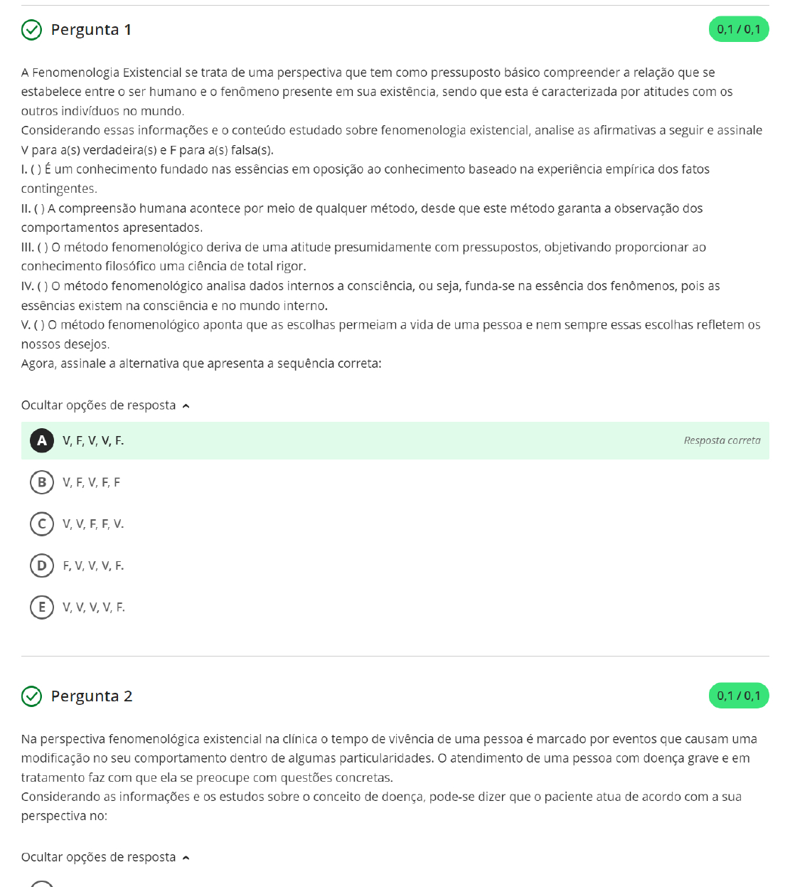 0 Pergunta 1 0,1 /0,1 A Fenomenologia Existencia l se trata de uma perspectiva que tem como pressuposto básico compreender a relação que se estabelece ent re o ser humano e o fenômeno presente em sua existência, sendo que esta é caracterizada por at itudes com os outros indivíduos no mundo. Considerando essas informações e o conteúdo estudado sobre fenomenologia existencial, analise as afirmativas a seguir e assinale V para a(s) verdadeira(s) e F para a(s) falsa(s). 1. () É um conhecimento fundado nas essências em oposição ao conhecimento baseado na experiência empírica dos fatos contingentes. li. () A compreensão humana acontece por meio de qualquer método, desde que este método garanta a observação dos comportamentos apresentados. Ili. () o método fenomenológico deriva de uma atitude presumidamente com pressupostos, objet ivando proporcionar ao conhecimento filosófico uma ciência de total rigor. IV. () o método fenomenológico anal isa dados internos a consciência, ou seja, funda-se na essência dos fenômenos, pois as essências existem na consciência e no mundo interno. V. () o método fenomenológico aponta que as escolhas permeiam a vida de uma pessoa e nem sempre essas escolhas refletem os nossos desejos. Agora, assinale a alternativa que apresenta a sequência correta: Ocultar opções de resposta " o V, F, V, V, F. ® V, F, V, F,F © V, V, F, F, V. ® F, V, V, V, F. © V, V, V, V, F. 0 Pergunta 2 Resposta correta 0,1 / 0,1 Na perspectiva fenomenológica existencial na clínica o tempo de vivência de uma pessoa é marcado por eventos que causam uma modificação no seu comportamento dentro de algumas part icu laridades. o atendimento de uma pessoa com doença grave e em tratamento faz com que ela se preocupe com questões concretas. Considerando as informações e os estudos sobre o conceito de doença, pode-se dizer que o paciente atua de acordo com a sua perspectiva no: Ocultar opções de resposta " r-... ~ passado. © presente prolongado. G futuro. Resposta correta ® passado remoto. © aqui e agora. 0 Pergunta 3 0,1 /0,1 Conforme descrito por Heidegger, o entendimento de que o homem é um ente cujo modo de ser só acontece no comparti lhamento de seu mundo com os outros, ou seja, da compreensão de que ele em nada é separado do mundo que o constitui, o que implica que não há uma identidade anterior ou exterior às experiências relaciona is. Considerando essas informações e o conteúdo estudado sobre a condição de paciente do ser, é correto afi rmar que: Ocultar opções de resposta ,., o quando o paciente responde positivamente à terapia, alcança o autoconhecimento que o leva a se autorrealizar. Resposta correta @ o indivíduo entra em um processo de fantasia que na maioria das vezes é desenvolvida por influência de suas crenças. @ a pessoa tem que se permitir entrar em contato com questões que lhe permitam o livre fluir das ideias. @ existência e psicoterapia são duas situações distintas e necessitam ser olhadas de diferentes formas. (D a psicoterapia dependerá da associação livre de ideias que o paciente irá fazer. 0 Pergunta 4 0,1 /0,1 De acordo com os pressupostos trazidos por Dalgalorrondo (2008), pode-se definir que o campo da psicopatologia aponta que o conceito de "normal" e "patológico" tem por essência uma dificuldade na sua delimitação, pois tais conceitos se encontram dentro de uma visão que sofre influências advindas de um conjunto de crenças e valores de uma determinada sociedade. Fonte: DALGALARRONDO, P. Psicopatologia e semiologia dos transtornos mentais. 2. ed. Porto Alegre: Artmed, 2008. com base nessa referência e considerando os estudos realizados sobre saúde e doença, a diferenciação diagnóstica entre sinais normais e patológicos é mais fácil quando: ocultar opções de resposta ,., @ normal e patológico são termos construídos socialmente. @ normal e patológico devem ser idênticos, facilitando a compreensão. @ as alterações comportamentais são intensas e duradouras. 4:) normal e patológico devem ser olhados dentro de um aspecto subjetivo. (D disfunções comportamentais são breves. Resposta correta 0 Pergunta 5 0,1 /0,1 De acordo com Foucault (2000), um dos precursores ao se falar sobre normal e patológico e sua contribuição serviu para uma importante evolução da humanidade. O autor destaca que os temos "normal e anormal "se definem mediante a execução de um projeto normativo, ou seja, ao mesmo tempo que engendra o anormal (o anormal é condicionado pelo normal), é acionado por ele (o anormal é cond ição do normal)". Fonte: FOUCAULT, M. História da loucura: na Idade clássica. 6. ed. São Paulo. Perspectiva, 2000. Considerando as informações acima e de acordo com os estudos sobre normal e patológico, pode-se considerar que: Ocultar opções de resposta ,._ a análise realizada perante à realidade das pessoas interfere no olhar que se tem sobre a sociedade, que sempre busca uma explicação para o comportamento humano. essa compreensão parte do pressuposto de que o padrão de normalidade é construído dentro de um O contexto histórico e que a sociedade participa dessa construção por meio de pré-conceitos estabelecidos. Resposta correta as concepções de normalidade são interpretadas dentro de um contexto próprio e cada um se comporta de forma individualista, sem que haja qualquer interferência de concepções históricas ou culturais. à medida que um sujeito está inserido em um determinado ambiente, este só reage da forma como é ensinado, podendo ter pouca relevância o que o ajude a seguir de forma diferente daquilo que lhe é atribuído. essa compreensão já é algo pré-determinado e, por isso, está presente na vivência do ser humano que se apresenta com desajustado a maior parte do tempo, merecendo a atenção por parte dos serviços de saúde. 0 Pergunta 6 0,1 / 0,1 De acordo com MAY (2009) a fenomenologia existencialista começa a ser dese