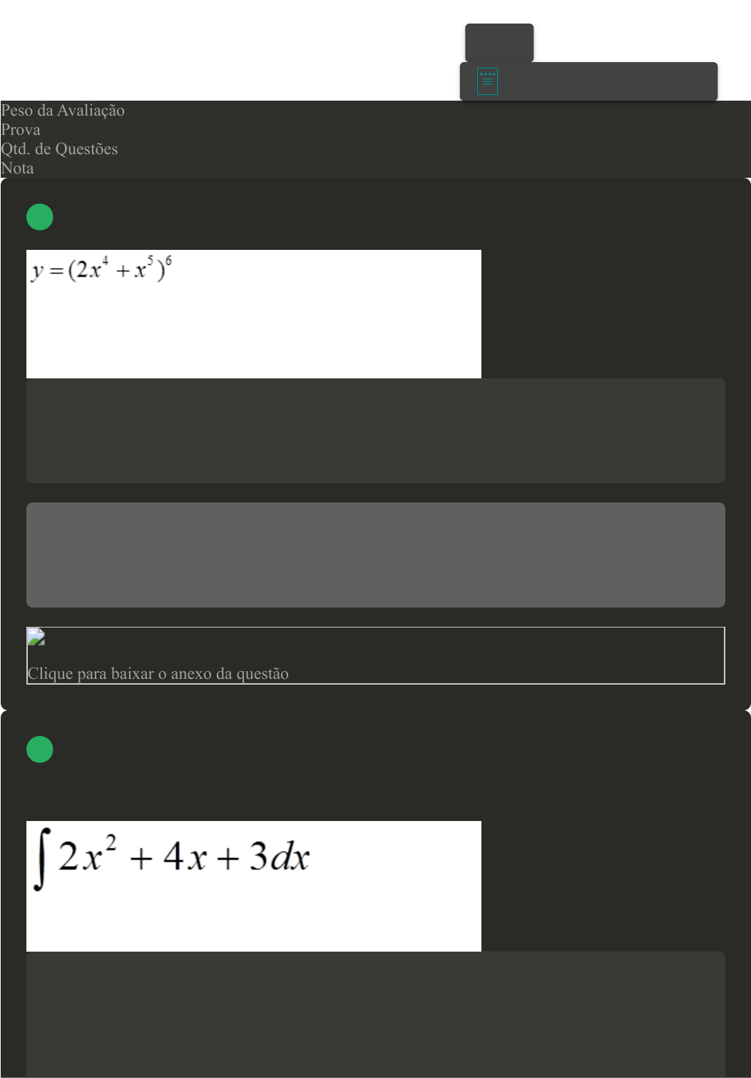18/03/2023, 19:00 Avaliação Final (Discursiva) - Individual FLEX about:blank 1/2 Prova Impressa GABARITO | Avaliação Final (Discursiva) - Individual FLEX (Cod.:513798) Peso da Avaliação 4,00 Prova 17594971 Qtd. de Questões 2 Nota 7,50 A regra da Cadeia é um processo matemático que permite derivar alguns tipos de funções. Desta forma, vamos retomar este processo. Calcule a derivada da função a seguir usando a regra da cadeia: Resposta esperada Resposta conforme figura a seguir: Minha resposta y=u⁶ u=2x⁴+x⁵ 6u⁵.(8x+5) (48x+30).(2x⁴+x⁵)⁵ Formulário - Cálculo Diferencial e Integral (MAD) - Paulo Clique para baixar o anexo da questão Com relação ao conceito de integral, existem várias aplicações que podemos destacar, principalmente na área das engenharias. A relação entre as derivadas e integrais tornou-se uma das ferramentas mais poderosas para analisar diversos fenômenos. O primeiro passo para se construir o conceito de integral é estudar alguns critérios de cálculo. Resolva a integral indefinida a seguir: Resposta esperada VOLTAR A+ Alterar modo de visualização 1 2 18/03/2023, 19:00 Avaliação Final (Discursiva) - Individual FLEX about:blank 2/2 Minha resposta 2x³/3+4x²/2+3x+c 2x³/3+2x²+3x+c Imprimir