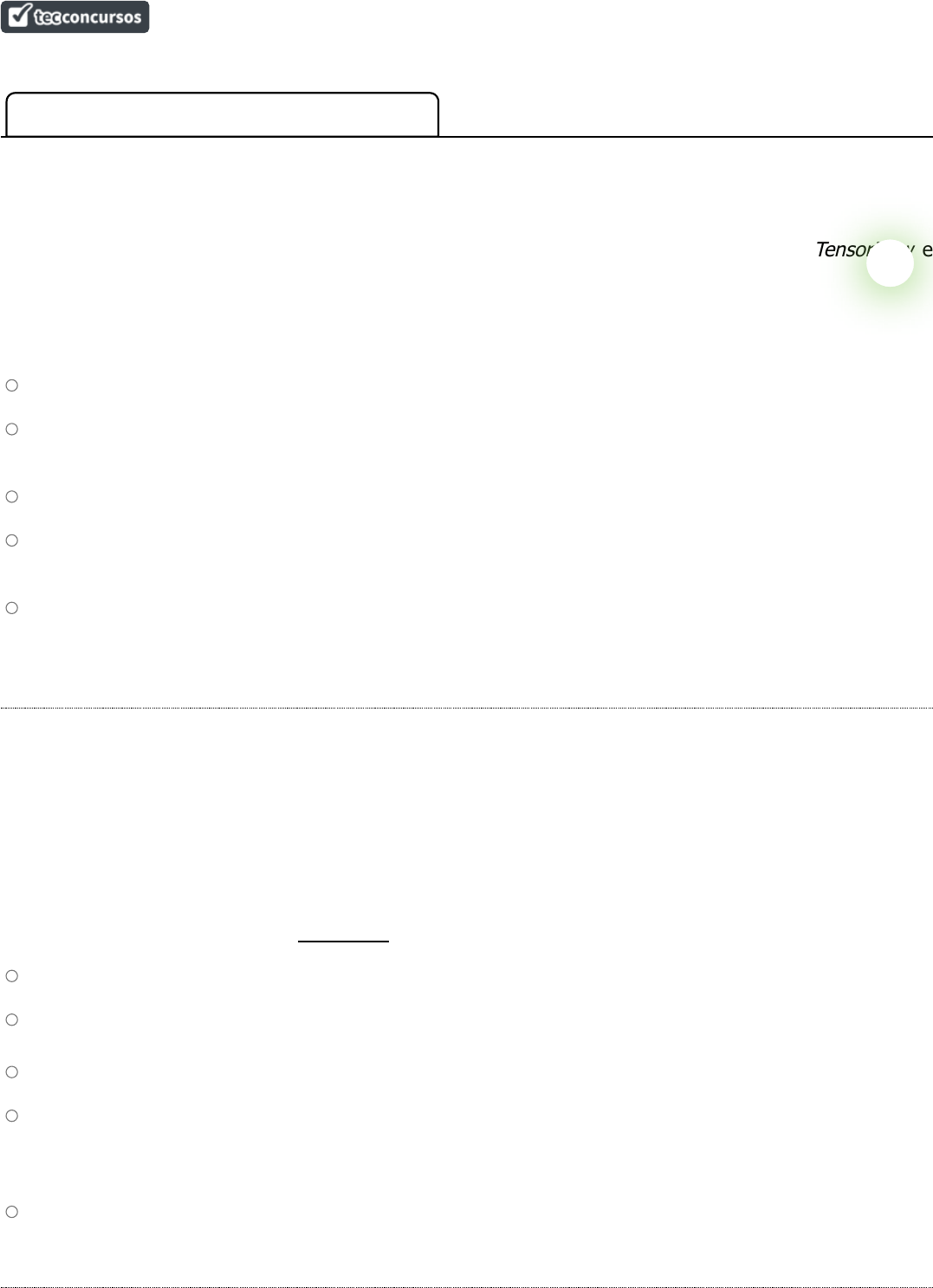 Inteligência Artificial para Fiscal de Tributos Estaduais (SEFAZ MT) 2023 ( https://www.tecconcursos.com.br/s/Q2apFd ) Ordenação: Por Matéria TI - Desenvolvimento de Sistemas Questão 1: FGV - AFRE MG/SEF MG/Tecnologia da Informação/2023 Assunto: Conceitos Iniciais e Gerais de Inteligência Artificial A recente explosão de machine learning e deep learning tornou os tensores populares. TensorFlow e PyTorch são dois frameworks com suporte a API de tensor. Em relação aos tensores, assinale a opção incorreta. a) Tensor representa um array multidimensional junto com operações definidas. b) Os tensores, internamente, são implementados como estruturas de dados leves que mantêm um ponteiro para o armazenamento e outros metadados, como tamanho e forma. c) Os próprios dados do tensor são armazenados em um buffer contíguo. d) Utilizar um buffer contíguo permite que vários tensores compartilhem os mesmos dados, mas forneçam diferentes visualizações. e) Quando os tensores têm dimensões diferentes, certas operações não podem ser realizadas sem primeiro colocar os tensores nas mesmas dimensões, para isso possuem a operação automática denominada replicação. Esta questão possui comentário do professor no site. www.tecconcursos.com.br/questoes/2266853 Questão 2: FGV - AFRE MG/SEF MG/Tecnologia da Informação/2023 Assunto: Conceitos Iniciais e Gerais de Inteligência Artificial As opções a seguir descrevem os passos de uma técnica genérica de deduplicação. A entrada é um novo bloco de dados (chunk) de um arquivo “DC” e a saída é um bloco de dados se é encontrado. A esse respeito, assinale a opção incorreta. a) Obtenha o novo bloco de dados do arquivo DC a ser armazenado. b) Identifique o formato de um bloco de dados DC e o divida em objetos (fixos ou variáveis). Assim, DC= {dc1, dc2, ..., dcn}, onde dc1, dc2, ..., dcn são objetos. c) Determine o valor hash ou o fingerprint. Assim, hv(DC) é o novo bloco de dados do arquivo DC. d) Combine o valor hash de um novo bloco de dados hv(DC) com os valores hash anteriores ou existentes {hv1,hv2,..,hvn} no armazenamento ou memória, {hv1,hv2,..,hvn} são valores hash de blocos de dados já armazenados. e) Atualize o bloco de dados, se houver uma correspondência. Caso contrário, armazene o novo bloco de dados na memória e mantenha o novo índice. Esta questão possui comentário do professor no site. www.tecconcursos.com.br/questoes/2266855 Questão 3: CEBRASPE (CESPE) - AAAJ (DP DF)/DP DF/Informática Banco de Dados/2022 Assunto: Conceitos Iniciais e Gerais de Inteligência Artificial Julgue o item subsequente, a respeito de inteligência artificial. A inteligência artificial geralmente se enquadra em duas categorias abrangentes: narrow AI, às vezes referida como weak AI, que é uma simulação da inteligência humana e opera dentro de um contexto limitado; e AGI (artificial general intelligence), que é uma máquina com inteligência geral e, assim como um ser humano, pode aplicar essa inteligência para resolver qualquer problema. Certo Errado Esta questão possui comentário do professor no site. www.tecconcursos.com.br/questoes/1970721 Questão 4: CEBRASPE (CESPE) - AAAJ (DP DF)/DP DF/Informática Banco de Dados/2022 Assunto: Conceitos Iniciais e Gerais de Inteligência Artificial Julgue o item subsequente, a respeito de inteligência artificial. Computação cognitiva, um subcampo da inteligência artificial, refere-se à computação que se concentra no raciocínio e na compreensão em alto nível, sendo análoga à cognição, à lógica e ao julgamento humanos. Certo Errado Esta questão possui comentário do professor no site. www.tecconcursos.com.br/questoes/1970723 Questão 5: FGV - ATIFE (Sefaz AM)/SEFAZ AM/2022 Assunto: Conceitos Iniciais e Gerais de Inteligência Artificial A respeito do Robotic Process Automation (RPA), assinale a afirmativa correta. a) Possui baixa precisão nos resultados. b) Executa tarefas humanas de rotina. c) Realiza tarefas desde que envolva cálculos. d) Necessita de customização para interagir com outros sistemas. e) Dispensa a utilização de controlroom (sala de controle). Esta questão possui comentário do professor no site. www.tecconcursos.com.br/questoes/1989837 Questão 6: CEBRASPE (CESPE) - Esc Pol (PC PB)/PC PB/2022 Assunto: Conceitos Iniciais e Gerais de Inteligência Artificial A capacidade de um agente computacional de alterar o próprio comportamento com base em situações anteriores é chamada de a) autonomia. b) cooperatividade. c) inteligência. d) aprendizagem. e) proatividade. Esta questão possui comentário do professor no site. www.tecconcursos.com.br/questoes/2013082 Questão 7: DIRENS Aeronáutica - EAOAp (CIAAR)/CIAAR/Análise de Sistemas/2022 Assunto: Conceitos Iniciais e Gerais de Inteligência Artificial Informe Verdadeiro (V) ou Falso (F) em relação às seguintes afirmativas abaixo. Em seguida marque a opção que apresenta a sequência correta: ( ) As abordagens de redução de dados vertical conhecidas como Filter realizam a seleção de atributos sem considerar o algoritmo de mineração de dados que será utilizado aos atributos selecionados. Por outro lado, as abordagens conhecidas como Wrapper experimentam o algoritmo de mineração de dados para cada conjunto selecionado, avaliando os resultados obtidos. ( ) Os algoritmos de clusterização e classificação automática visam modelar os dados utilizando padrões locais enquanto que algoritmos de regras de associação procuram modelar os dados utilizando padrões globais. ( ) São exemplos de métodos de clusterização: k-means, k-Modes, k-medoids e BIRCH ( ) São exemplos de métodos de descoberta de sequencias: GSP, CART, MSDD, SPADE a) (F); (V); (F); (V). b) (F); (V); (V); (F). c) (V); (F); (F); (V). d) (V); (F); (V); (F). Esta questão possui comentário do professor no site. www.tecconcursos.com.br/questoes/2058686 Questão 8: QUADRIX - Ana Sis I (CRA PR)/CRA PR/2022 A