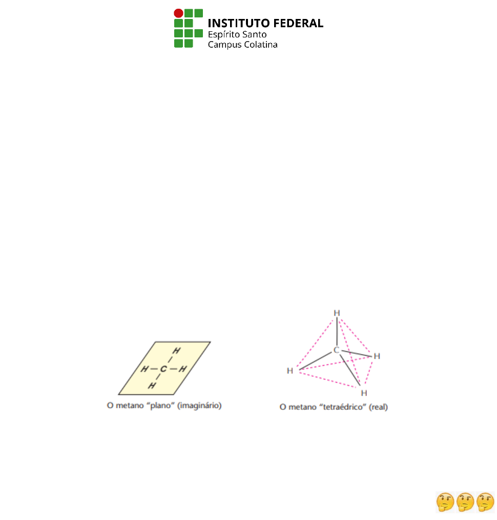 QUÍMICA III - Profª Silvana TEORIA DA HIBRIDIZAÇÃO O carbono, possui número atômico 6, pertence à família 4 A ou 14, sua camada de valência possui quatro elétrons e faz quatro ligações covalentes para que fique estável, já que segundo a Teoria Eletrônica da Valência, que foi proposta por Gilbert N. Lewis e Walter Kossel, os elétrons de valência (elétrons da última camada) são compartilhados para formar as ligações covalentes entre os átomos. Segundo Kekulé, as quatro valências do carbono estariam situadas num mesmo plano. Mas, Le Bel e Van´t Hoff introduziram a ideia do carbono tetraédrico, dizendo que o átomo de carbono ocupa o centro de um tetraedro regular imaginário e dirige suas valências para os quatro vértices desse tetraedro. No entanto, para ambos, as quatro valências e as quatro ligações feitas pelo carbono no metano (CH4) seriam iguais. Mas como isso é possível, se o carbono apresenta distribuição eletrônica 1s2 2 s2 2p2, com metade dos seus elétrons de valência em um orbital do tipo s e a outra metade em orbitais do tipo p? Para entender isso, é preciso conhecer uma Teoria posterior a de Lewis e Kossel: a Teoria da Ligação de Valência (TLV), que diz que as ligações entre os átomos são formadas pela sobreposição de orbitais atômicos e um par de elétrons de spins opostos situado entre um par de átomos constitui uma ligação. Essa Teoria é a primeira descrição sobre ligações covalentes que levou em consideração os orbitais atômicos e que permite o cálculo numérico dos ângulos e dos comprimentos de ligação. Ela foi desenvolvida por Walter Heitler, Fritz London, John Slater e Linus Pauling. Para formar a ligação os átomos se aproximam e seus orbitais se sobrepõem (como nos exemplos da figura abaixo), de modo que na ligação, as forças de atração entre os núcleos e os elétrons equilibram-se às forças repulsivas (núcleo-núcleo, elétron-elétron) e a energia potencial é mínima. No entanto, isso ainda não explica como o carbono consegue formar ligações iguais estando seus elétrons de valência em orbitais diferentes e o orbital 2s completo. Para entender isso, temos uma outra teoria proposta por Pauling, que é a Teoria da Hibridização dos Orbitais. Segundo a teoria de Pauling, um novo conjunto de orbitais, chamado orbitais híbridos, pode ser criado pela mistura de orbitais s, p e d de um átomo e ocorrem como uma preparação para a formação da ligação covalente. Esses orbitais têm energias próximas e os elétrons dos orbitais de menor energia podem ser promovidos aos orbitais de energia maior. Os elétrons não ligantes continuam como pares isolados mesmo após a hibridização e o número de orbitais híbridos é sempre o mesmo que o número de orbitais atômicos que são mesclados para criar o conjunto de orbitais híbridos. É o que ocorre no carbono e em outros elementos como oxigênio e nitrogênio, por exemplo. Orbitais híbridos sp3 do carbono A diferença entre os níveis de energia dos orbitais 2s e 2p é pequena e ocorre a promoção do elétron 2s para o orbital 2p que está vazio. Assim o carbono passa a ter quatro elétrons desemparelhados, sendo, portanto, capaz de fazer quatro ligações: O orbital s em da camada de valência é combinado com os três orbitais p, resultam quatro orbitais híbridos cada um chamado de sp3. Eles possuem a mesma energia, sendo esta menor que a dos orbitais p e maior que a do orbital s. O ângulo entre os orbitais híbridos é de 109,47°, que a maior distância possível para que a repulsão entre os elétrons seja minimizada, e o carbono ocupa o centro de um tetraedro e os átomos ligantes ocupam seus vértices. As quatro ligações que se estabelecem são chamadas de sigma (σ). CH4 CH3-CH3 Orbitais híbridos sp2 Apenas três elétrons da camada de valência do carbono se rearrumaram, dando origem a três orbitais híbridos, denominados sp2, equivalentes entre si, situados num mesmo plano e separados entre si por ângulos de 120° (daí o nome de hibridação trigonal plana). A aproximação entre dois carbonos hibridados sp2 leva à formação da ligação sigma por meio da superposição frontal entre um orbital sp2 de cada átomo, enquanto a interpenetração lateral entre o orbital p de cada átomo resulta na ligação pi (π). Ou seja, carbonos sp2 fazem ligação dupla, e as duas ligações que a constituem não são equivalentes entre si: • uma das ligações — chamada de ligação σ (sigma) — é mais “forte”, uma vez que exige 348 kJ/mol para ser quebrada (no caso do CH2=CH2); • a outra ligação — chamada de ligação π (pi) — é mais “fraca”, pois exige apenas 267 kJ/mol para ser rompida (no caso do CH2=CH2). Elétrons de ligações permanecem mais longe do eixo central entre os átomos que formam também uma ligação . Por isso, são mais fracamente atraídos pelos núcleos dos átomos em questão e a ligação π que será quebrada com mais facilidade nas reações. - Interação frontal entre os orbitais híbridos sp2 (azul) dos carbonos uma ligação sigma (). - Interação lateral entre os orbitais não híbridos p (rosa) dos carbonos uma ligação pi (π). Outro fato importante a ser considerado é que, ao contrário da ligação simples, a ligação dupla não permite a rotação dos dois átomos de carbono da molécula em torno do eixo que os une. Orbitais híbridos sp Apenas dois elétrons da camada de valência do carbono se rearrumaram, dando origem a dois orbitais híbridos, denominados sp, equivalentes entre si, situados num mesmo plano e separados entre si por um ângulo de 180° (daí o nome de hibridação linear). A aproximação entre dois carbonos hibridados sp leva à formação da ligação sigma por meio da superposição frontal entre um orbital sp de cada átomo, enquanto a interpenetração lateral entre os orbitais 2 p resulta em duas ligações pi (π) perpendiculares entre si. Ou