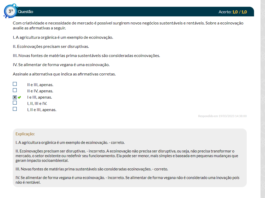Com criatividade e necessidade de mercado é possível surgirem novos negócios sustentáveis e rentáveis. Sobre a ecoinovação avalie as afirmativas a seguir. Assinale a alternativa que indica as afirmativas corretas. I. A agricultura orgânica é um exemplo de ecoinovação. II. Ecoinovações precisam ser disruptivas. III. Novas fontes de matérias prima sustentáveis são consideradas ecoinovações. IV. Se alimentar de forma vegana é uma ecoinovação. e III. apenas. e IV, apenas. e III. apenas. I. II. III e IV. I. II e III. apenas.
