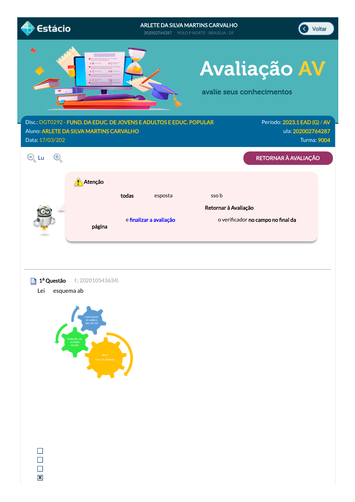 17/03/2023 EPS https://ead.estacio.br/alunos/ 1/5 ARLETE DA SILVA MARTINS CARVALHO Avaliação AV 202002764287 POLO P NORTE - BRASÍLIA - DF avalie seus conhecimentos Disc.: DGT0292 - FUND. DA EDUC. DE JOVENS E ADULTOS E EDUC. POPULAR Período: 2023.1 EAD (G) / AV Aluno: ARLETE DA SILVA MARTINS CARVALHO Matrícula: 202002764287 Data: 17/03/2023 21:59:58 Turma: 9004 Lupa RETORNAR À AVALIAÇÃO 1a Questão (Ref.: 202010543634) Leia o esquema abaixo. Legenda: Em azul: Crescimento do Público alvo do EJA Em verde: Produção da exclusão escolar Em laranja: BNCC: foco no resultado Podemos dizer que o funcionamento da engrenagem acima: No texto da EJA presente na BNCC. Pelo currículo da EJA que ignora a BNCC. É alimentado pela concepção de educação espiralada da BNCC. Educação de Jovens e Adultos que insere os alunos em suas salas de aula pautada nos resultados e nas Atenção 1. Veja abaixo, todas as suas respostas gravadas no nosso banco de dados. 2. Caso você queira voltar à prova clique no botão "Retornar à Avaliação". 3. Não esqueça de �nalizar a avaliação colocando o código veri�cador no campo no �nal da página. javascript:voltar_avaliacoes() javascript:diminui(); javascript:aumenta(); javascript:alert('C%C3%B3digo da quest%C3%A3o: 7702919\n\nStatus da quest%C3%A3o: Liberada para Uso.'); javascript:ir_finalizar(); 17/03/2023 EPS https://ead.estacio.br/alunos/ 2/5 avaliações externas. Pela falta de leitura das instituições da EJA da BNCC. 2a Questão (Ref.: 202008897236) Observe o esquema abaixo: I. Essa ilustração reforça a valorização da diversidade. II. A diversidade não pode ser pautada na subjetividade. III. A escuta é algo primordial da EJA, ouvir e entender os diferentes lugares. IV. Generalizar é sempre importante. Podemos dizer que as opções corretas são: II e III II e IV I e II I e III IV e III 3a Questão (Ref.: 202006932978) Em 1947, o Governo Federal empreendeu a primeira grande iniciativa nacional e massiva, voltada ao problema do analfabetismo entre adolescentes e adultos. Tendo como base o conteúdo do recorte acima, considere as seguintes a�rmativas: I - A visão que se tinha do analfabeto, à época, era de um sujeito cujos saberes e conhecimentos eram reconhecidos e respeitados como principal ponto de partida do processo pedagógico. II - Os analfabetos eram vistos como incapazes e marginais, psicológica e socialmente infantilizados. III - Havia um sentimento de que a salvação do País e o resgate da condição humana dos analfabetos era obra da ação educacional. IV - Nos princípios pedagógicos da campanha, a condição do analfabeto não signi�cava que este fosse "inferior" em comparação com os escolarizados, mas que, suas diferenças apenas se davam em termos de serem portadores de saberes distintos. Em relação ao exposto, estão corretas as a�rmativas: II e III. III e IV. I e IV. javascript:alert('C%C3%B3digo da quest%C3%A3o: 6056521\n\nStatus da quest%C3%A3o: Liberada para Uso.'); javascript:alert('C%C3%B3digo da quest%C3%A3o: 4092263\n\nStatus da quest%C3%A3o: Liberada para Uso.'); 17/03/2023 EPS https://ead.estacio.br/alunos/ 3/5 I e II. I e III. 4a Questão (Ref.: 202006918077) (Prefeitura Municipal de Senador Eloi de Souza/2014) Segundo dados o�ciais, os índices de distorção idade- série nos anos �nais do ensino fundamental no Rio Grande do Norte chegam a 41%, ou seja, em cada 100 alunos, 41 estão com atraso de dois anos ou mais. Diante desse fenômeno, a ação dos gestores tende a ser matricular esse contingente de estudantes na Educação de Jovens e Adultos - EJA. Essa atitude dos gestores revela: Uma compreensão adequada da legislação educacional brasileira sobre a EJA, na medida em que protege os educandos da exclusão, integrando-os ao sistema do Ensino Supletivo vigente. Um equívoco profundo, pois classes de aceleração e educação de jovens e adultos são categorias distintas na organização do trabalho pedagógico. Um processo de falta de conhecimento sobre o EJA e sua História, a�nal estamos em um momento de ampliação da demanda desta modalidade. Uma coerência com as determinações das Diretrizes Curriculares Nacionais, que orientam a que a EJA seja o principal mecanismo de correção de �uxos da educação básica nesses casos. Um equívoco decorrente da falta de conhecimento da legislação educacional brasileira, que aponta que somente estudantes a partir de 21 anos deveriam ser matriculados na EJA. 5a Questão (Ref.: 202007002046) Em "A Pedagogia da Esperança: um reencontro com a Pedagogia do Oprimido", publicado em 1992 Freire a�rma que: Diante de novos métodos, a educação bancária foi, de�nitivamente, extinta. A pós-modernidade é conservadora e é dever da educação manter e reproduzir esse conservadorismo Educação e política não se misturam, pois uma é a antítese da outra. Uma defesa da tolerância não se confunde com a conivência. É possível educar de forma mecânica. 6a Questão (Ref.: 202010653429) A condição de analfabetismo para o jovem e o adulto, inseridos numa sociedade letrada onde o código escrito ocupa lugar de privilégio e poder, oferece su�cientes elementos para localizarmos onde esses indivíduos se encontram socialmente. Sobre a questão do analfabetismo no Brasil, em uma perspectiva freiriana, assinale a opção correta: O analfabetismo de uma nação revela a incapacidade intelectual, o baixo desempenho e a falta de esforço de sua população. O adulto e jovem quando se encontram à margem de uma escolaridade básica é aprisionado por uma teia de privações e exclusões em diferentes âmbitos de sua vida. A causa dos grandes índices de analfabetismo e da baixa escolaridade da juventude está nos próprios jovens e adultos, que se dedicam pouco e apresentam, com frequência, baixo nível intelectual e cognitivo. O baixo índice de analfabetismo no Brasil é consequência das políticas educacionais que, ao longo d