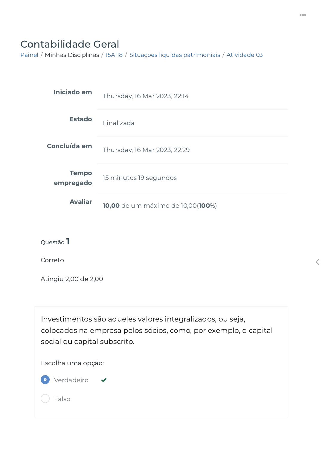 16/03/2023, 22:30 Atividade 03 https://ava.politecnicabr.com.br/mod/quiz/review.php?attempt=4564078 1/4 Painel / Minhas Disciplinas / 15A118 / Situações líquidas patrimoniais / Atividade 03 Contabilidade Geral Iniciado em Thursday, 16 Mar 2023, 22:14 Estado Finalizada Concluída em Thursday, 16 Mar 2023, 22:29 Tempo empregado 15 minutos 19 segundos Avaliar 10,00 de um máximo de 10,00(100%) Questão 1 Correto Atingiu 2,00 de 2,00 Investimentos são aqueles valores integralizados, ou seja, colocados na empresa pelos sócios, como, por exemplo, o capital social ou capital subscrito. Escolha uma opção: Verdadeiro Falso https://ava.politecnicabr.com.br/my/ https://ava.politecnicabr.com.br/course/view.php?id=877 https://ava.politecnicabr.com.br/course/view.php?id=877#section-4 https://ava.politecnicabr.com.br/mod/quiz/view.php?id=23889 https://ava.politecnicabr.com.br/ 16/03/2023, 22:30 Atividade 03 https://ava.politecnicabr.com.br/mod/quiz/review.php?attempt=4564078 2/4 Questão 2 Correto Atingiu 2,00 de 2,00 As fontes do Patrimônio Líquido podem ser baseadas nas seguintes origens: Lucros e Capital Social. Escolha uma opção: Questão 3 Correto Atingiu 2,00 de 2,00 Capital realizado é a parte do capital subscrito ainda não realizada, pode ser conhecido também como capital a subscrever ou a integralizar. Escolha uma opção: Verdadeiro Falso Verdadeiro Falso https://ava.politecnicabr.com.br/ 16/03/2023, 22:30 Atividade 03 https://ava.politecnicabr.com.br/mod/quiz/review.php?attempt=4564078 3/4 Questão 4 Correto Atingiu 2,00 de 2,00 Capital social ou Capital subscrito – é aquele capital estabelecido no contrato social ou no estatuto (no caso das sociedades anônimas). Escolha uma opção: Questão 5 Correto Atingiu 2,00 de 2,00 A situação patrimonial apresenta mais bens e direitos do que obrigações, mais obrigações que bens e direitos ou, ainda, apresentando ativo e passivo iguais. Escolha uma opção: Verdadeiro Falso Verdadeiro Falso Entre em Contato Links Úteis https://ava.politecnicabr.com.br/ 16/03/2023, 22:30 Atividade 03 https://ava.politecnicabr.com.br/mod/quiz/review.php?attempt=4564078 4/4 © 2022 - Escola Politécnica Brasileira https://www.politecnicabr.com.br 0800 084 2627 0800 084 2627 Dicas da nossa Diretora Acadêmica Planner de Estudos Declaração de Matrícula Orientações do AVA Abertura de Ticket Fale com o Tutor Cronograma de Estudos Manual de Estágio Manual de Competência Siga-nos nas redes sociais https://ava.politecnicabr.com.br/mod/quiz/0 https://www.politecnicabr.com.br/ https://soundcloud.com/user-501638417/sets/escola-politecnica-brasileira https://storage.googleapis.com/sirius-pubstore/semestre_plannerdeestudo%20poli.pdf https://storage.googleapis.com/sirius-pubstore/declaracao_matricula.pdf https://storage.googleapis.com/sirius-pubstore/orientacoes_ava.pdf https://storage.googleapis.com/sirius-pubstore/abertura_ticket.pdf https://storage.googleapis.com/sirius-pubstore/fale_com_tutor.pdf https://storage.googleapis.com/sirius-pubstore/cronograma_estudos.pdf https://storage.googleapis.com/sirius-pubstore/manual_estagio.pdf https://storage.googleapis.com/sirius-pubstore/manual_competencia.pdf https://www.facebook.com/politecnicabr https://www.instagram.com/politecnicabr_oficial https://ava.politecnicabr.com.br/